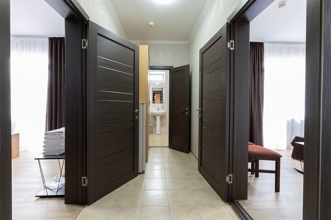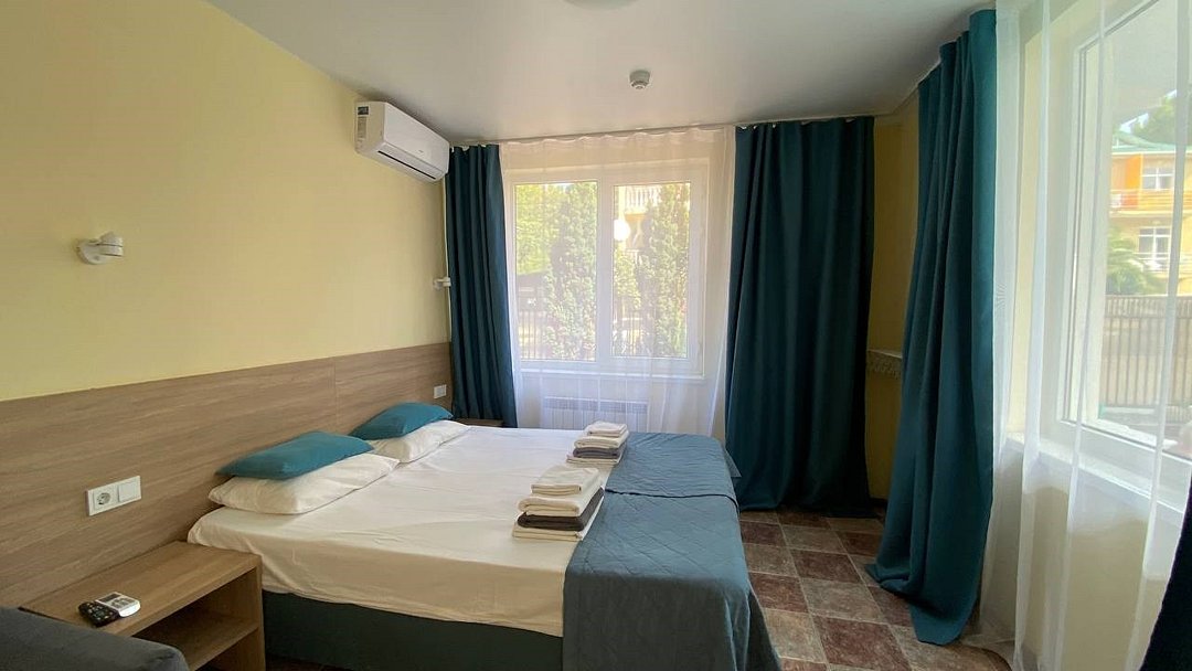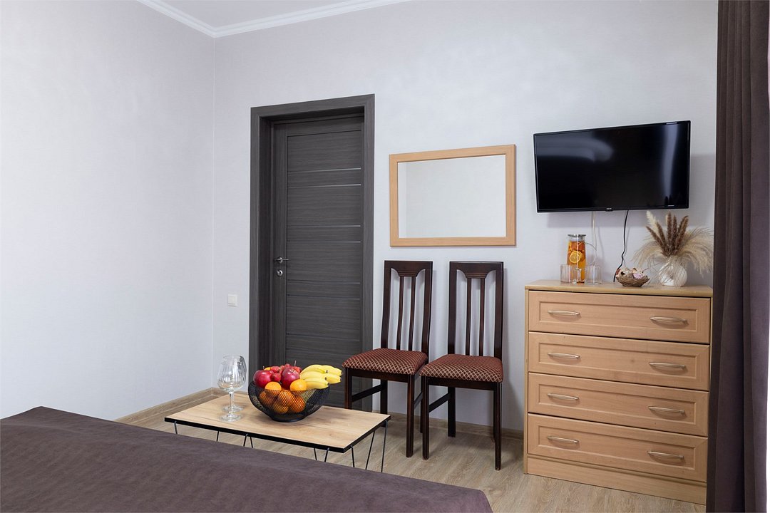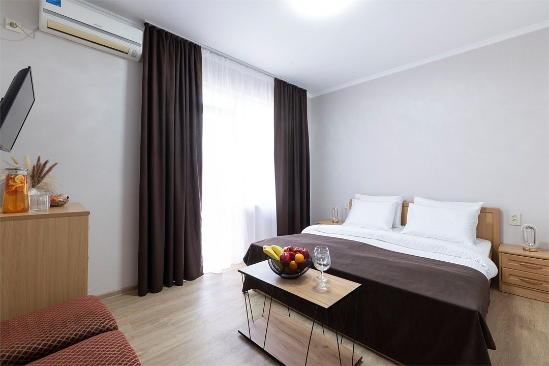 Двухкомнатный семейный номер Комфортный и просторный вариант для отличного отдыха. Площадь номера: 35 кв.м. Располагается на 1 этаже. Максимальное количество гостей: 4 взрослых + ребёнок до 3-х лет бесплатно на одной кровати с родителями. Оснащение номера: - двуспальная кровать + две односпальных кровати - четыре прикроватные тумбочки, шкаф для одежды, комод, зеркало, журнальный столик - два телевизора, холодильник, два кондиционера, фен - вид во двор/на улицу - полностью оборудованная ванная комната: душ, туалет, тапочки, набор полотенец, халат, туалетно - косметические принадлежности (мыло, шампунь, гель для душа, туалетная бумага).Услуги и удобства