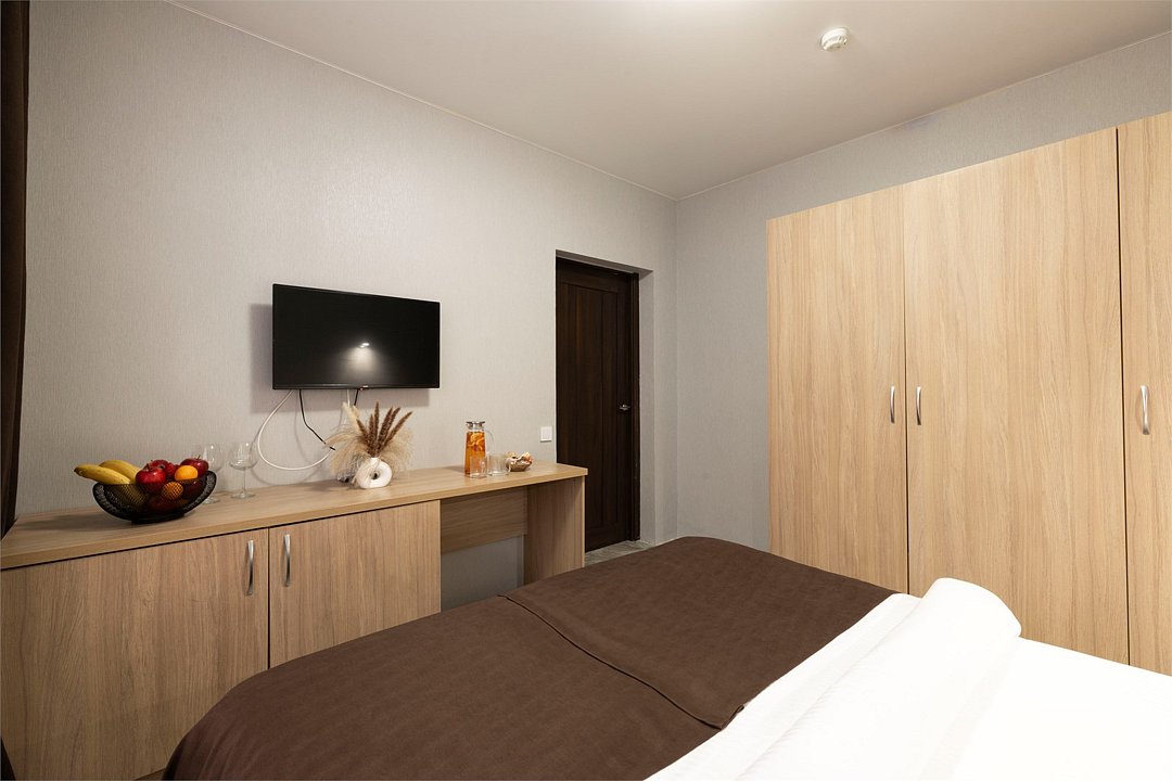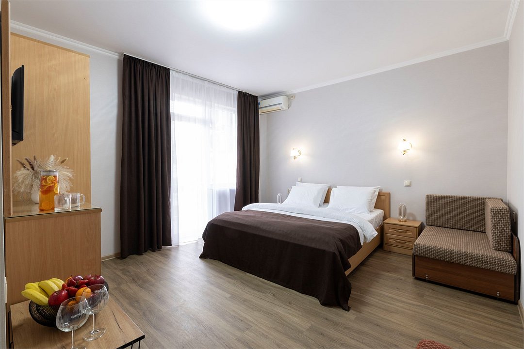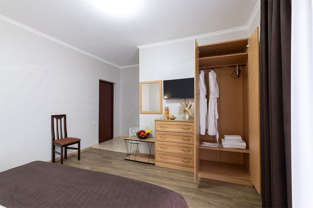 Wi-Fi, холодильник, фен, ванная комната, халаты, банные полотенца, тапочки, кровать «King size», тумбы, стулья, шкаф для одежды, вешалки, зеркало, комод, унитаз, раковина, душ, кресло, вид во двор, стол, туалетные средства, сплит-система, телевизор с плоским экраном, номер для некурящих, мыло, без питомцевВ гостиничном номере