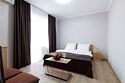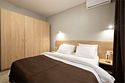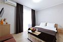 Просторный однокомнатный номер с одной двуспальной кроватью, раскладным и креслом. Без балкона.