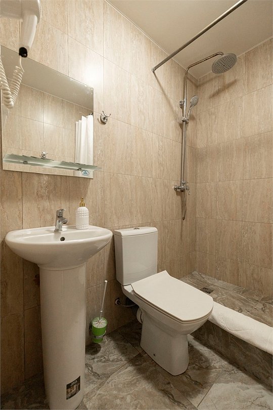 два телевизора, Wi-Fi, фен, ванная комната, халаты, банные полотенца, тапочки, балкон, двуспальная кровать, две односпальные кровати, тумбы, шкаф для одежды, журнальный столик, зеркало, комод, унитаз, раковина, душ, вид на город, вид во двор, туалетные средства, сплит-система, мини-холодильник, номер для некурящих, вешалки-плечики, мыло, без питомцевВ гостиничном номере