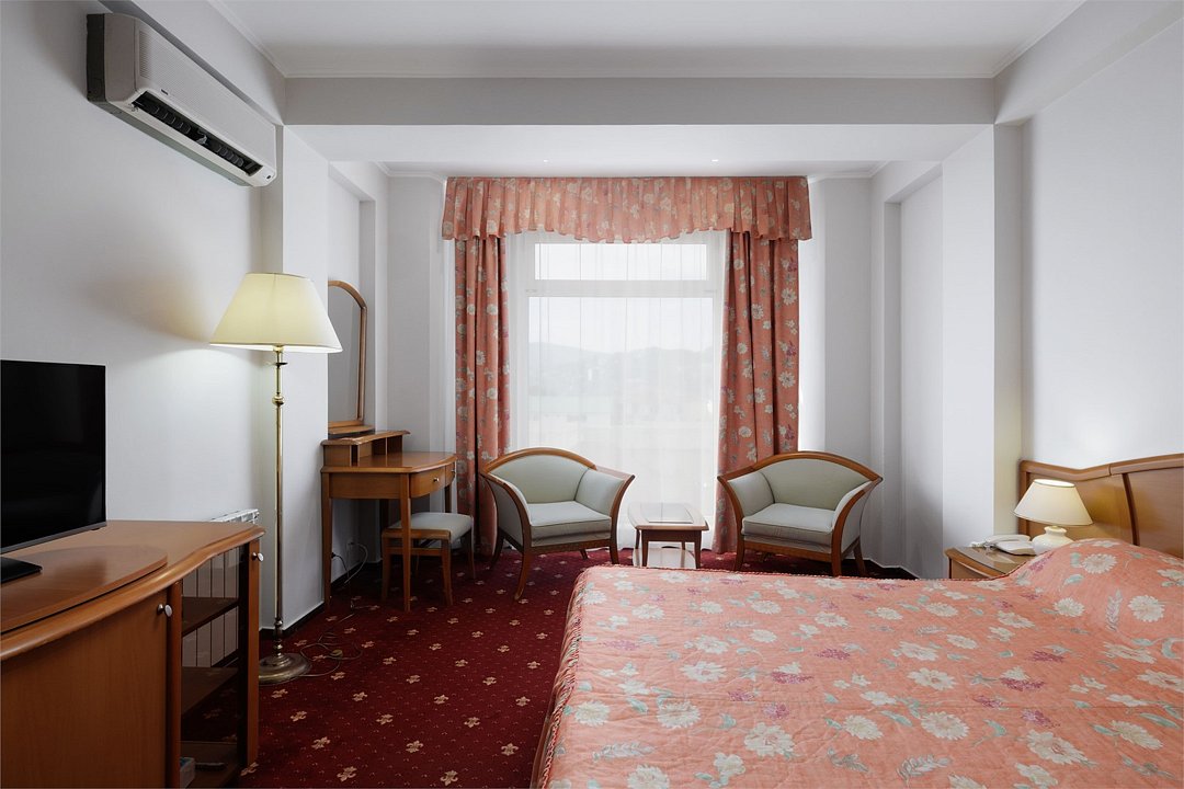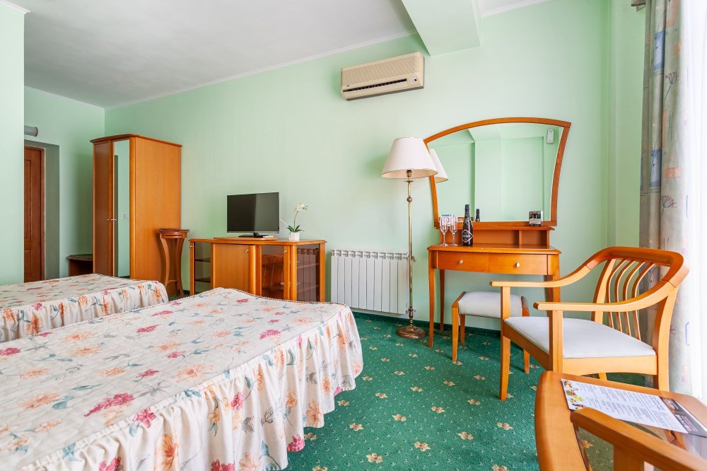 Комфортный однокомнатный номер общей площадью 26 кв. м с возможностью размещения двух человек. Спальные места – две односпальные кровати/одна двуспальная кровать. В любом номере Стандарт возможен заказ одного дополнительного места. В номере: холодильник-бар; сплит-система; Wi-Fi; LCD телевизор с кабельным телевидением; электронный сейф-бокс; телефон; ванная комната с ванной или душевой кабиной; фен и косметические принадлежности; халат и тапочки. При заселении с гостей взимается возвратный депозит - 5000 рублей. Питание по системе "Шведский стол" проходит в ресторане "Миндаль" (отдельно стоящее от жилых корпусов здание).Услуги и удобства