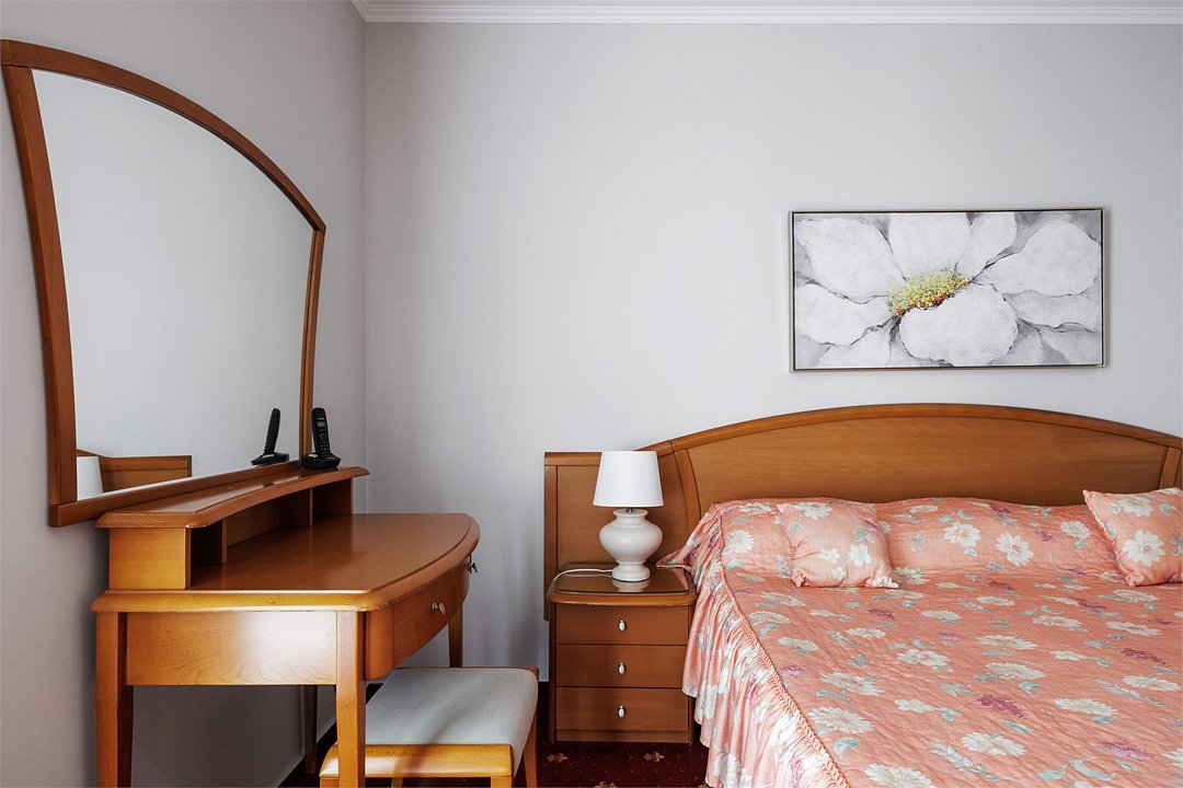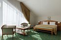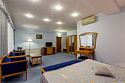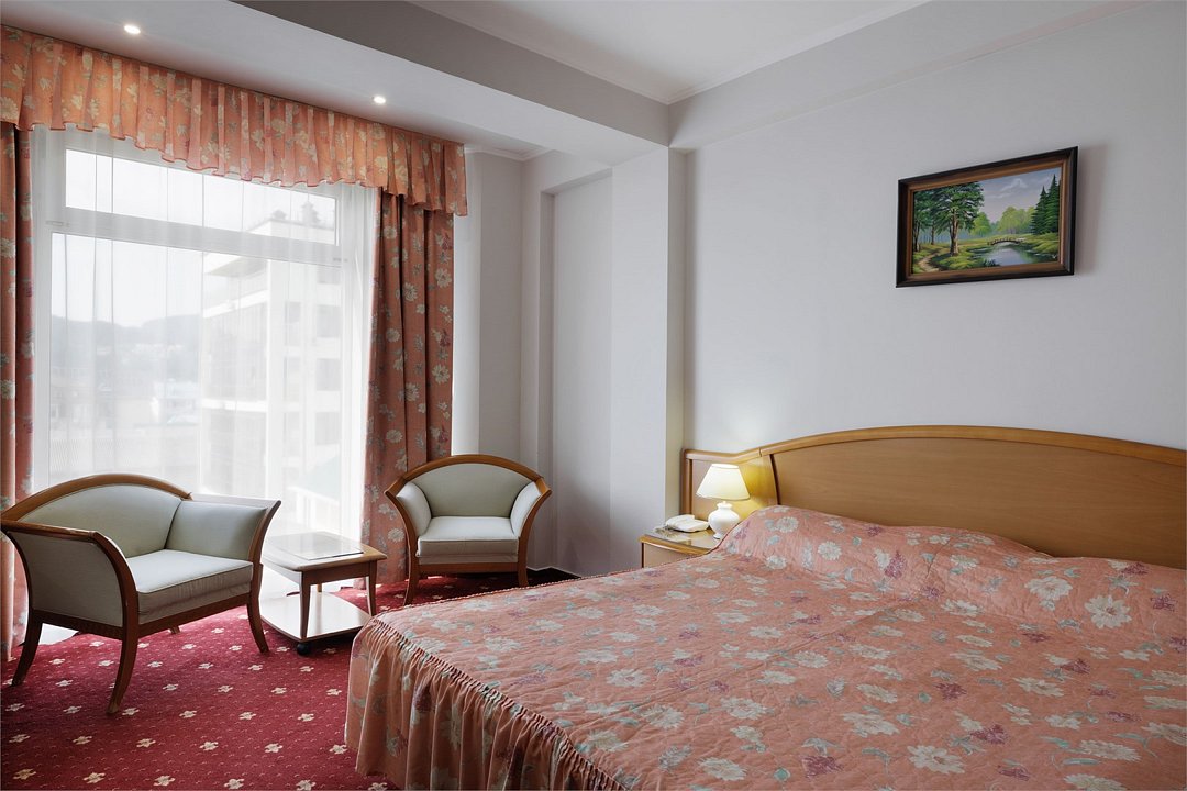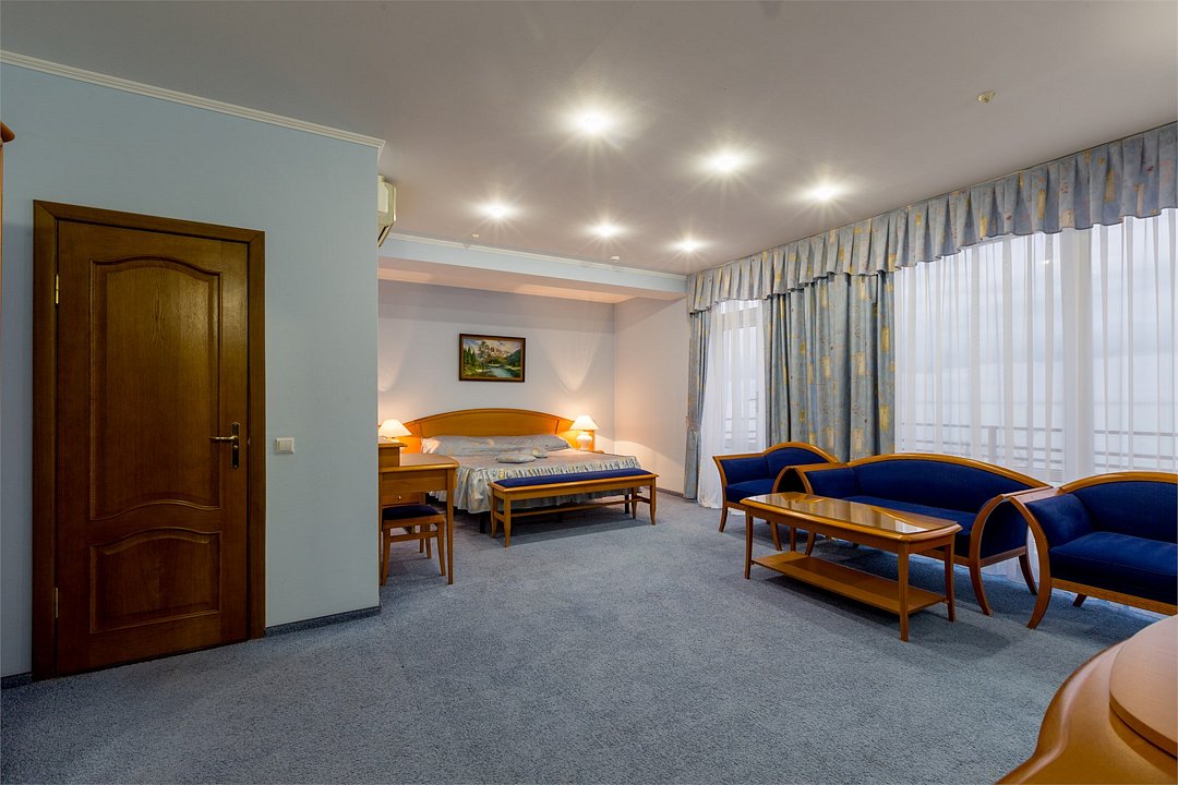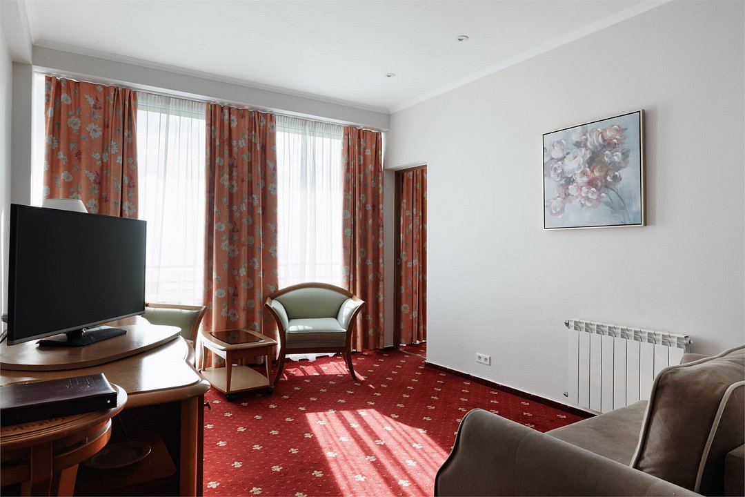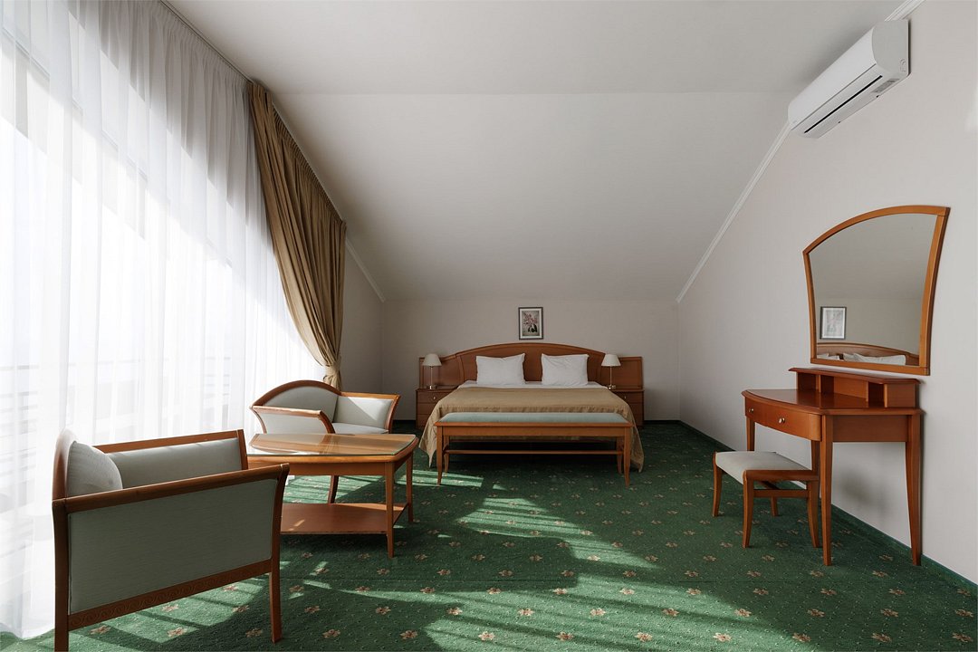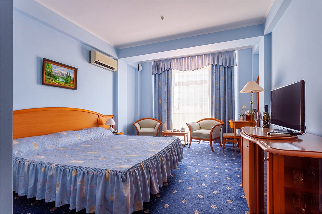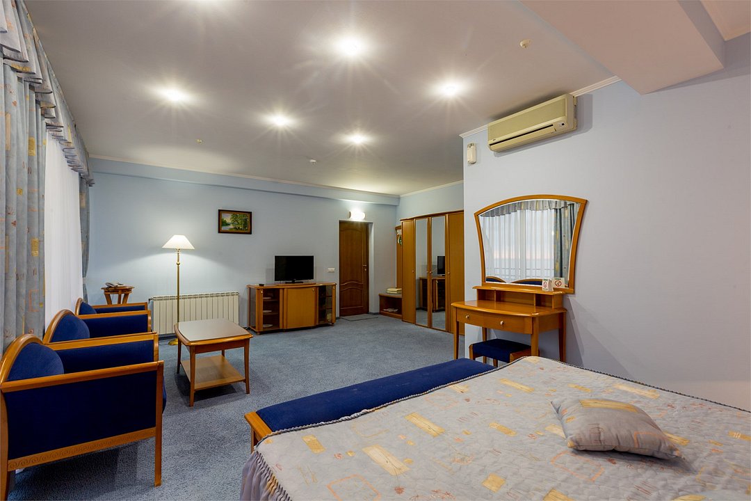 Большой однокомнатный номер общей площадью 42 кв. м с возможностью размещения двух человек. Основные спальные места – одна большая двуспальная кровать. В любом номере Джуниор Сюит возможен заказ одного дополнительного места. Номера располагаются на 5-м, 6-м, 7-м этажах. В номере: холодильник-бар; сплит-система; Wi-Fi; LCD телевизор с кабельным телевидением; электронный сейф-бокс; телефон; балкон; ванная комната с ванной или душевой кабиной; фен и косметические принадлежности; халат и тапочки. При заселении с гостей взимается возвратный депозит - 5000 рублей. Питание по системе "Шведский стол" проходит в ресторане "Миндаль" (отдельно стоящее от жилых корпусов здание).Услуги и удобства