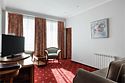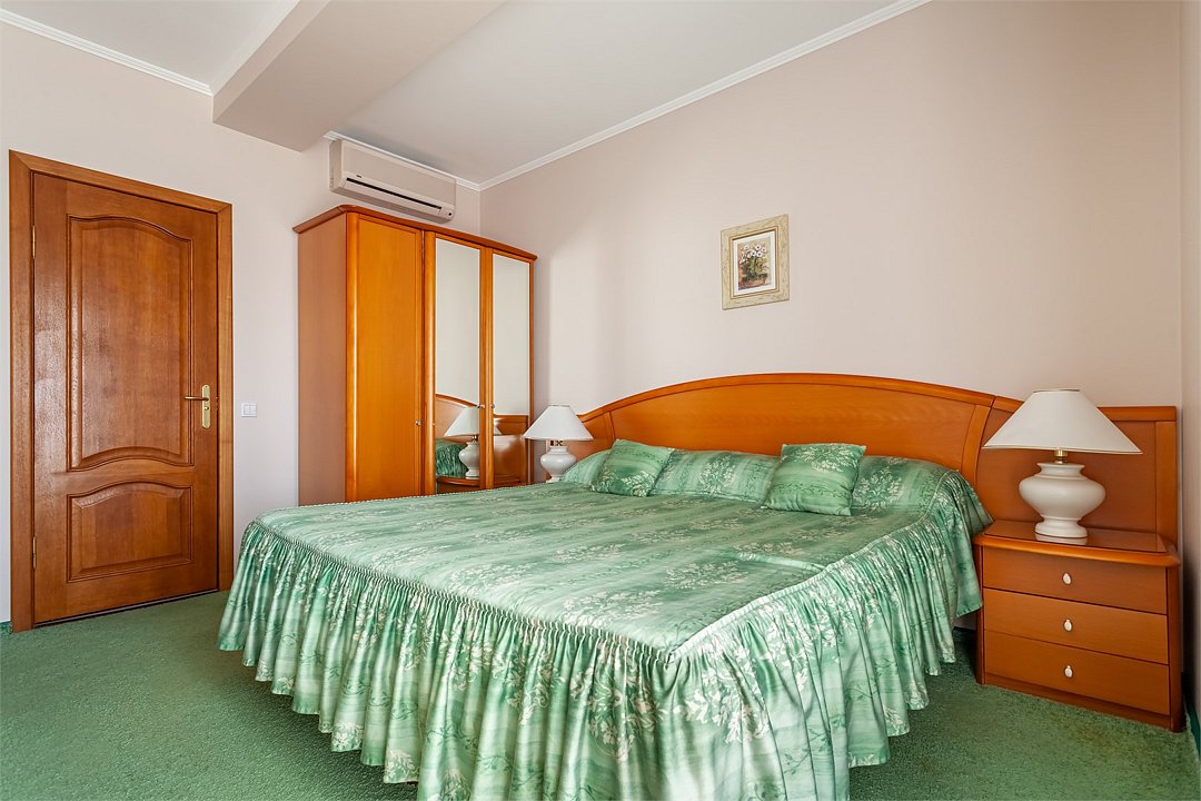 Большой двухкомнатный номер общей площадью 46 кв. м с возможностью размещения до четырех человек. В спальне двуспальная кровать, в гостиной — раздвижной диван. В номере: холодильник-бар; сплит-система; Wi-Fi; LCD телевизор с кабельным телевидением; электронный сейф-бокс; телефон; балкон; ванная комната с ванной или джакузи; фен и косметические принадлежности; халат и тапочки. При заселении с гостей взимается возвратный депозит - 5000 рублей. Питание по системе "Шведский стол" проходит в ресторане "Миндаль" (отдельно стоящее от жилых корпусов здание).Услуги и удобства