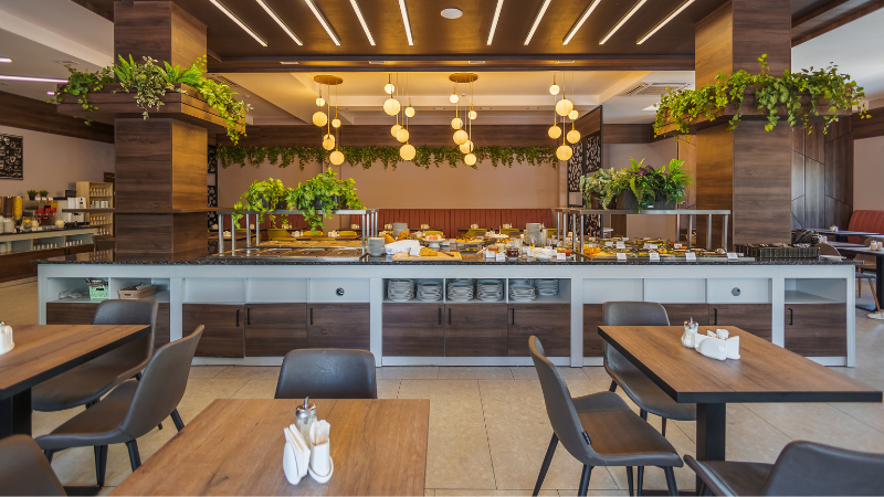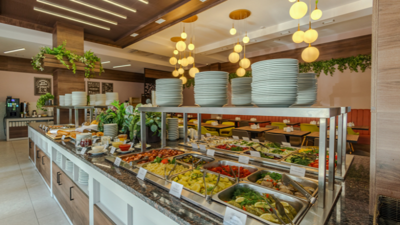 Здесь гостей ждет богатый выбор горячих и холодных блюд русской и европейской кухни, супы, разнообразные закуски и салаты,основные блюда из мяса и рыбы, несколько вариантов гарнира, молочные продукты, горячие напитки, фрукты, а также свежая выпечка и домашние десерты.