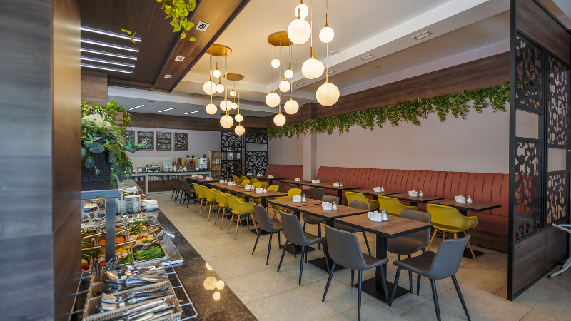 Ресторан «Миндаль» — стильный двухэтажный ресторан на 300 посадочных мест. В зале проходит питание по системе шведской линии.
