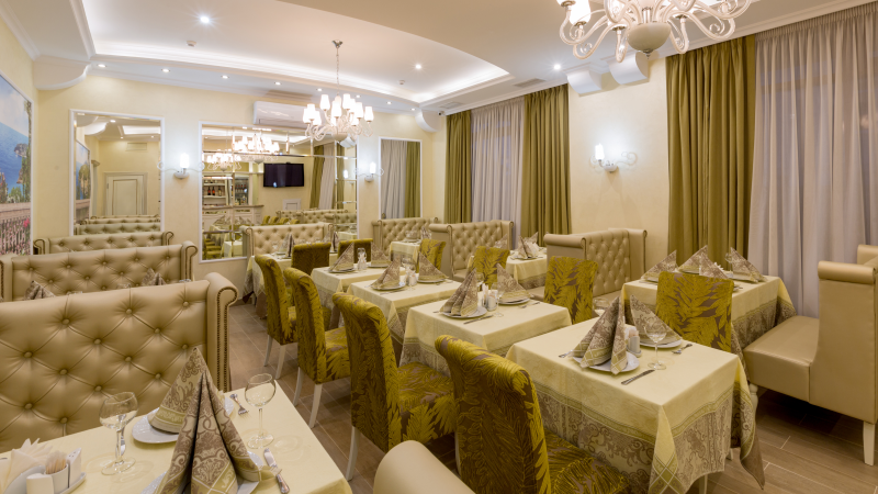 Скромный по размеру, но эффектный по убранству оформления и одновременно удобный по расположению зал находится на 1-м этаже отеля (1 корпус) и идеально подходит как для небольших банкетов, семейных праздников, корпоративов или свадебного торжества, так и для проведения конференций, семинаров, бизнес-завтраков и презентаций.