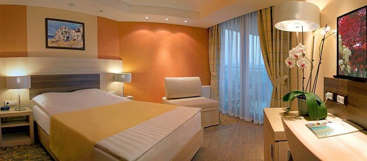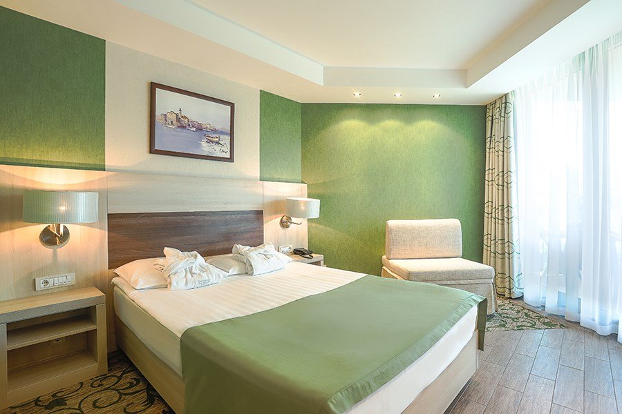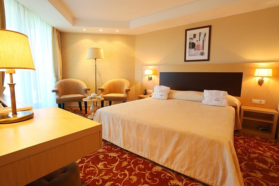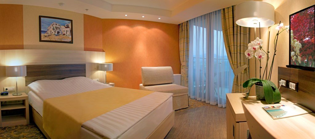 телевизор, кабельное телевидение, телефон, светильник, фен, электронные замки, ванная комната, санузел, банные принадлежности, халаты, банные полотенца, тапочки, балкон, двуспальная кровать, тумбы, стулья, шкаф для одежды, вешалки, письменный стол, багажная тумба, сейф, чайник, раковина, душ, вид на море, туалетный столик, раскладное кресло, мини-холодильник, фанкойлВ гостиничном номере