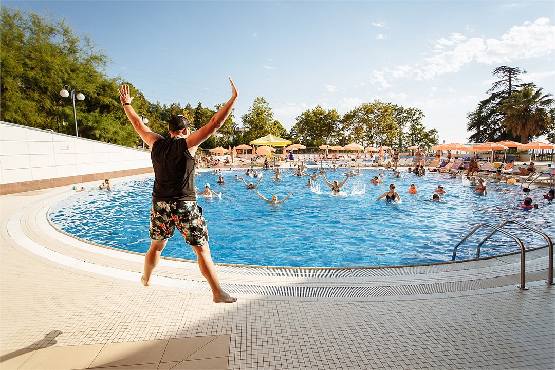 - пользование бассейном с подогреваемой морской водой (в период его работы): теневые навесы, шезлонги, полотенца;