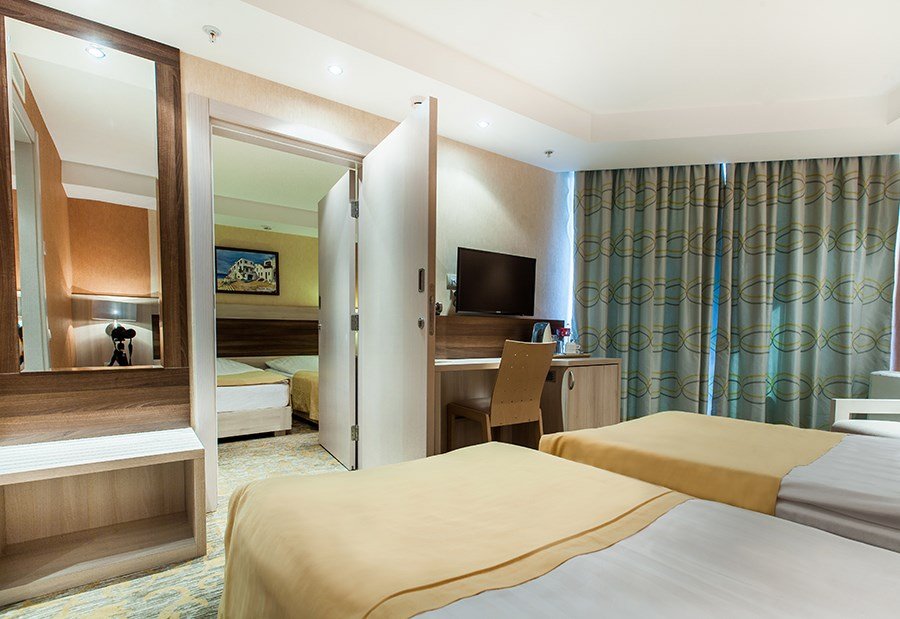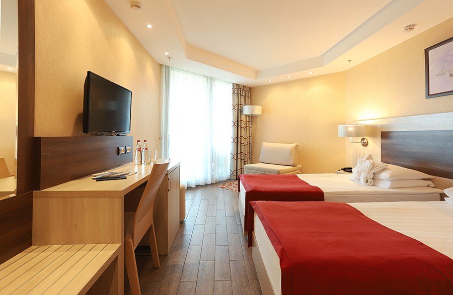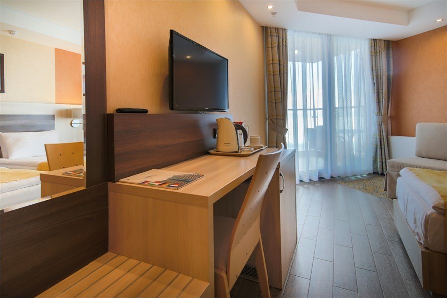 телевизор, спутниковое телевидение, кабельное телевидение, телефон, светильник, фен, электронные замки, ванная комната, душевая кабина, санузел, халаты, банные полотенца, тапочки, гигиенические средства, балкон, две односпальные кровати, тумбы, стулья, шкаф для одежды, вешалки, багажная тумба, зеркало, сейф, чайник, унитаз, раковина, вид на море, стол, туалетный столик, сушилка для белья, раскладное кресло, мини-холодильник, фанкойлВ гостиничном номере