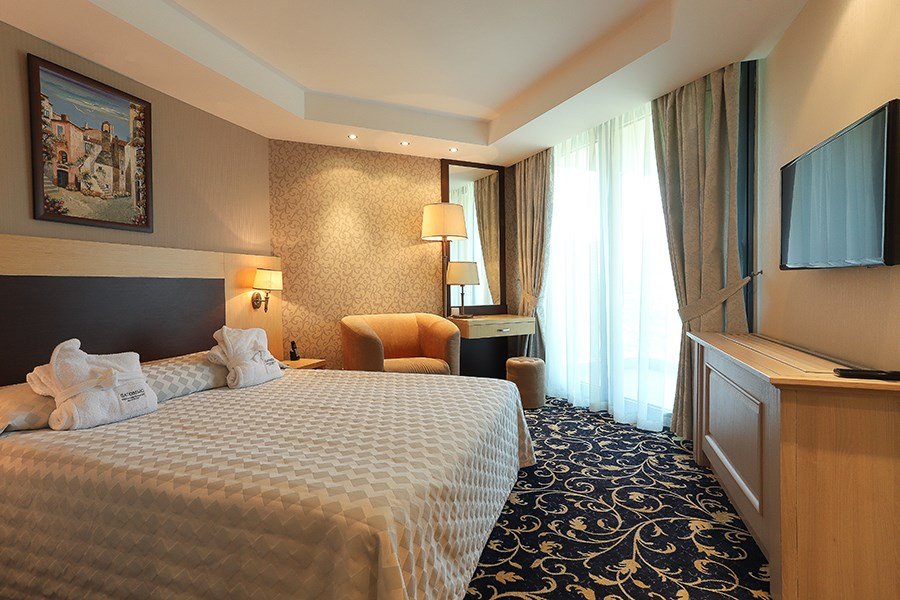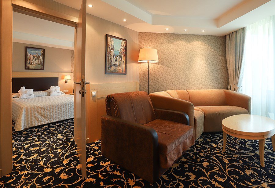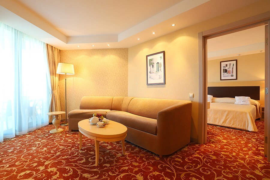 Двухкомнатный номер, площадью 46 кв.м., состоит из спальни и гостиной, идеально подходит для комфортного размещения двух гостей. Из окон всех номеров данной категории открывается панорамный вид на Кавказские горы и на дендропарковую зону Комплекса. Стоимость номера определяется количеством человек, проживающих на основных и дополнительных местах. Дети до 5 лет принимаются бесплатно без предоставления дополнительного места. Дети в возрасте 12 лет (на день заезда) и старше относятся к категории «Взрослые». При размещении на дополнительном месте взрослого - скидка 20% от стоимости основного места; при размещении ребенка - скидка 50%. Расчетный час 12.00 московского времени. Время заезда 14.00 московского времени. Ранний заезд и поздний выезд осуществляются за дополнительную оплату.Услуги и удобства