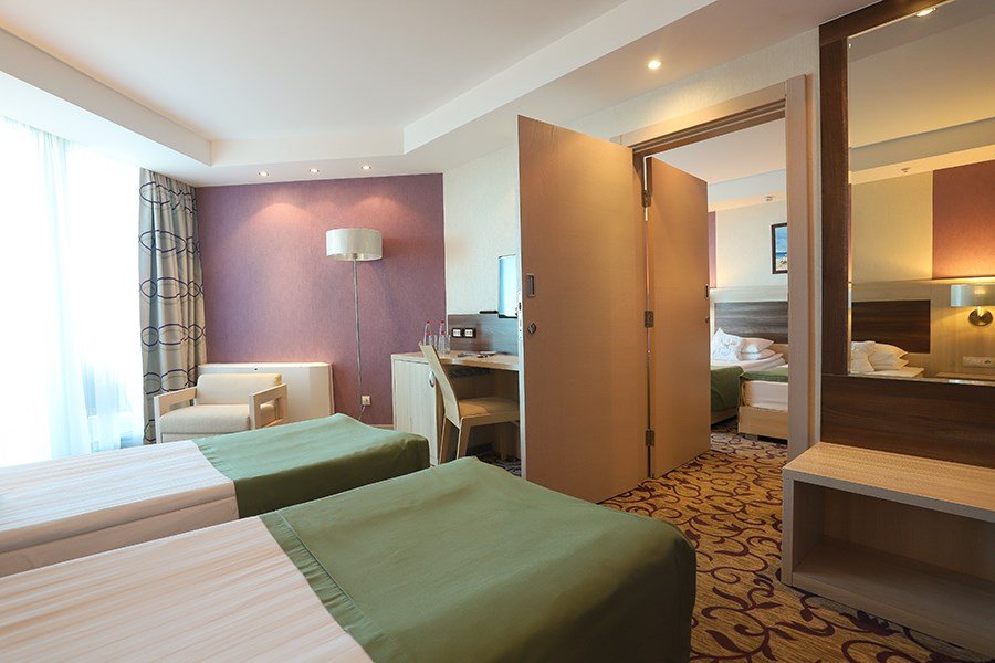 Двухкомнатный номер, площадью 52 кв.м., состоит из спальни и гостиной, идеально подходит для комфортного размещения трёх гостей. Из окон всех номеров данной категории открывается панорамный вид на Кавказские горы и на дендропарковую зону Комплекса. Стоимость номера определяется количеством человек, проживающих на основных и дополнительных местах. Дети до 5 лет принимаются бесплатно без предоставления дополнительного места. Дети в возрасте 12 лет (на день заезда) и старше относятся к категории «Взрослые». При размещении на дополнительном месте взрослого - скидка 20% от стоимости основного места; при размещении ребенка - скидка 50%. Расчетный час 12.00 московского времени. Время заезда 14.00 московского времени. Ранний заезд и поздний выезд осуществляются за дополнительную оплату.Услуги и удобства