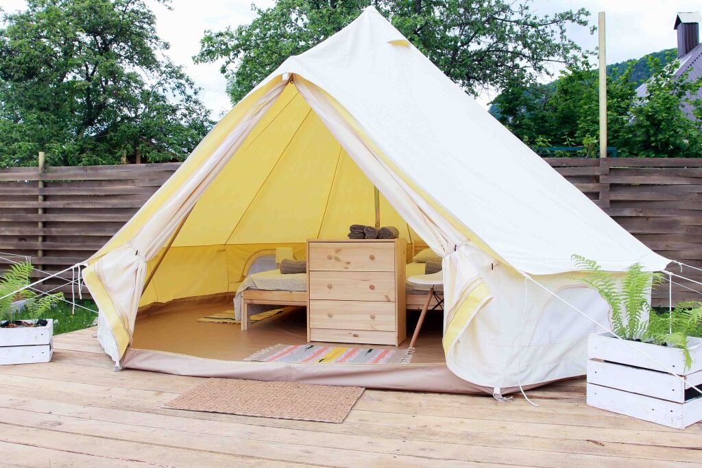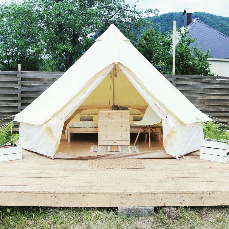 продуманная планировка шатров с большими кроватями, вешалками и комодами, а в семейных шатрах с диваном и столиком;