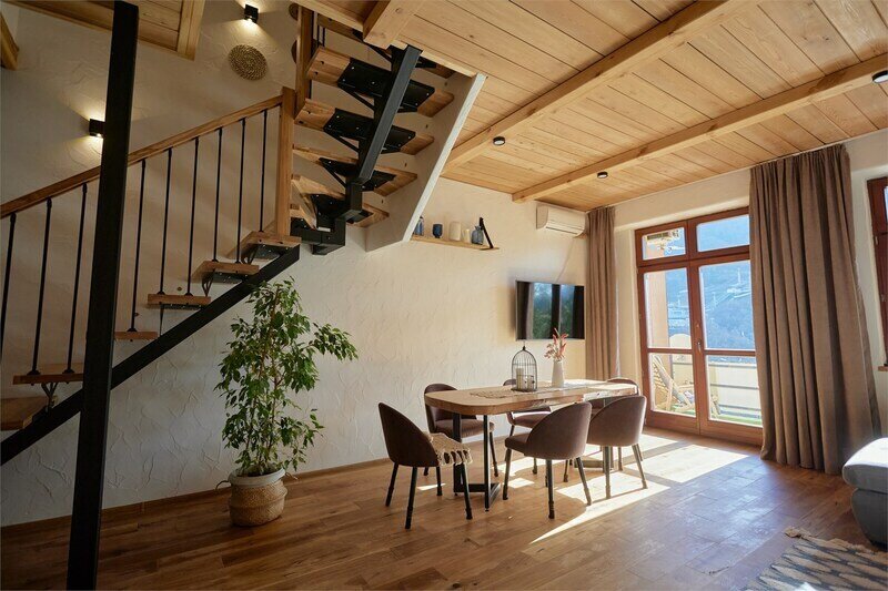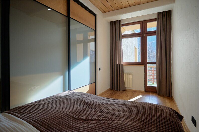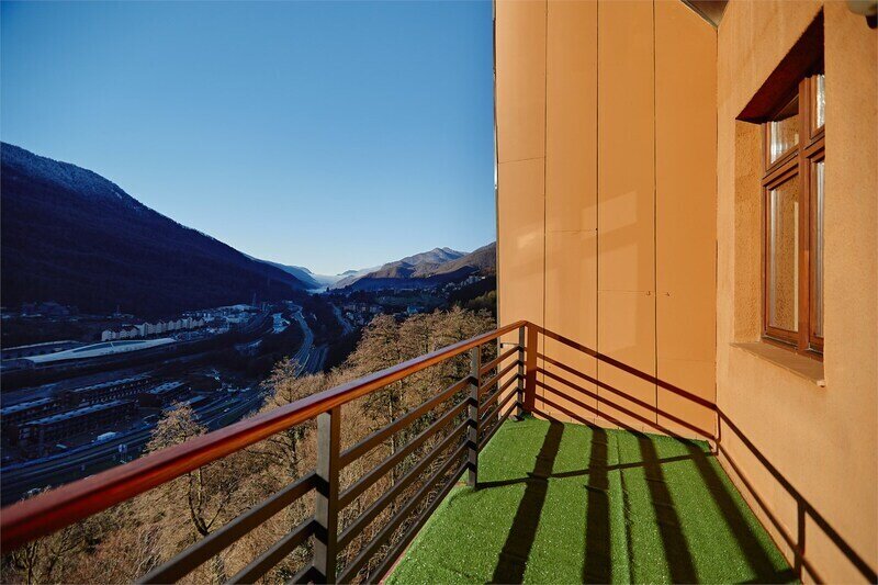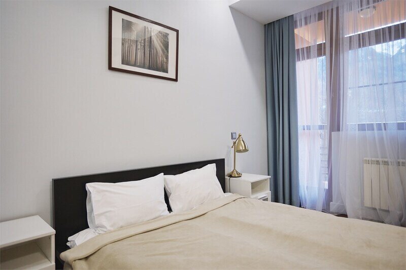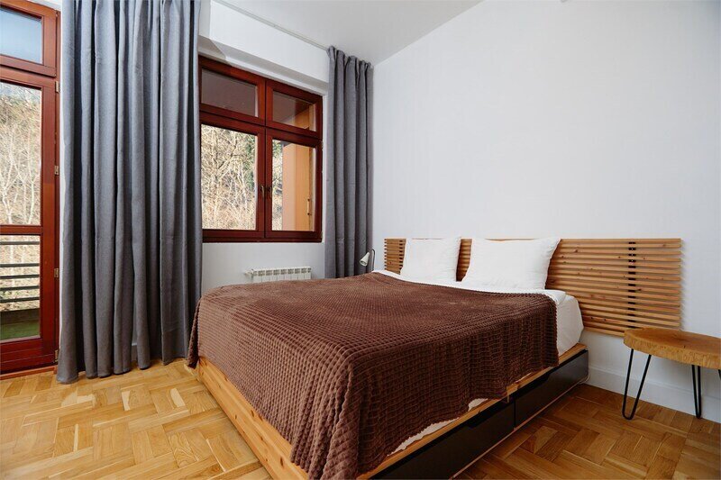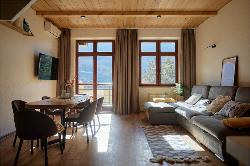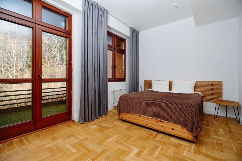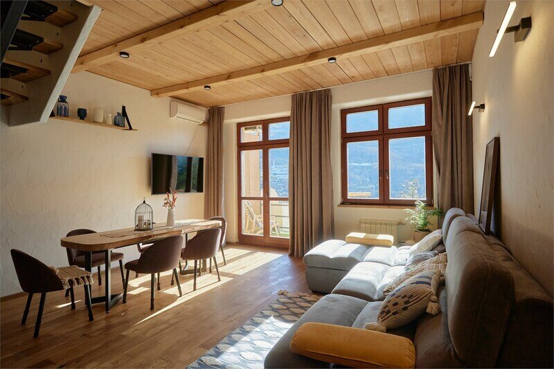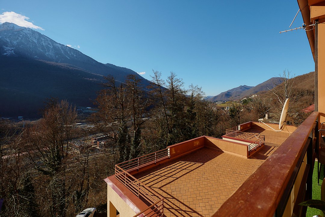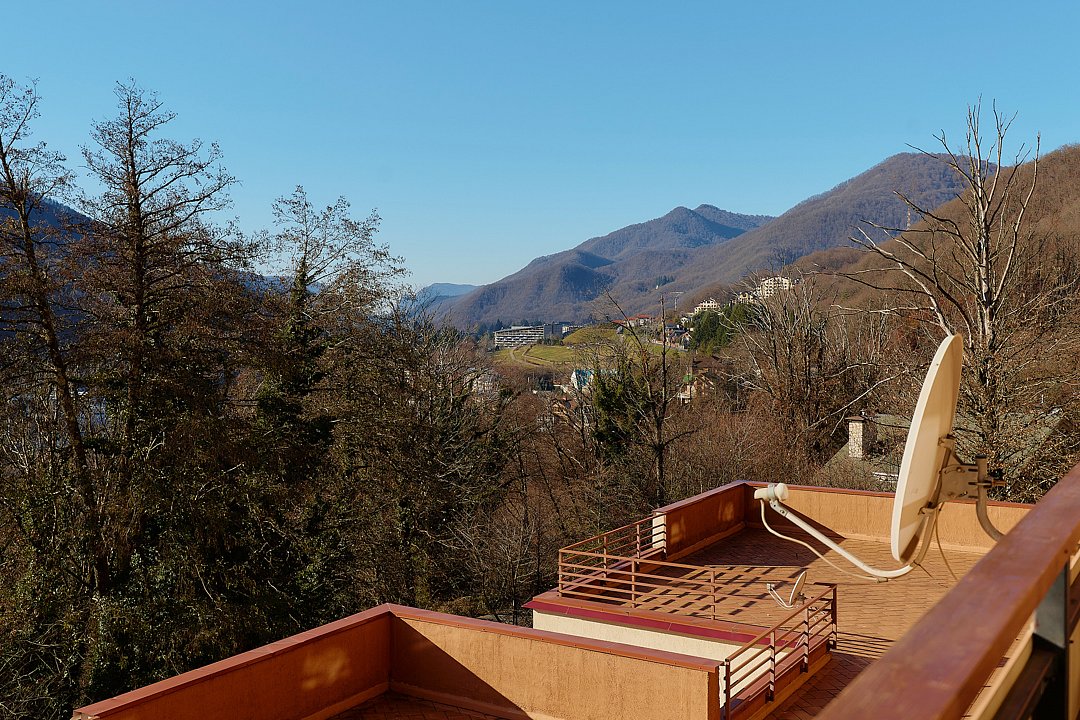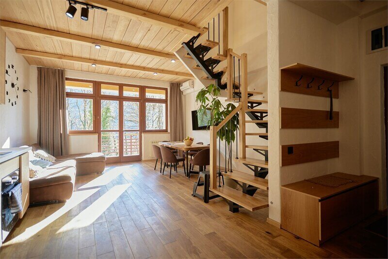 Двухуровневые апартаменты с уникальным видом на ущелье и горы. Дизайнерский интерьер подчеркивает это уникальное расположение квартиры - среди лесистых гор, рек и ущелий человек ощущает своё единство с природой, находясь к современной квартире. Две отдельные спальни и ванная комната расположены на верхнем этаже. На нижнем этаже студия с оборудованной кухней, большим столом, диваном, ванной комнатой. В конце 2022 года сделана реновация. Яндекс, отзыв, июль 2022: Хорошие апартаменты, презентабельный добротный ремонт, чувствуется рука дизайнера. Всё необходимое (электроприборы от чайника до посудомоечной машины) в квартирах есть, для комфортного отдыха то, что нужно. Семье или компании до 6 человек запросто можно разместиться. Просторно, чисто, прекрасные виды из окон и краснополянский воздух в неограниченном количестве.