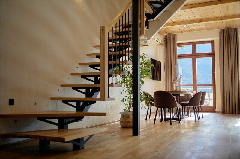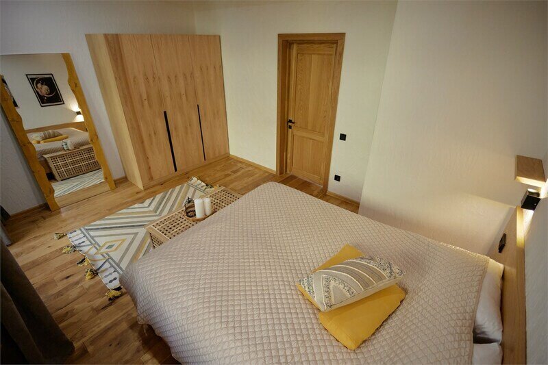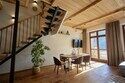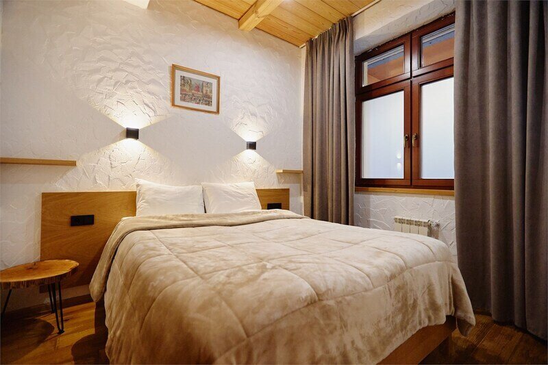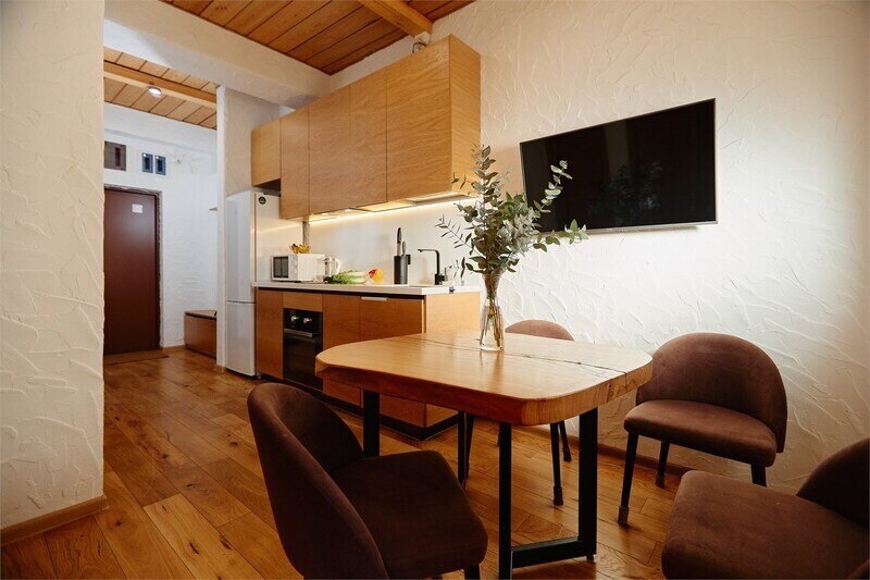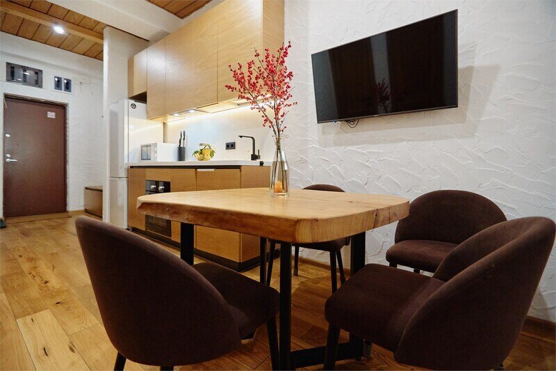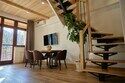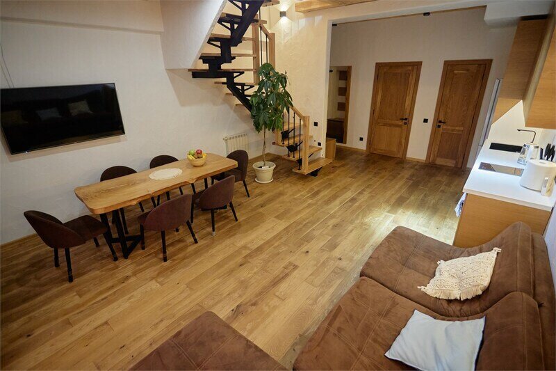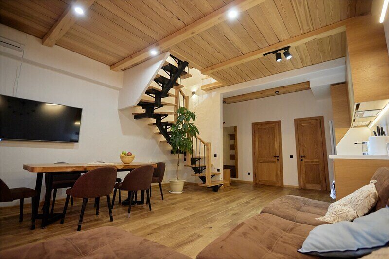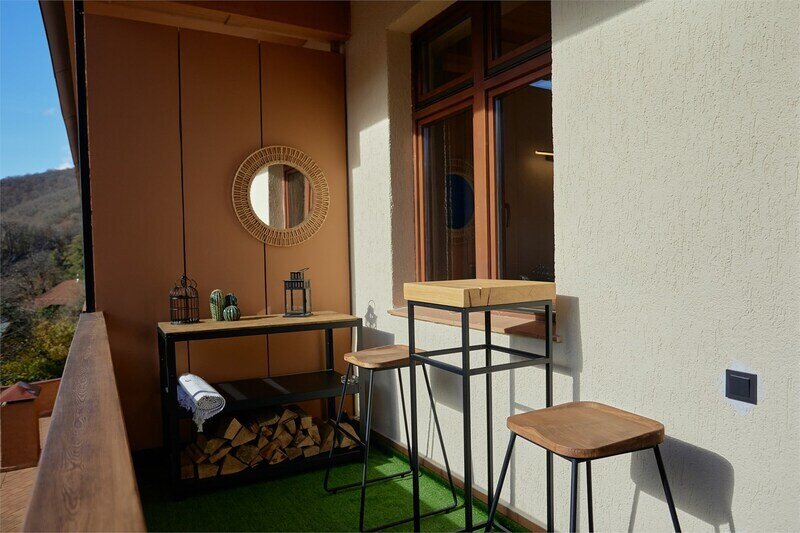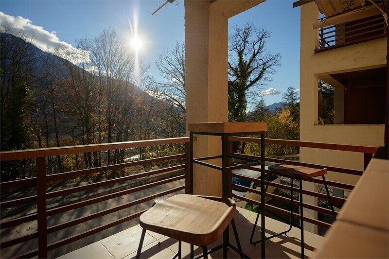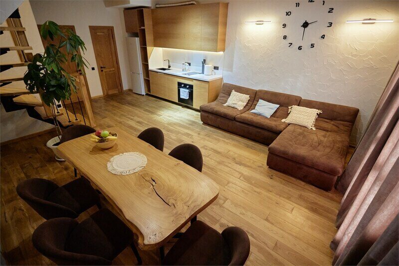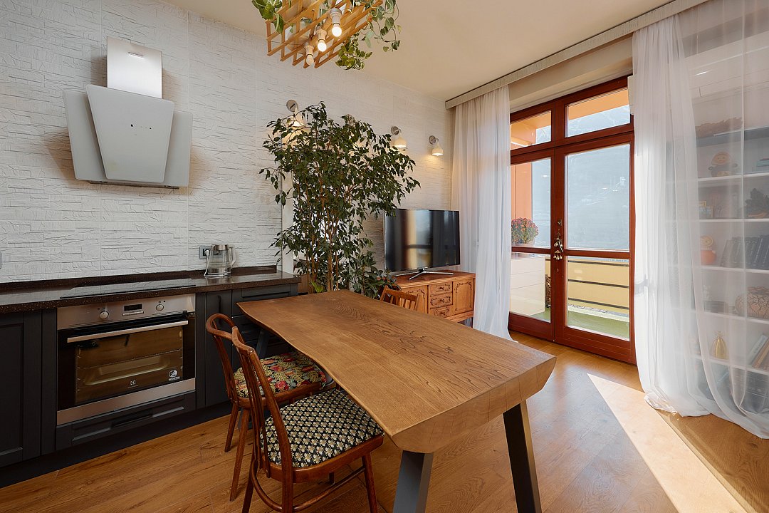 Двухуровневые апартаменты с уникальным видом на ущелье и горы. Дизайнерский интерьер подчеркивает это уникальное расположение квартиры - среди лесистых гор, рек и ущелий человек ощущает своё единство с природой, находясь к современной квартире. Две отдельные спальни и ванная комната расположены на верхнем этаже. На нижнем этаже студия с оборудованной кухней, большим столом, диваном, ванной комнатой. В конце 2022 года сделана реновация. Яндекс, отзыв, июль 2022: Хорошие апартаменты, презентабельный добротный ремонт, чувствуется рука дизайнера. Всё необходимое (электроприборы от чайника до посудомоечной машины) в квартирах есть, для комфортного отдыха то, что нужно. Семье или компании до 6 человек запросто можно разместиться. Просторно, чисто, прекрасные виды из окон и краснополянский воздух в неограниченном количестве.