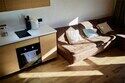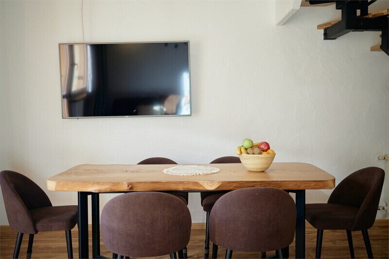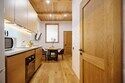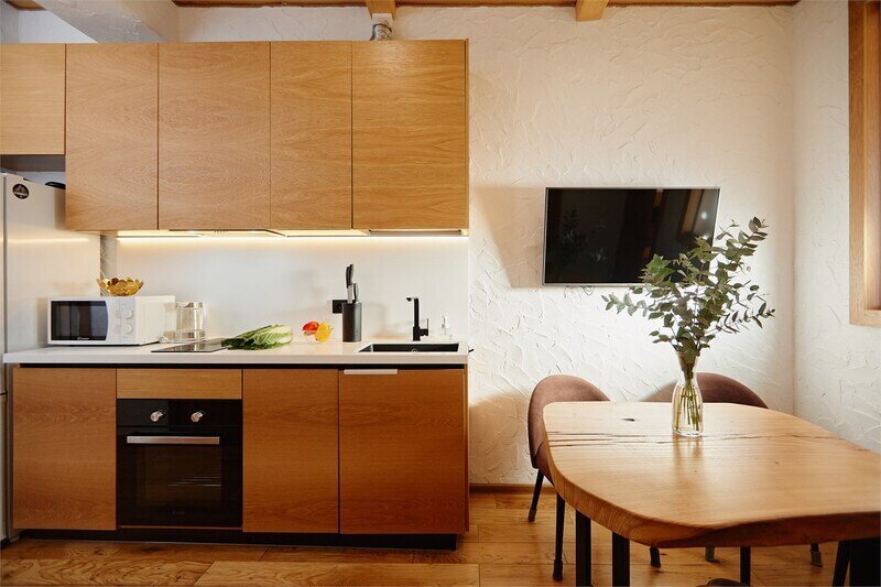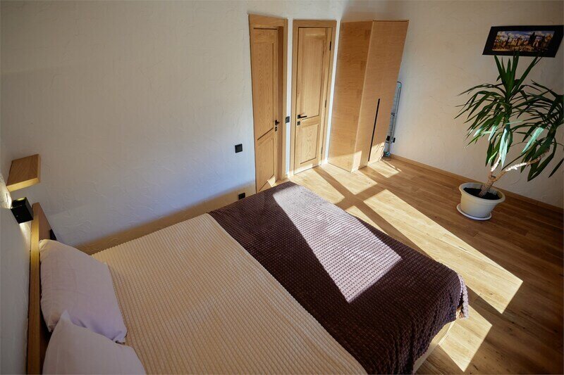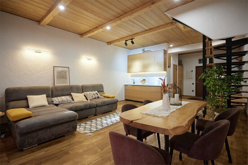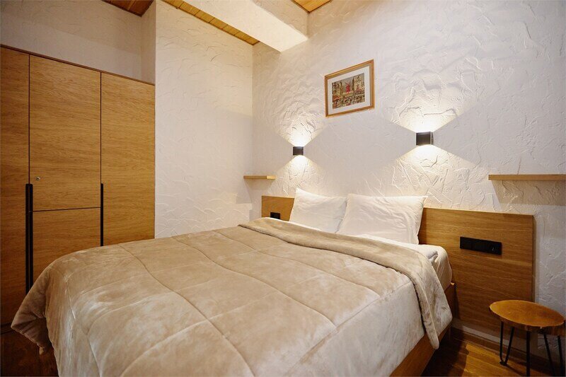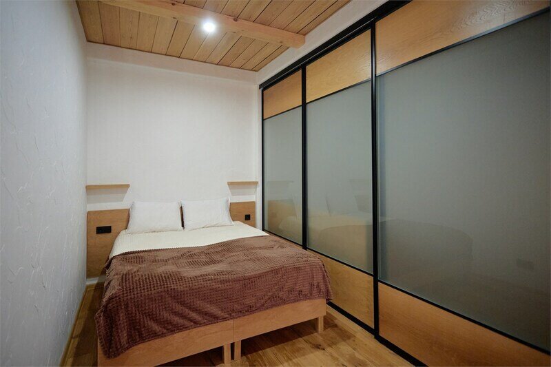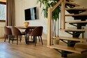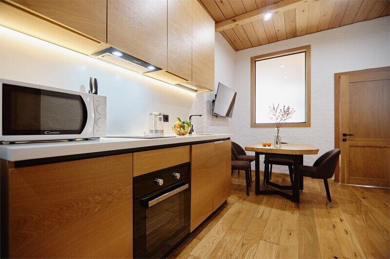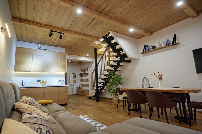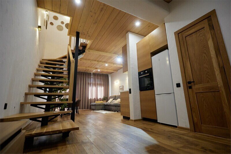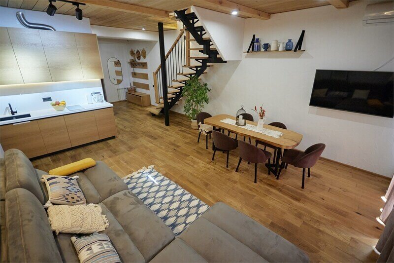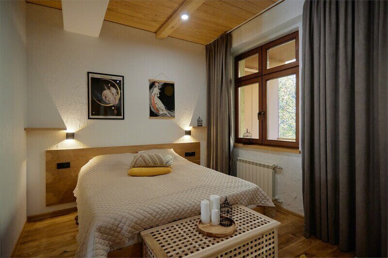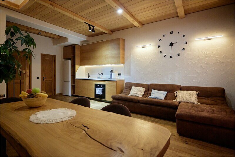 Двухуровневые апартаменты с уникальным видом на ущелье и горы. Дизайнерский интерьер подчеркивает это уникальное расположение квартиры - среди лесистых гор, рек и ущелий человек ощущает своё единство с природой, находясь к современной квартире. Две отдельные спальни и ванная комната расположены на верхнем этаже. На нижнем этаже студия с оборудованной кухней, большим столом, диваном, ванной комнатой. В конце 2022 года сделана реновация. Яндекс, отзыв, июль 2022: Хорошие апартаменты, презентабельный добротный ремонт, чувствуется рука дизайнера. Всё необходимое (электроприборы от чайника до посудомоечной машины) в квартирах есть, для комфортного отдыха то, что нужно. Семье или компании до 6 человек запросто можно разместиться. Просторно, чисто, прекрасные виды из окон и краснополянский воздух в неограниченном количестве.