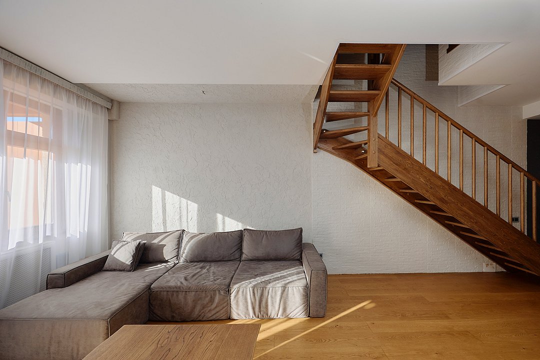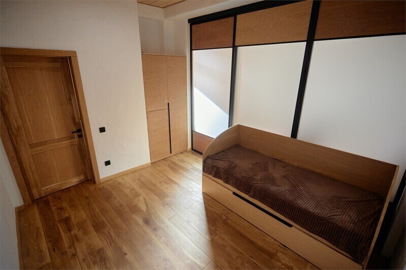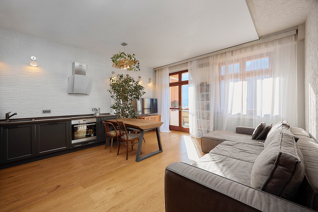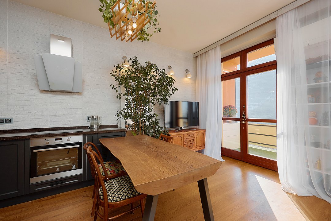 Двухуровневые апартаменты с красивым видом на горы. Интерьер в стиле "шале" выполнен из натуральных материалов. Дубовый паркет и мебель из древесины лиственных пород создадут особенный микроклимат. В квартире установлена сауна с эффектом аромапарения. Просторные спальни на верхнем этаже и большая студия на нижнем этаже будут удобны для большой компании или семьи.