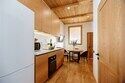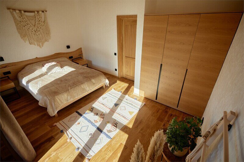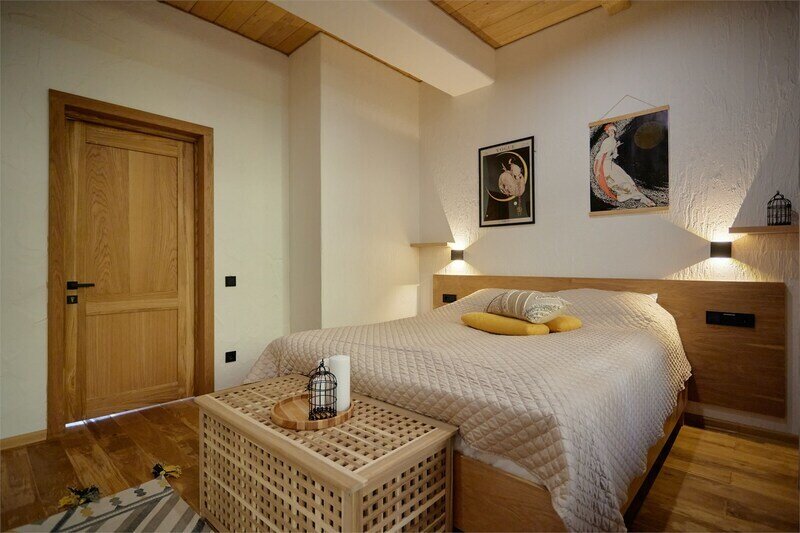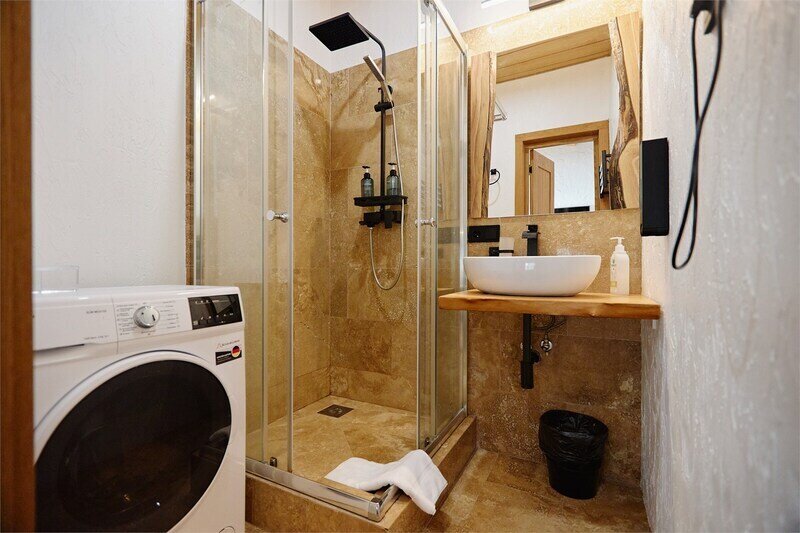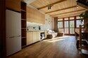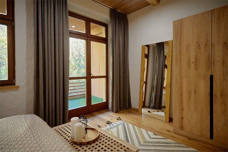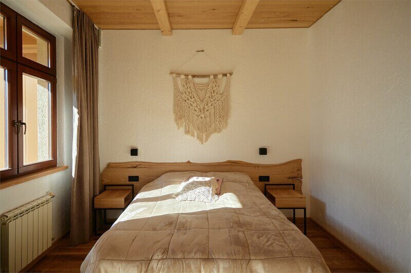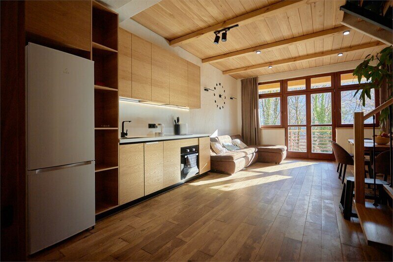 Двухуровневые апартаменты с красивым видом на горы. На верхнем уровне этаже расположены 2 спальни с одной большой кроватью в каждой, с видом на разные стороны дома, ванная комната с душем. В одной из спален есть диван, офисный стол и ванна прямо в пространстве комнаты. На нижнем этаже общее пространство с кухней, обеденной зоной, раскладывающимся диваном, а также ванная комната с душем. Дом расположен в лесу на территории Национального парка. Потрясающе местоположение комплекса делают его уникальным, тихим и спокойным. Рядом горы, лес, водопады. В апартаментах есть все необходимое для отдыха