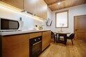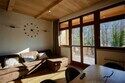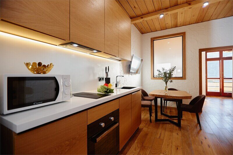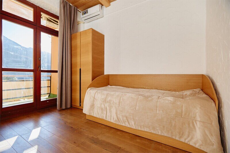 Двухуровневые апартаменты с красивым видом на ущелье и горы. Интерьер в стиле "шале" выполнен из натуральных материалов. Дубовый паркет и древесина лиственных пород создадут особенный микроклимат. Две отдельные спальни и ванная комната расположены на верхнем этаже. На нижнем этаже студия с оборудованной кухней, большим столом, огромным диваном, ванной комнатой.