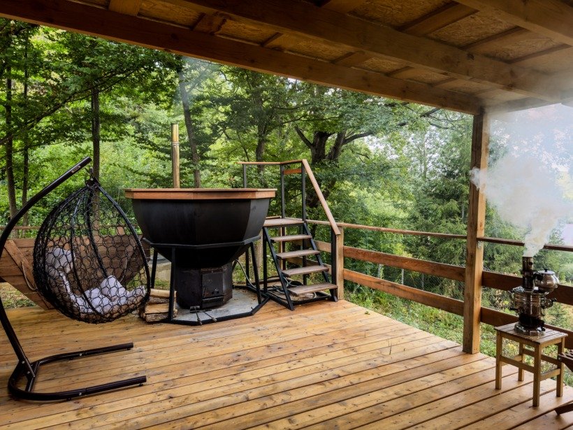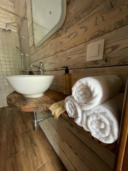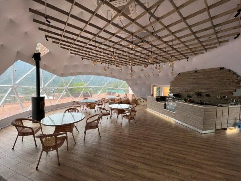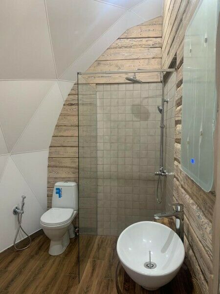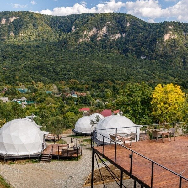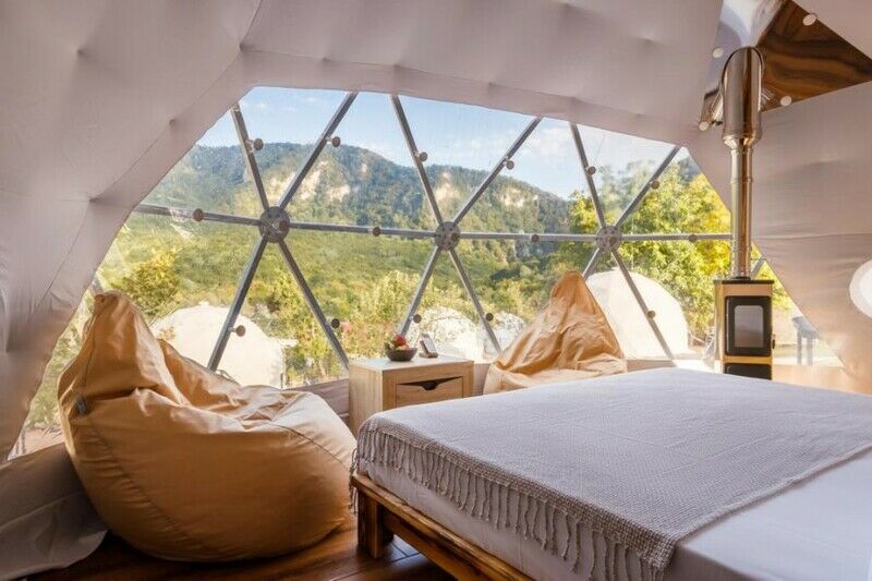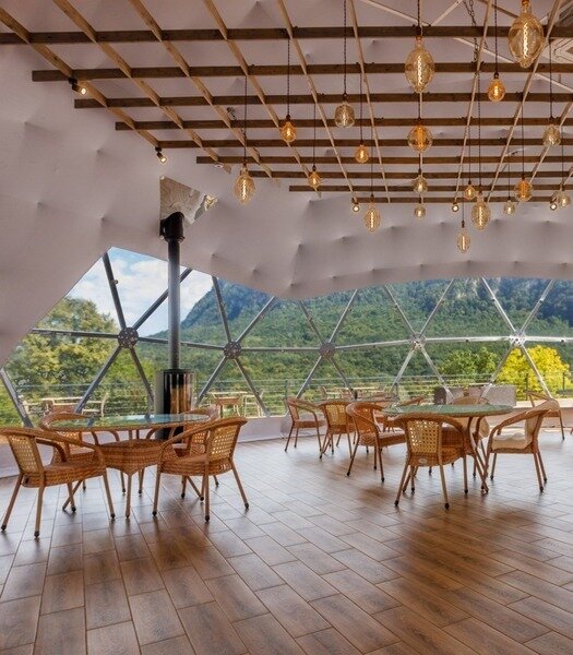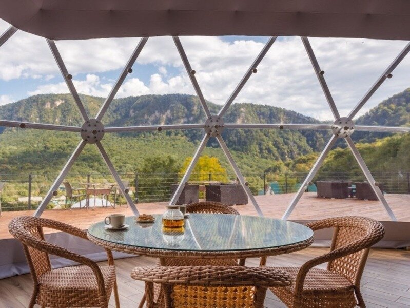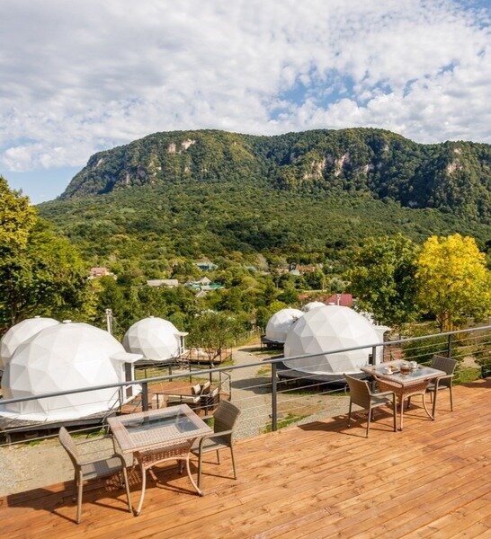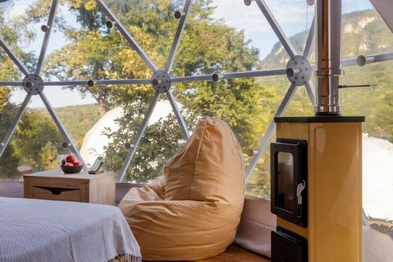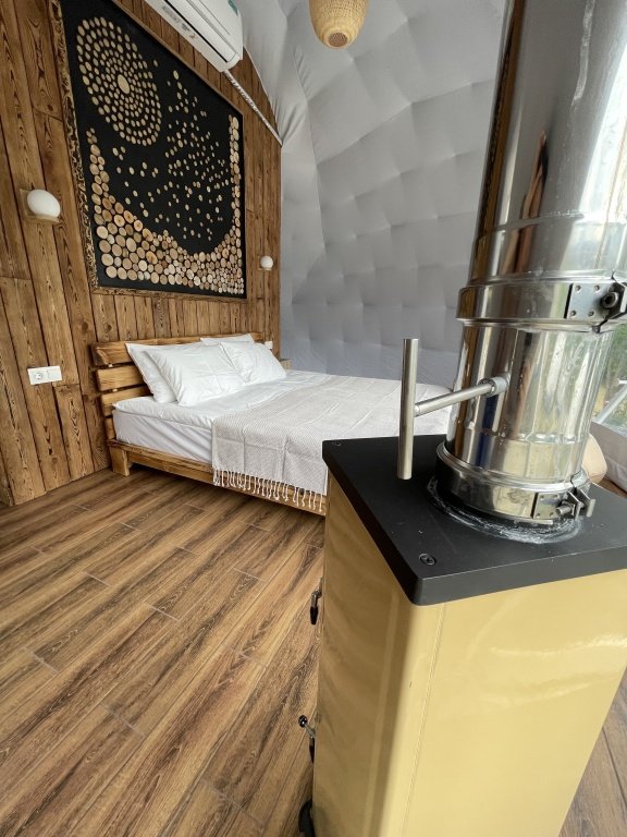 Панорамное остекление и вид на горы, создает особое состояние и близость с природой во время отдыха в сфере. У каждого купола есть своя веранда с ротанговой мебелью. В сфере обустроена ванная комната с душем, полотенцесушителем, туалетом и раковиной с зеркалом. Предоставляются халаты, полотенца, тапочки, фен и косметику для душа. В жаркие дни очень приятно включить кондиционер и насладится прохладой. В межсезонье и зимнее время особый уют создают камин, пледы и теплые полы. Пуфики и столик внутри сферы — прекрасное место для общения или чтения книги. Купола по запросу комплектуются двуспальными или односпальными кроватями. Возможна организация дополнительного спального места на раскладной кровати. Комфортно могут разместиться три человека. Для больших семей и компаний мы построили сдвоенную сферу с общей террасой. В ней может разместиться компания из 6 человек. Разместиться с комфортом можно круглый год.
