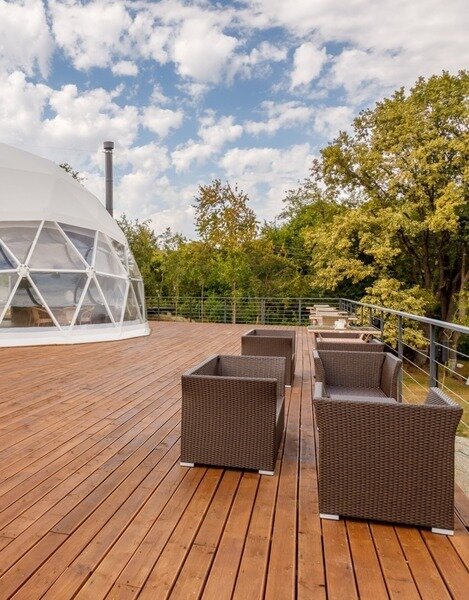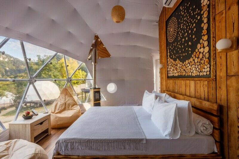 На территории глэмпинга расположено 8 куполов, каждый из которых оснащен всем необходимым для того, чтобы гости чувствовали себя комфортно, оставив все бытовые заботы и смогли полностью погрузиться в атмосферу места. Для больших семей и компаний построена сдвоенная сфера с общей террасой. В ней может разместиться компания из 6 человек.