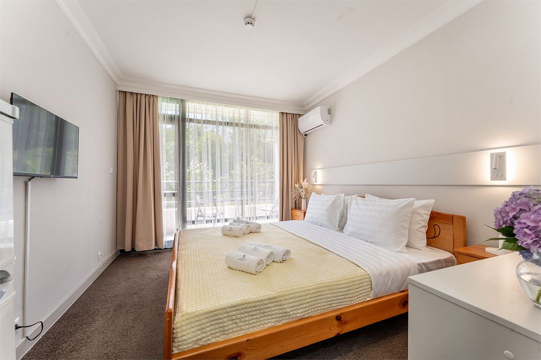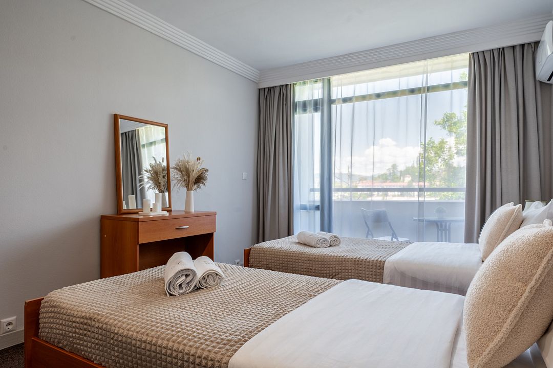 Отличный выбор для тех, кто ценит практичность и удобство. В номере: две односпальные или большая двуспальная кровать, телевизор, холодильник, фен, чайный набор, а также ванная комната с душем. Спокойная цветовая гамма и ненавязчивый интерьер создают приятную атмосферу для отдыха и восстановления.Услуги и удобства