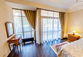 Wi-Fi, интернет, кондиционер, светильник, фен, санузел, банные принадлежности, халаты, банные полотенца, пляжные полотенца, тапочки, балкон, две односпальные или большая двуспальная кровать, тумбы, шкаф для одежды, чайный набор, чайник, ковровое покрытие, душ, стол, панорамные окна, телевизор с плоским экраном, мини-холодильник, пуфик, туалетные принадлежности премиум-класса, вешалки-плечики, мыло, затемняющая штораВ гостиничном номере