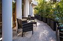 Днем приятно освежиться под зонтами или в тени бунгало, а с наступлением вечера загорается мягкое освещение и звучит приятная музыка, создавая стильное пространство для расслабления и общения.