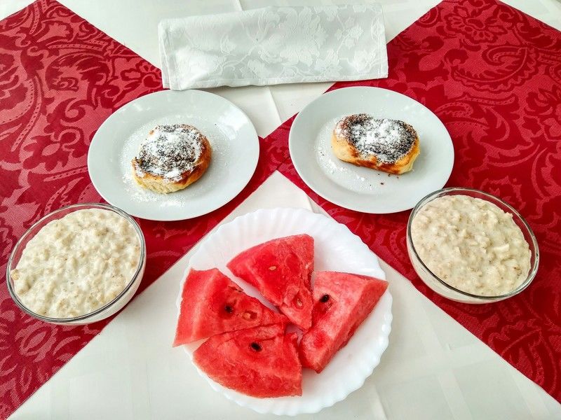 Питание готовится каждый день свежее, подается официантом трижды в день прямо к номеру по предварительному заказу за день. Можно на выбор: завтрак, обед ужин.