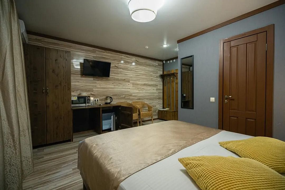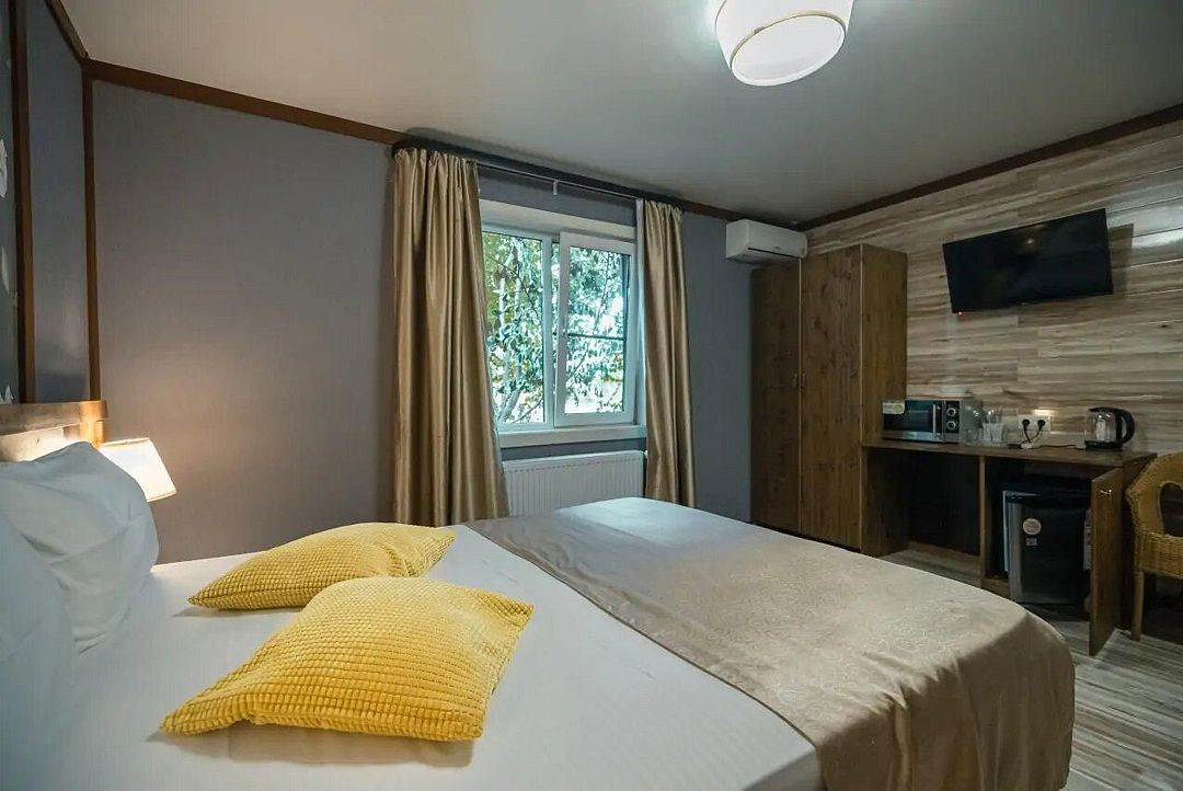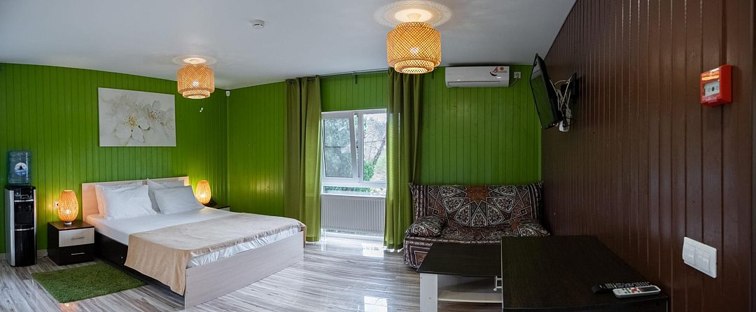 Номер оснащен всем необходимым для комфортного проживания на берегу моря, в том числе, интернетом, телевидением, сплит-системой и удобными кроватями. Комплектация спальных мест: двухместная кровать 160 см+ одноместная.