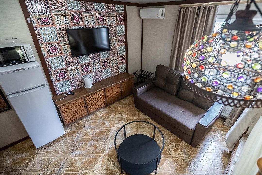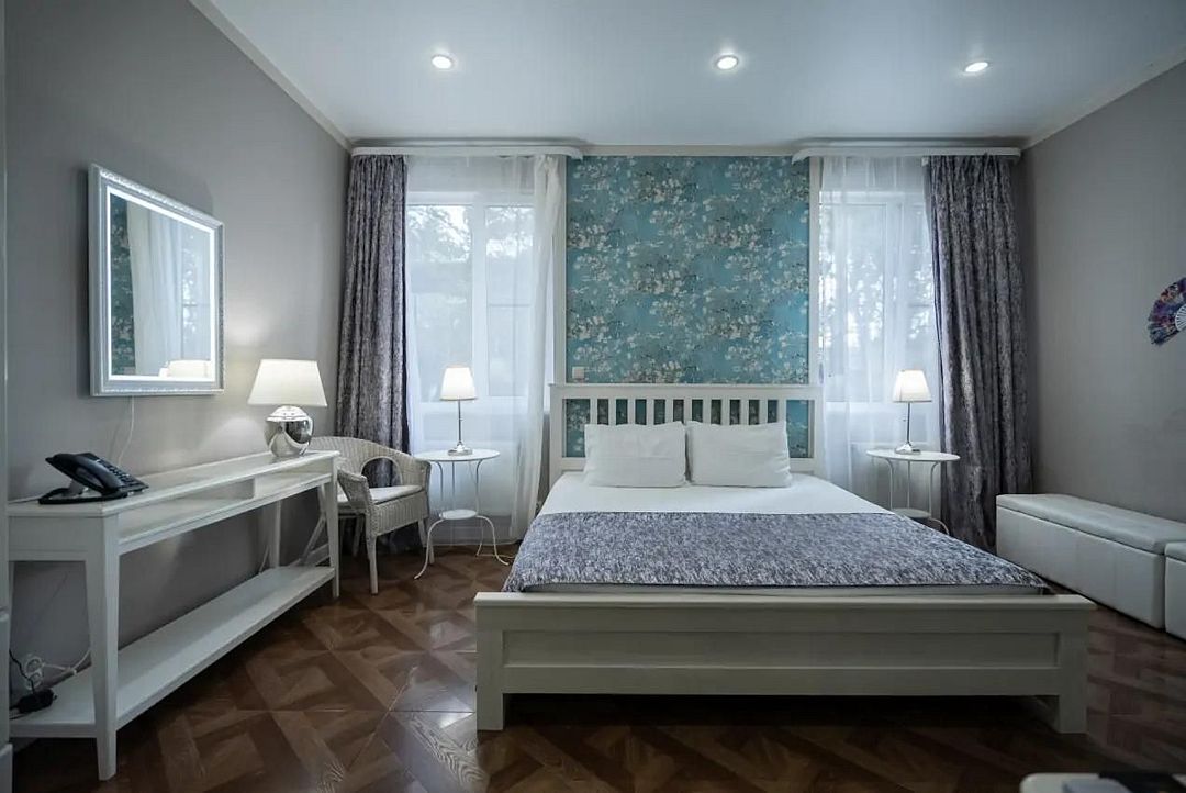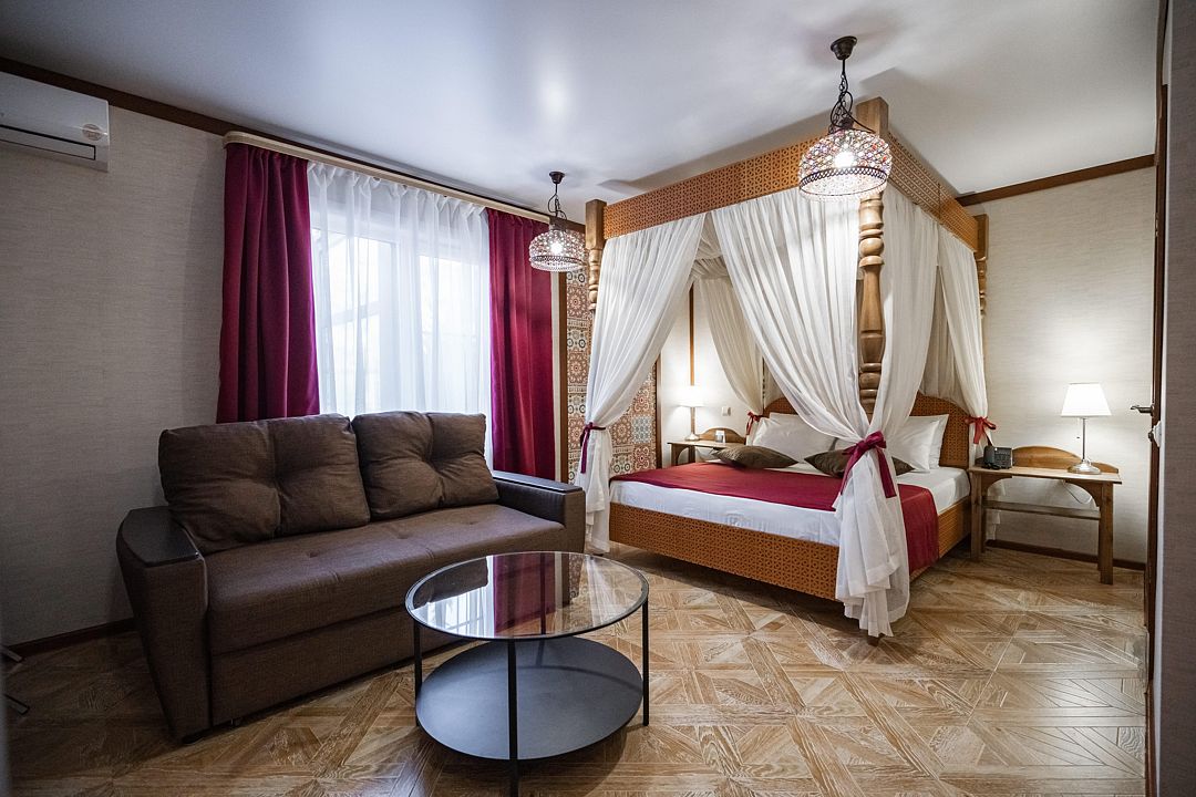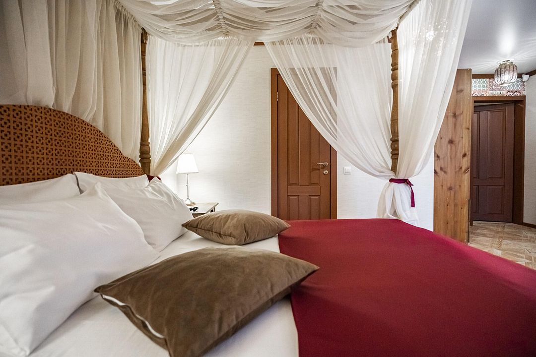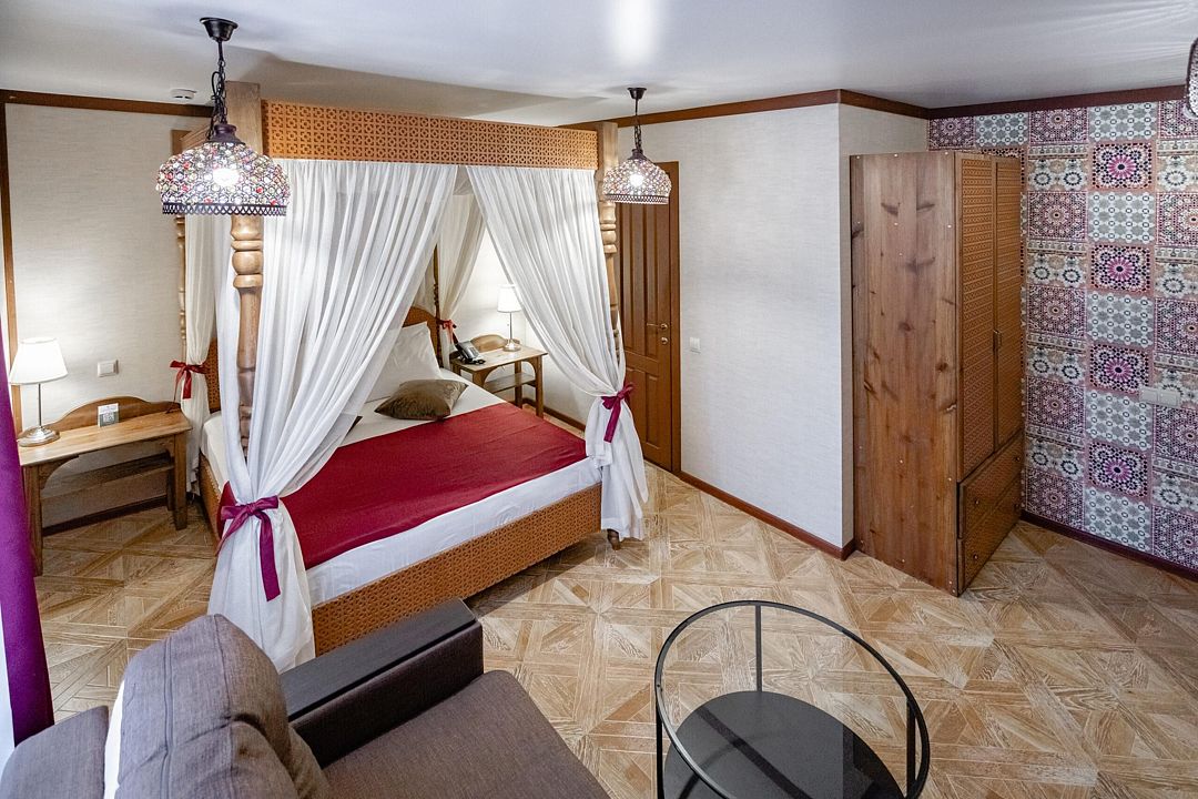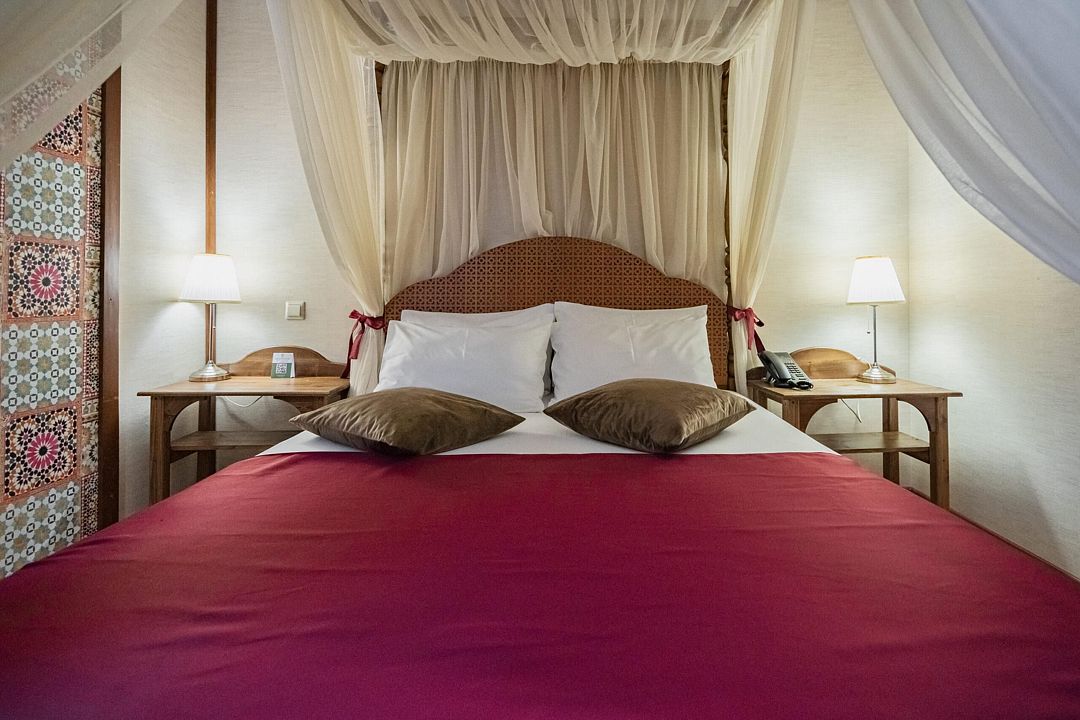 Мечтаете об спокойном, расслабленном отдыхе среди красивой природы? Забронируйте люкс в восточном стиле. Он не только оборудован всем необходимым для комфорта, но и привлекает внимание необычным оформлением. Стены номера украшены узорами в османском стиле, а просторная кровать под балдахином так и манит прилечь. Почувствуйте себя героем сказки из «1000 и 1 ночи».
