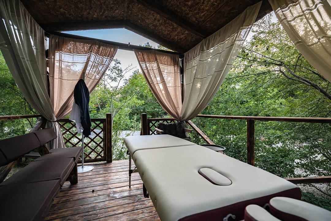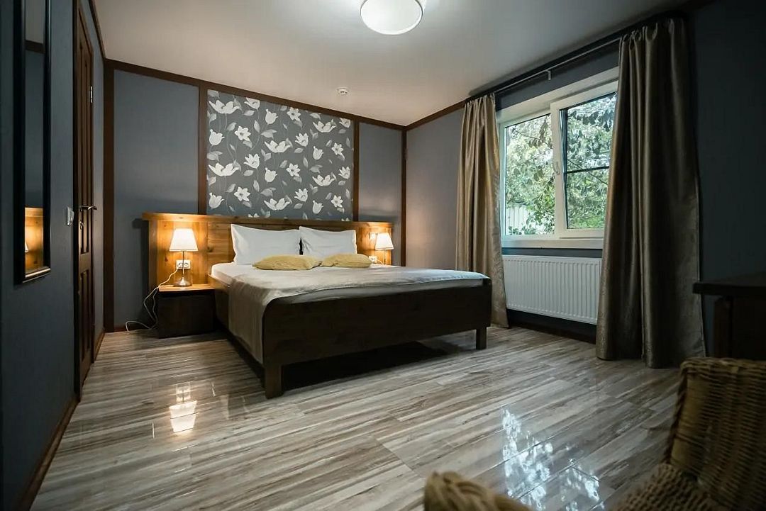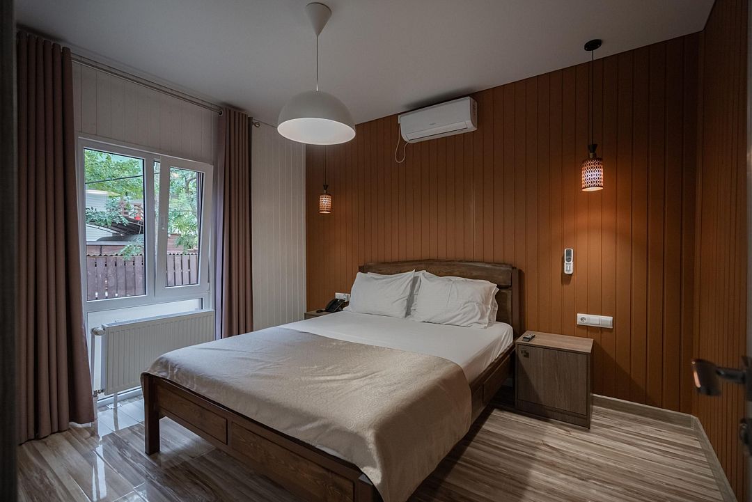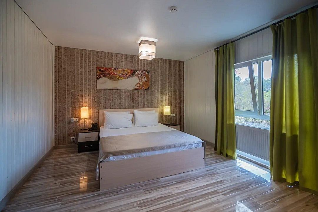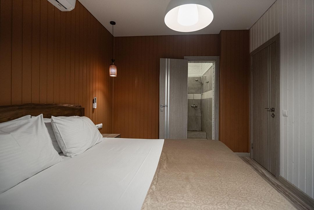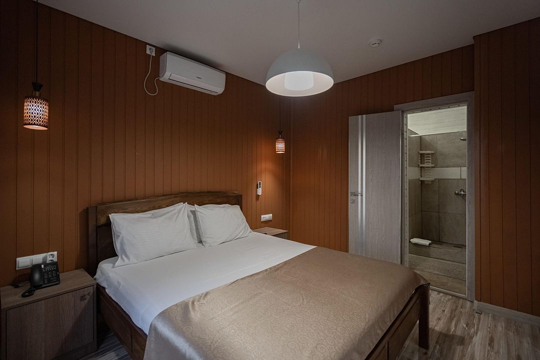 Мечтаете об спокойном, расслабленном отдыхе среди красивой природы? Забронируйте люкс в восточном стиле. Он не только оборудован всем необходимым для комфорта, но и привлекает внимание необычным оформлением. Стены номера украшены узорами в османском стиле, а просторная кровать под балдахином так и манит прилечь. Почувствуйте себя героем сказки из «1000 и 1 ночи».