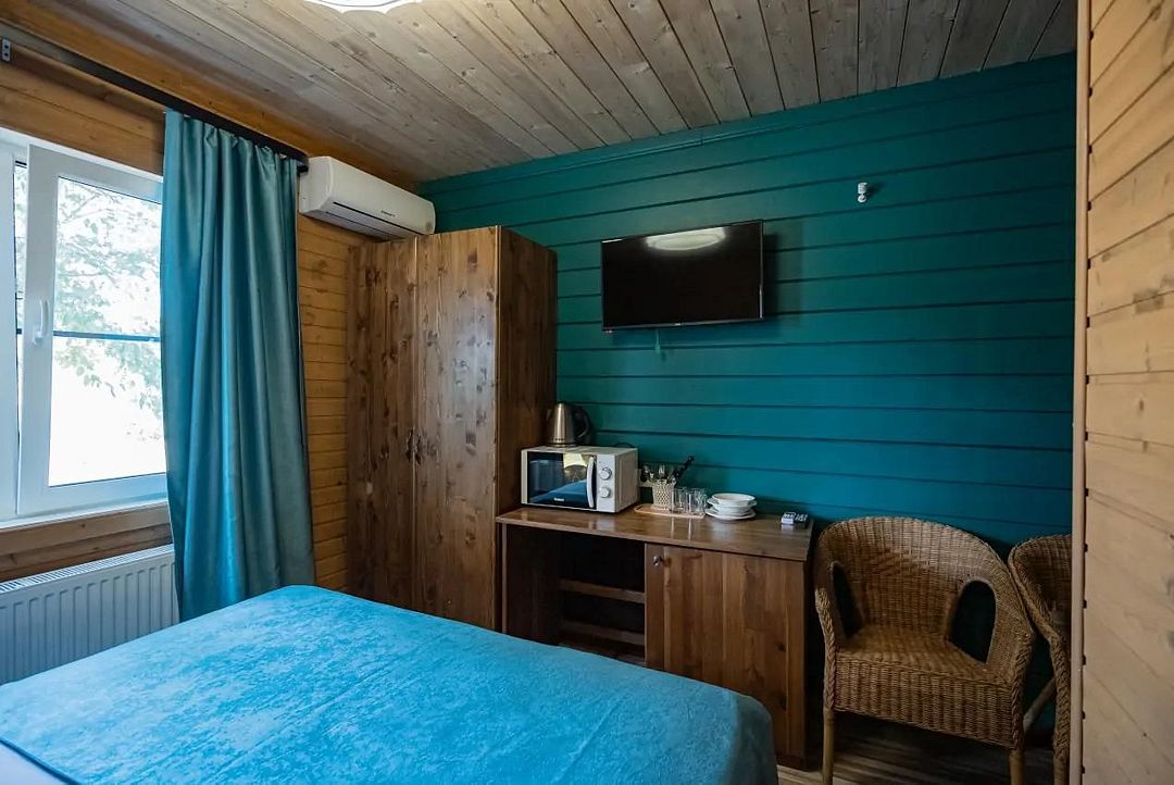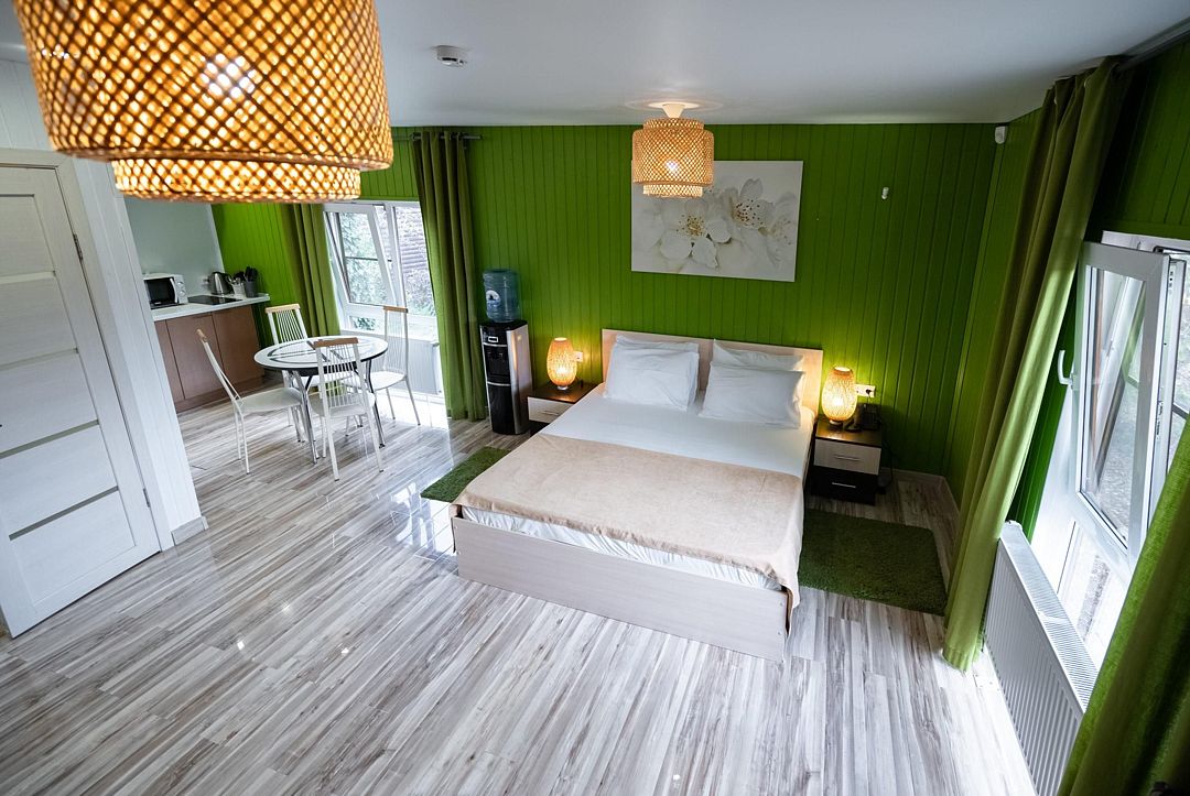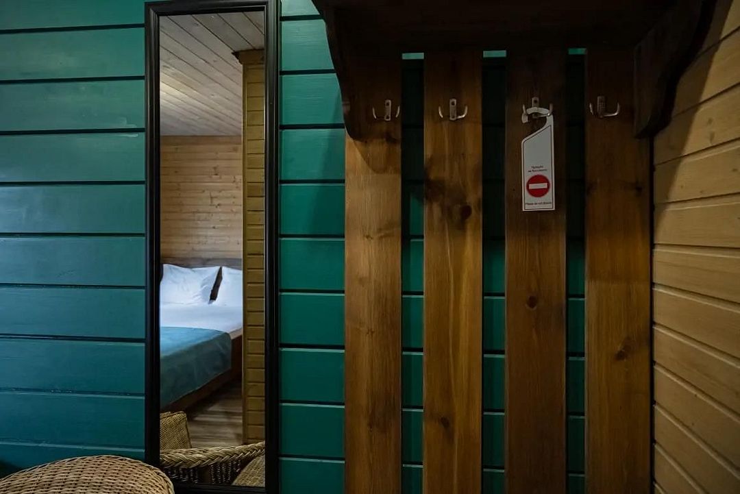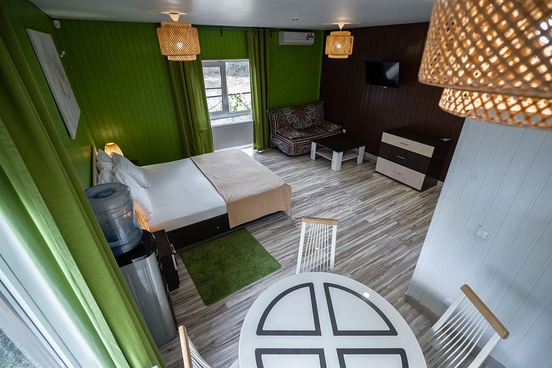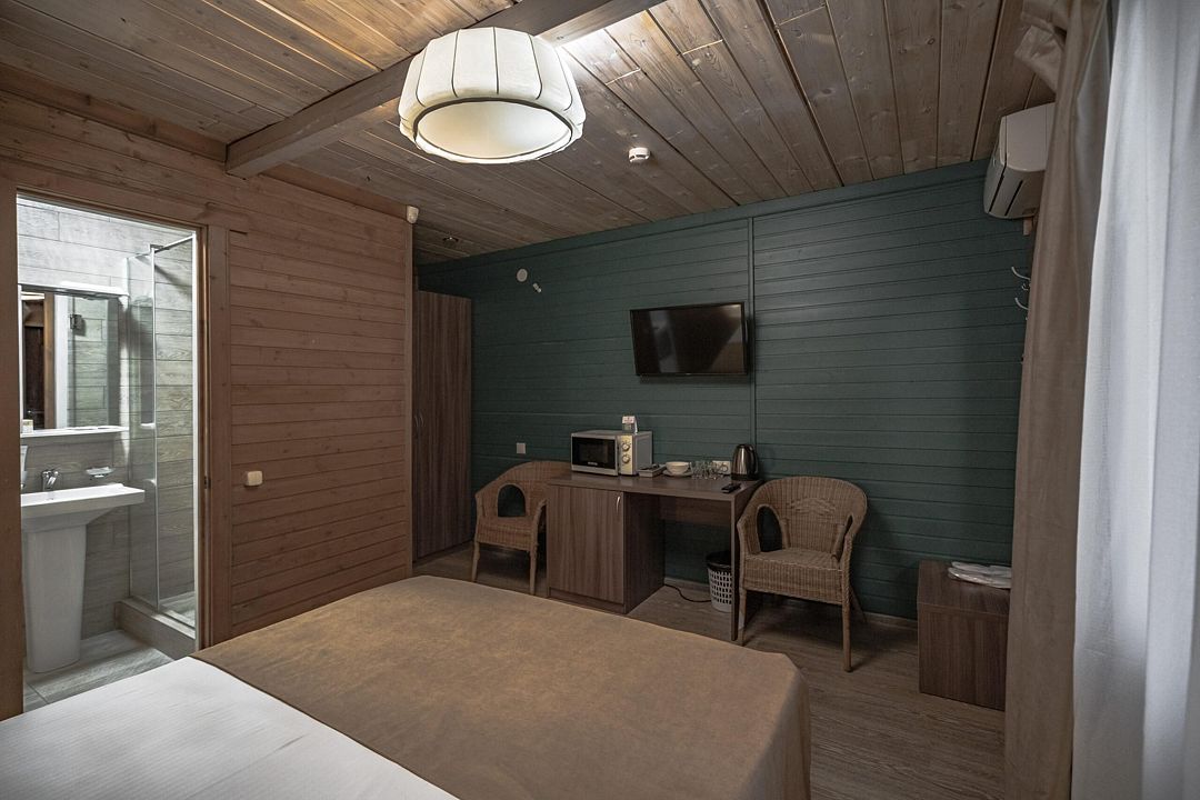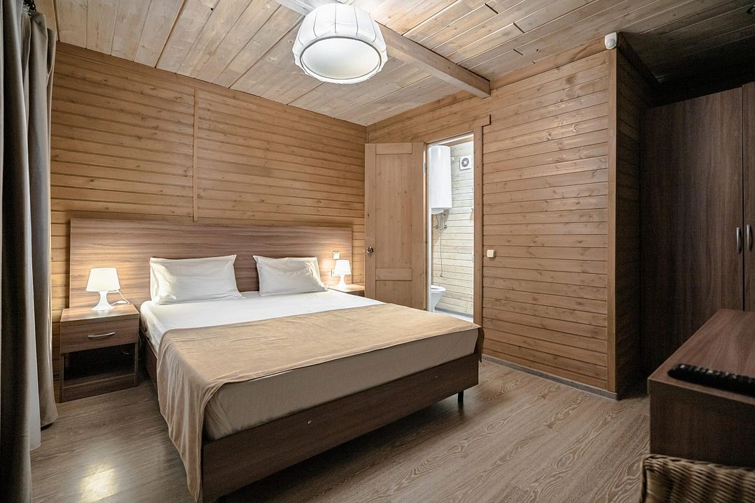 В коттедже, оформленном в эко-стиле, одна комната с двуспальной кроватью, раскладным диваном, комодом, журнальным столиком и удобная кухня с обеденным столом, кулером. Также есть прихожая со шкафом, а также собственный санузел, где есть полотенца, средства гигиены, бойлер, душ, туалет.
