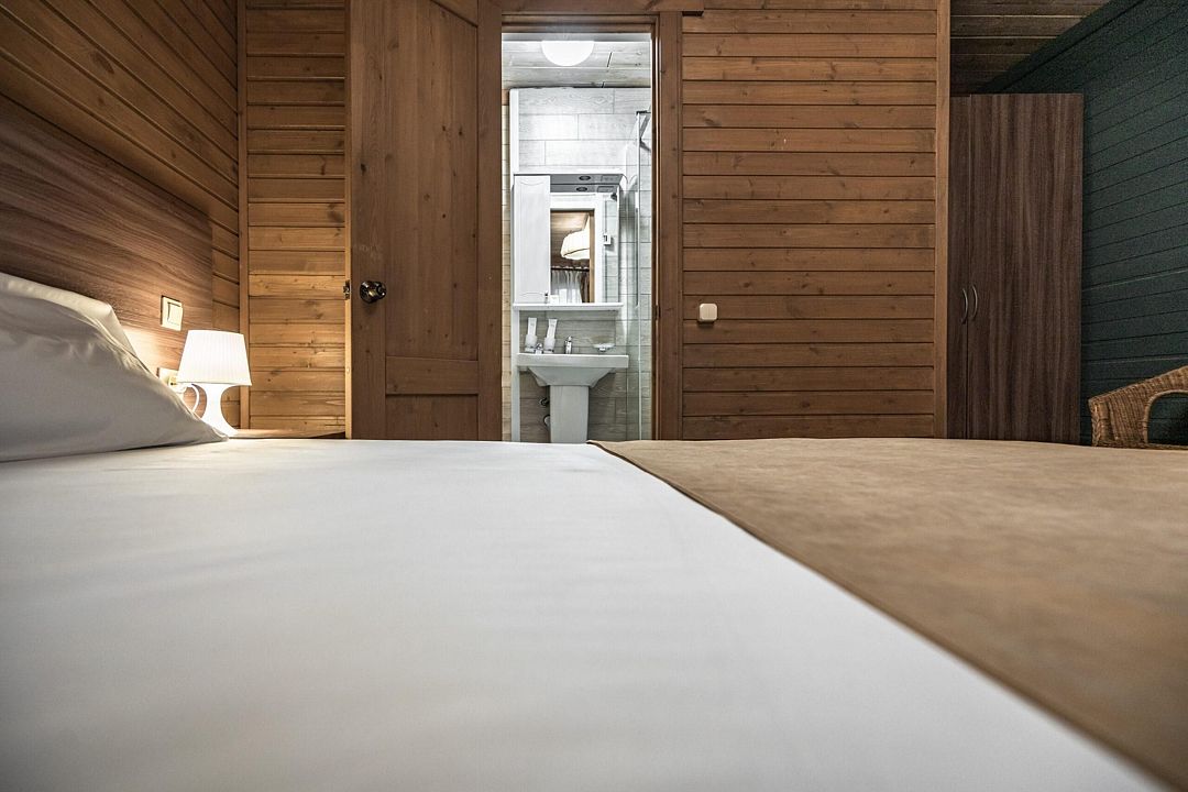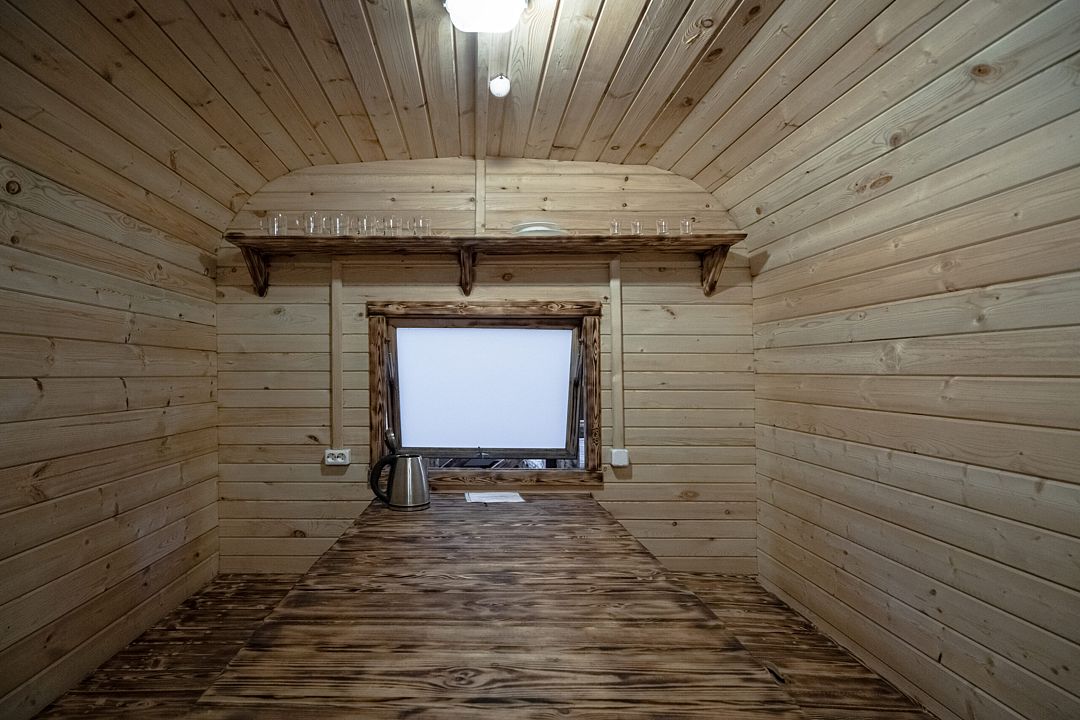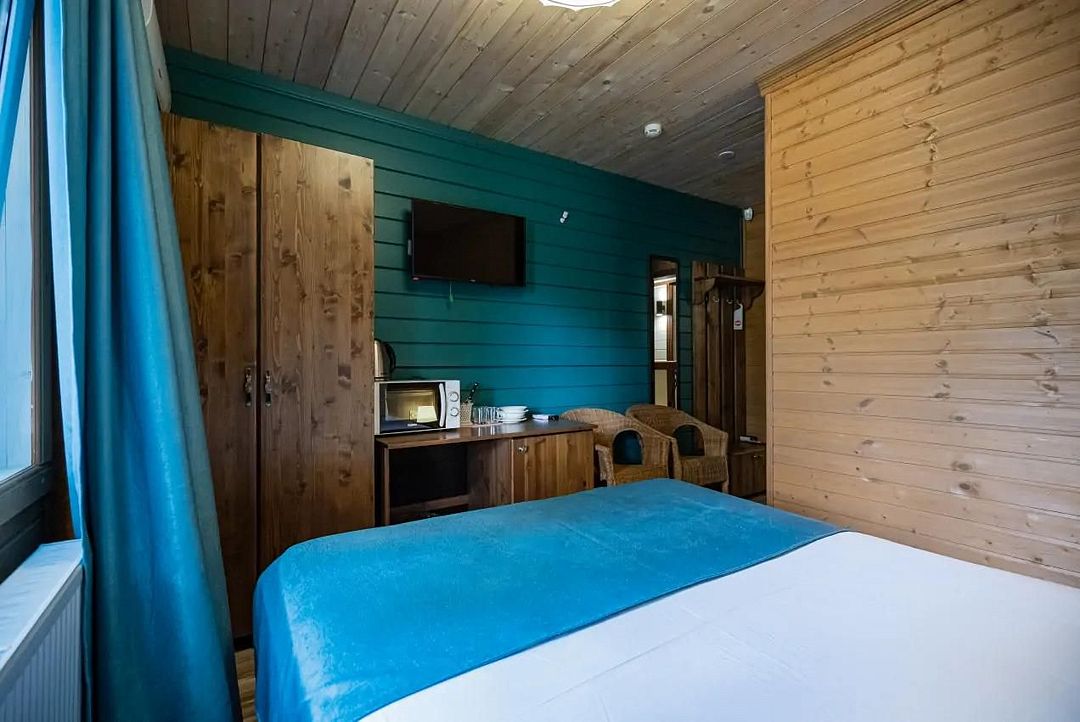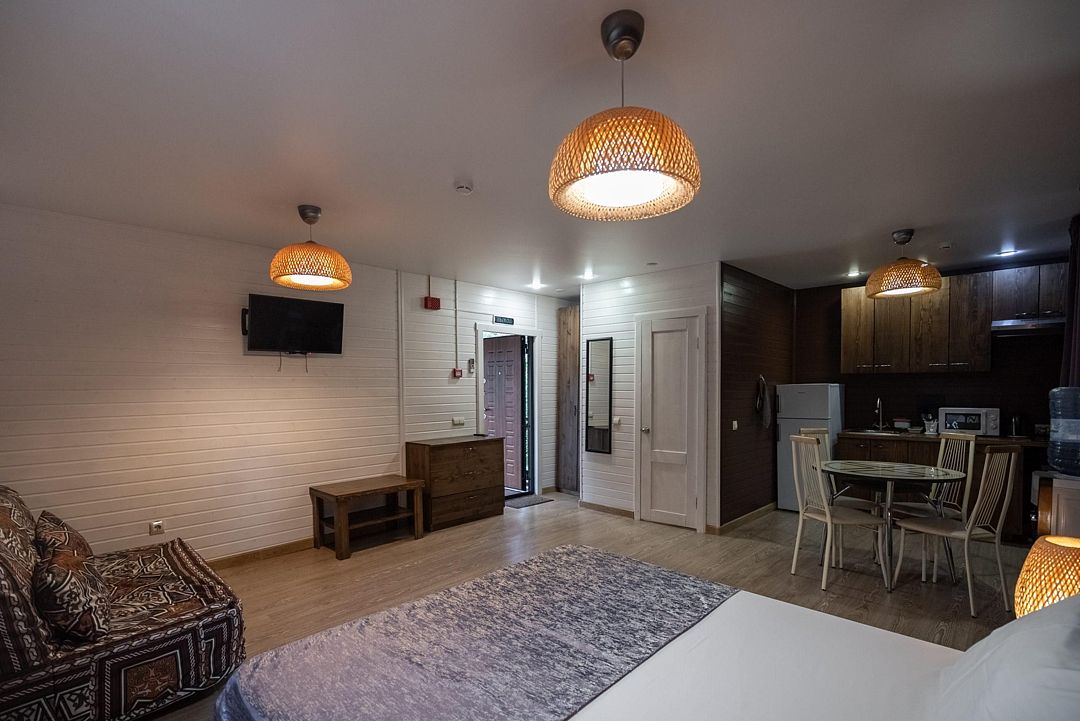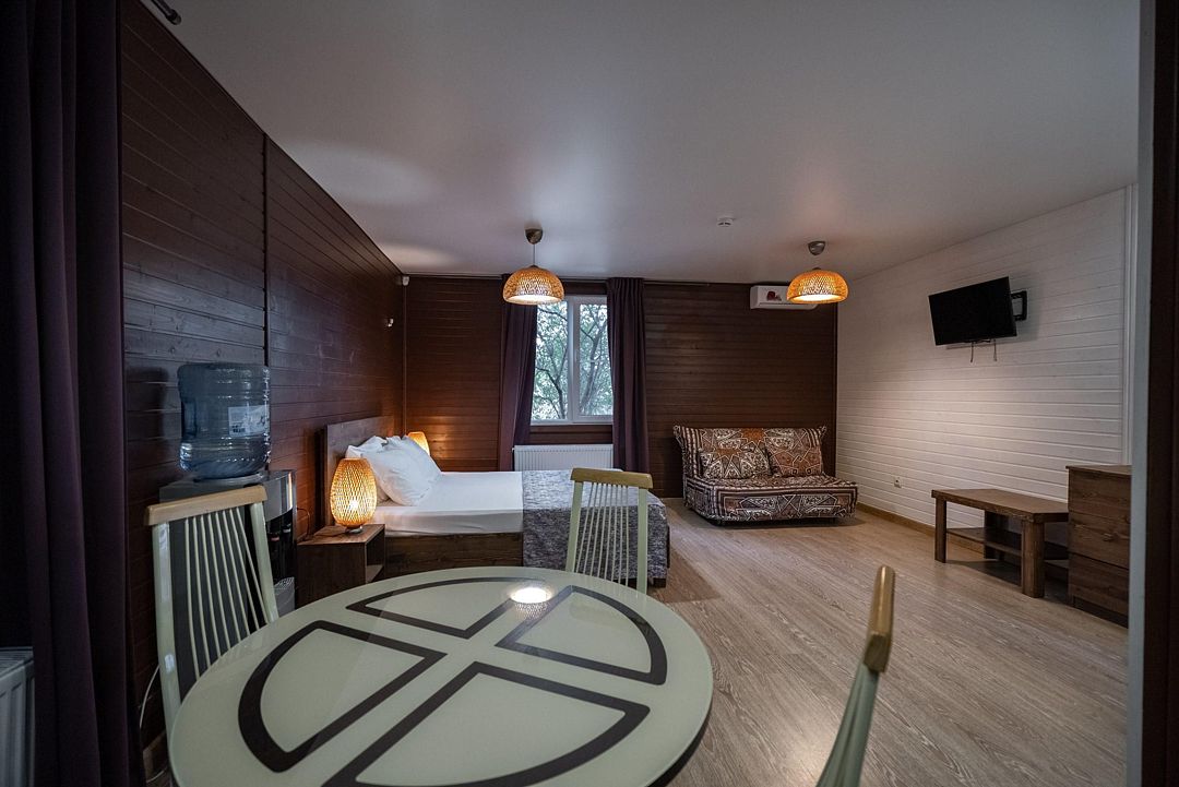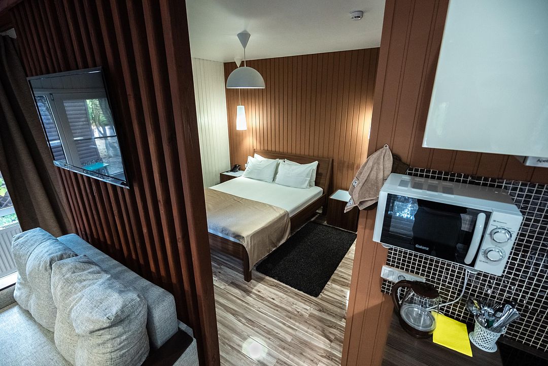 В коттедже, оформленном в эко-стиле, одна комната с двуспальной кроватью, раскладным диваном, комодом, журнальным столиком и удобная кухня с обеденным столом, кулером. Также есть прихожая со шкафом, а также собственный санузел, где есть полотенца, средства гигиены, бойлер, душ, туалет.