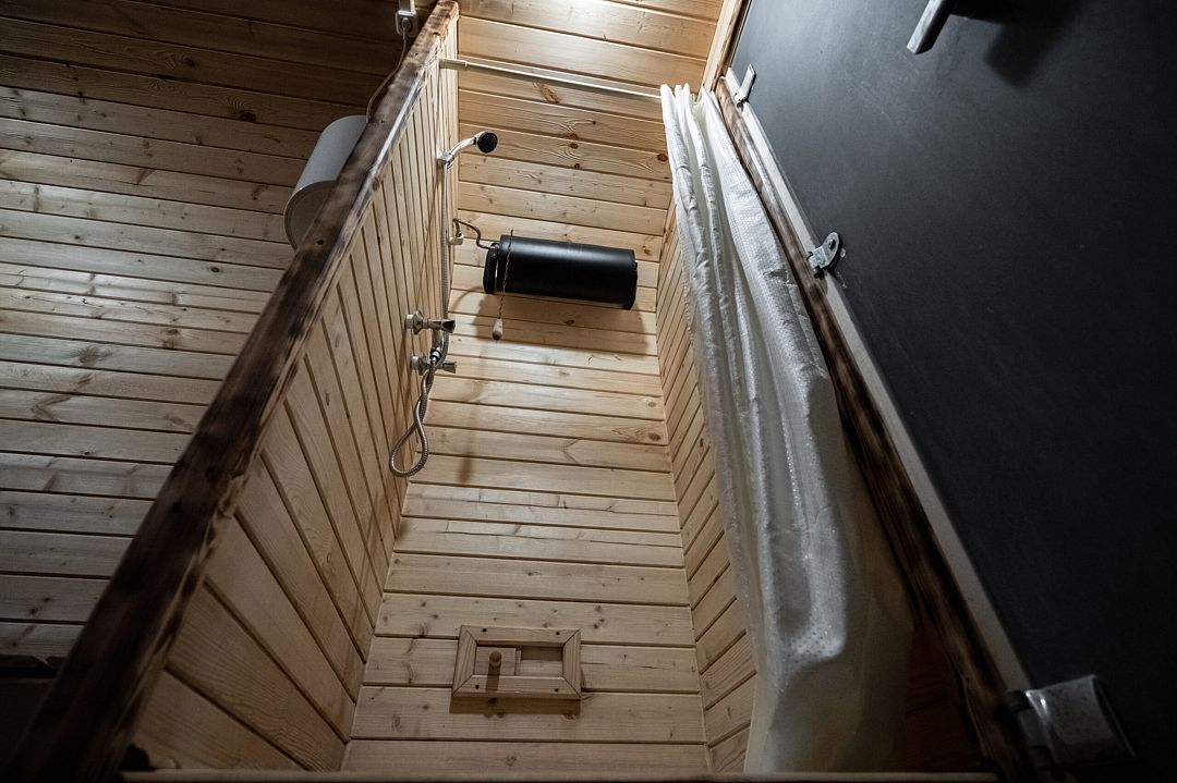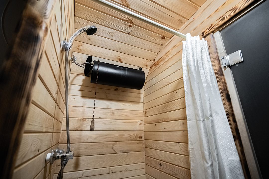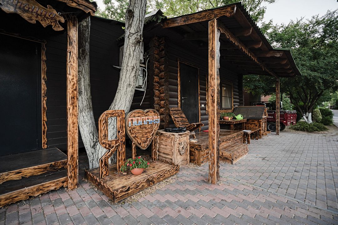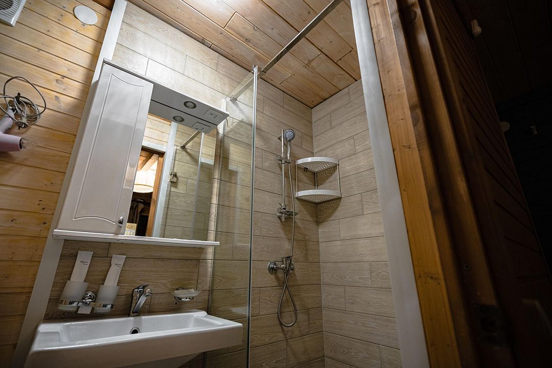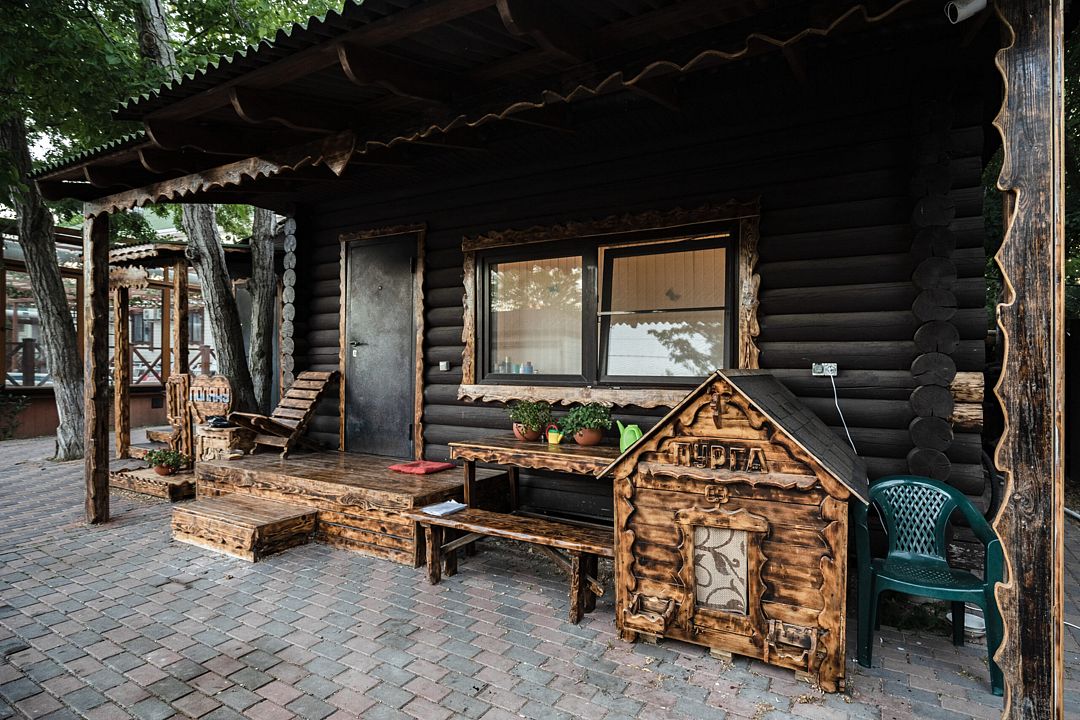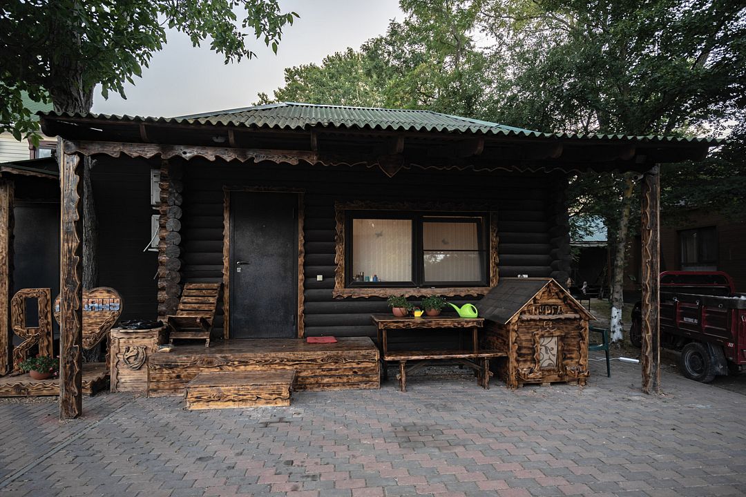 В коттедже, оформленном в эко-стиле, одна комната с двуспальной кроватью, раскладным диваном, комодом, журнальным столиком и удобная кухня с обеденным столом, кулером. Также есть прихожая со шкафом, а также собственный санузел, где есть полотенца, средства гигиены, бойлер, душ, туалет.