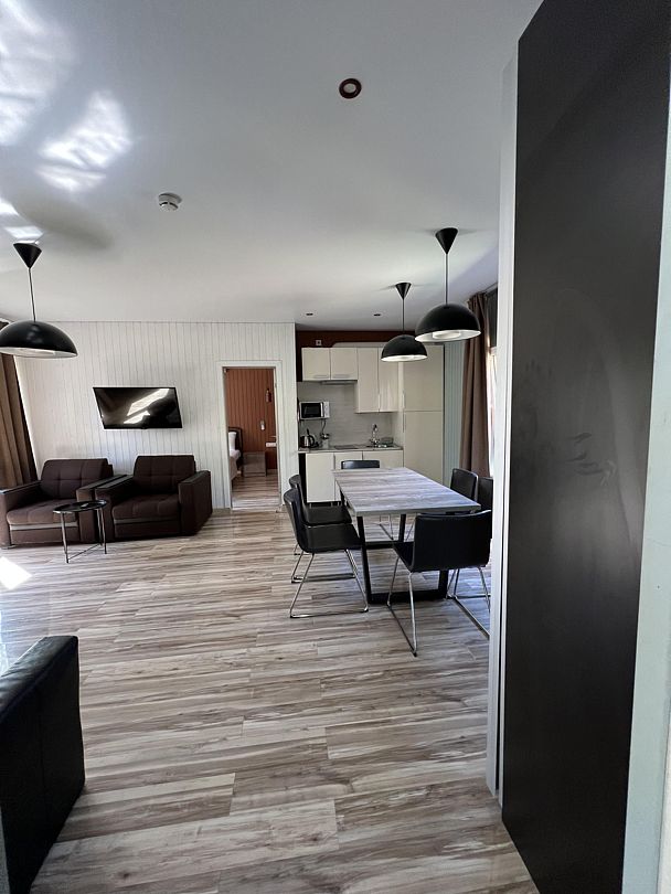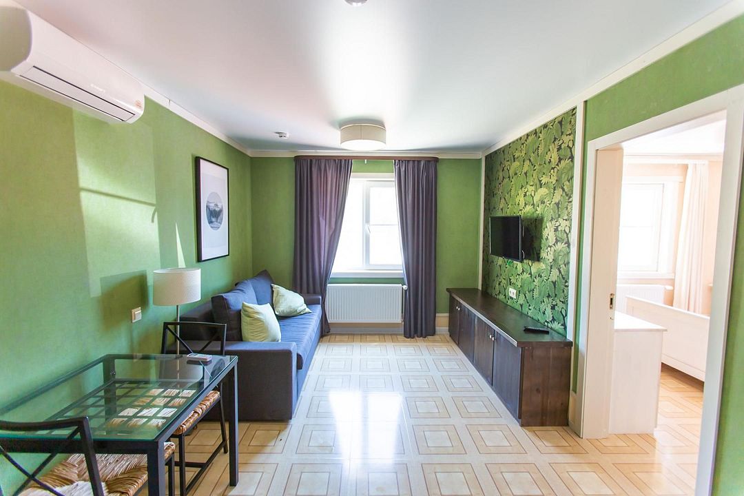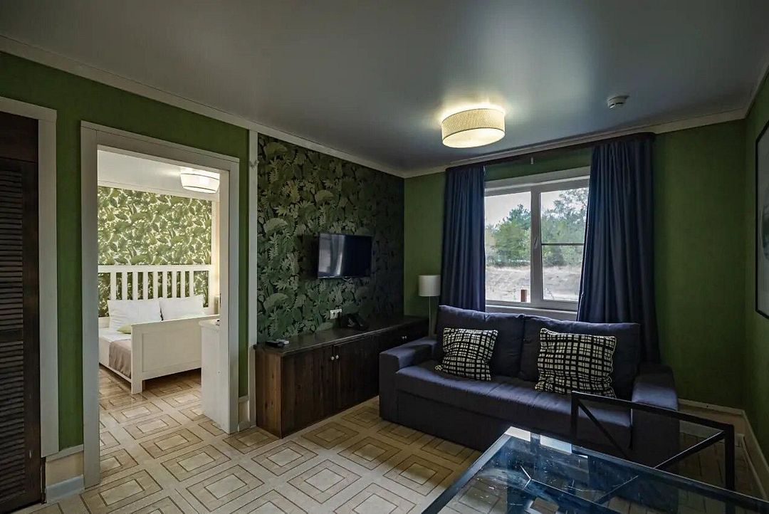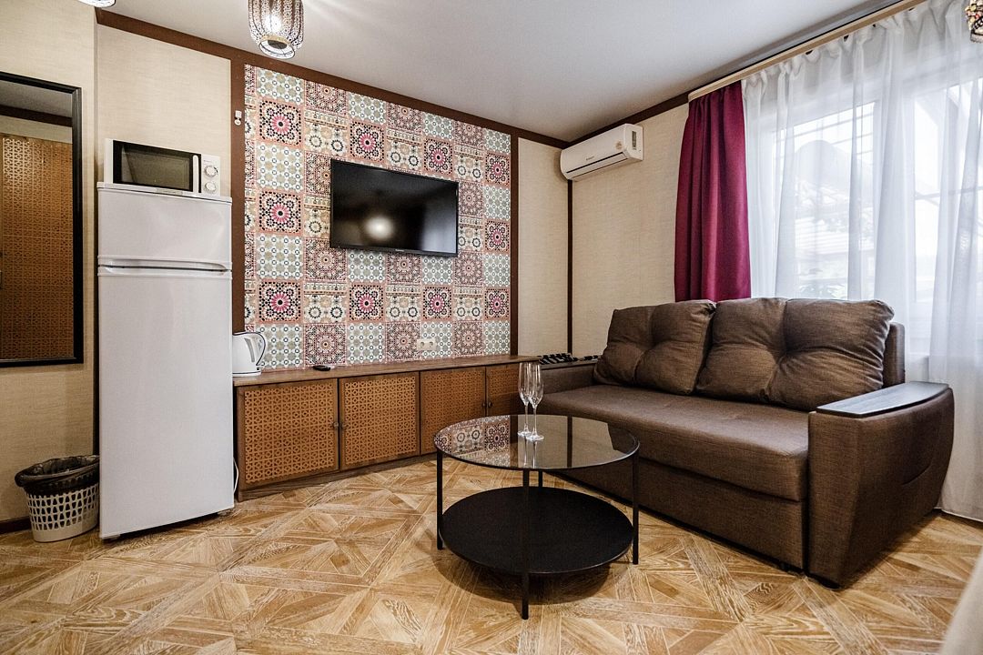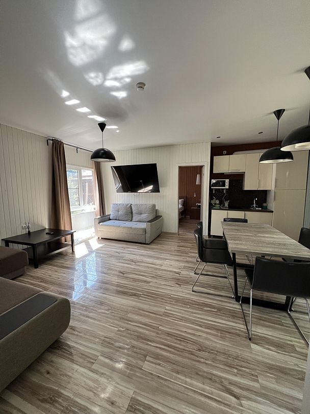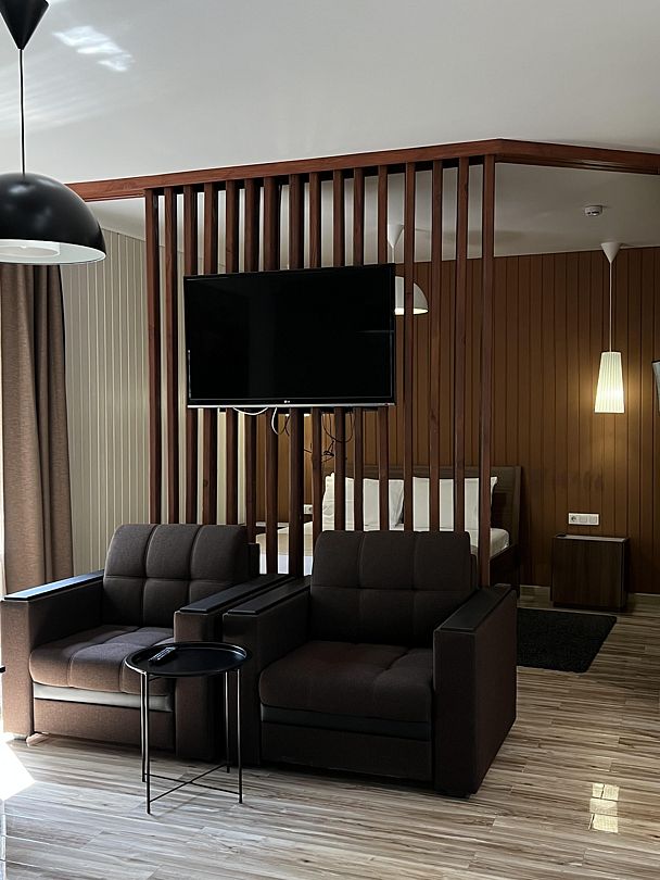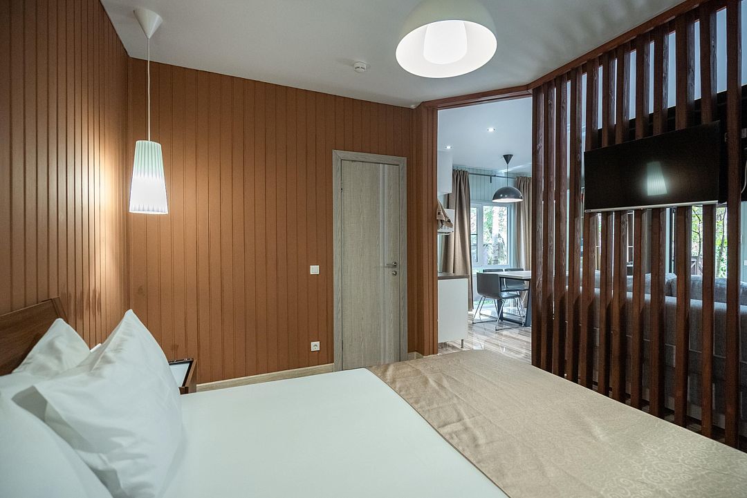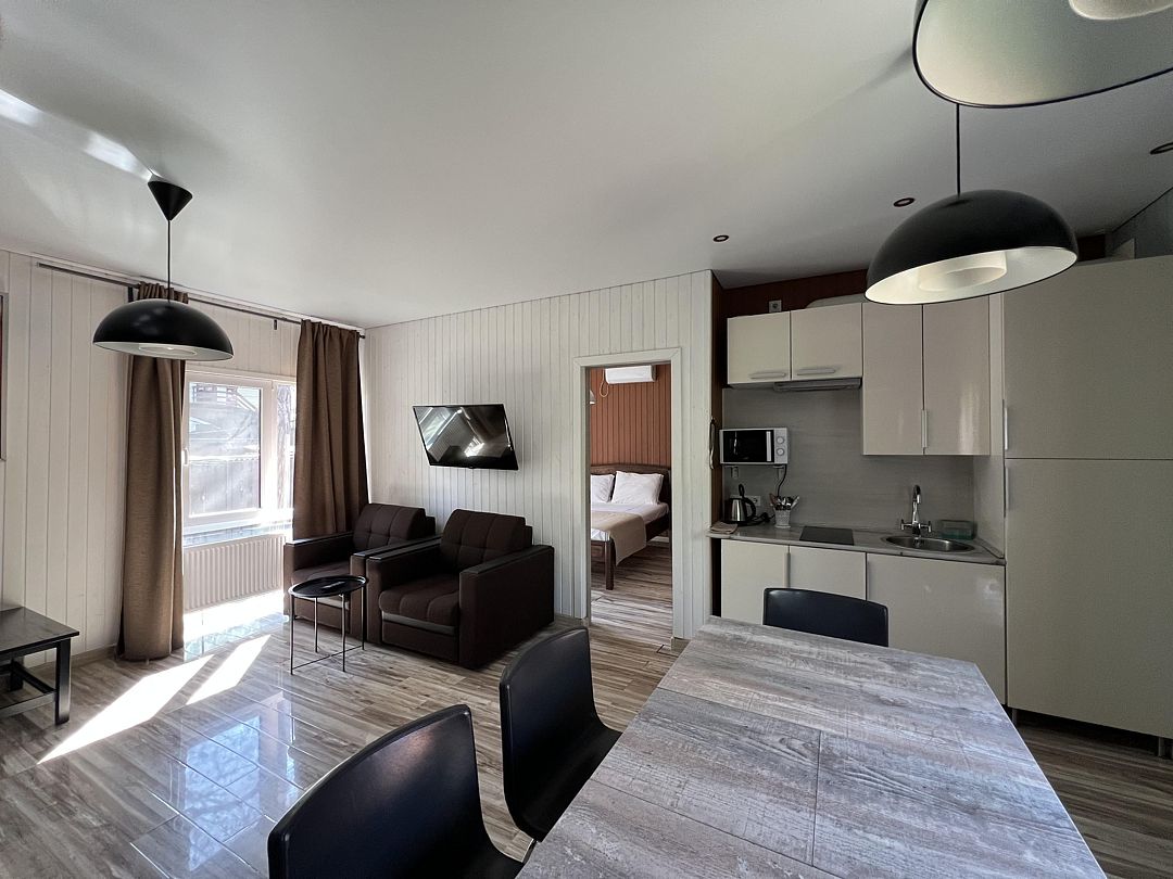 Удобный номер для семьи от 2-х до 4-х человек. Две комнаты позволят разместиться с комфортом. Одна из них спальня, в ней санузел. Вторая комната – гостиная с раскладным диваном и обеденной зоной.
