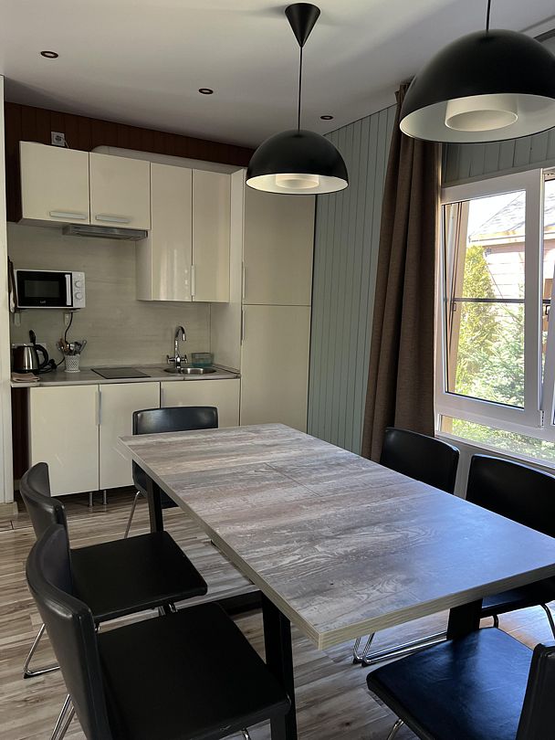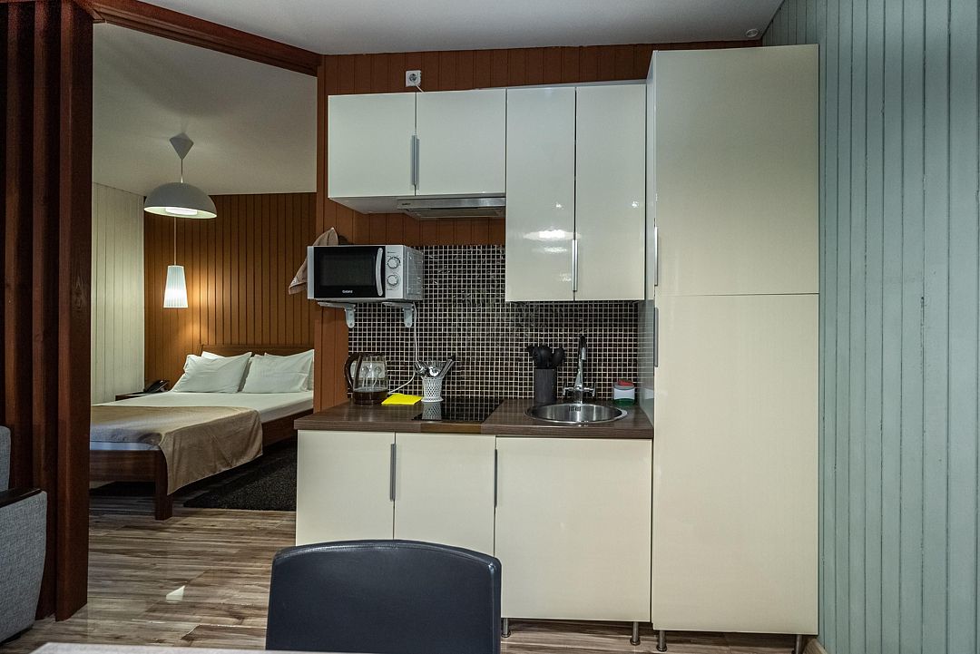 Кухня и обеденная зона расположены в гостиной. Здесь вы найдёте всю необходимую посуду, приборы и электрическую плиту для приготовления пищи.