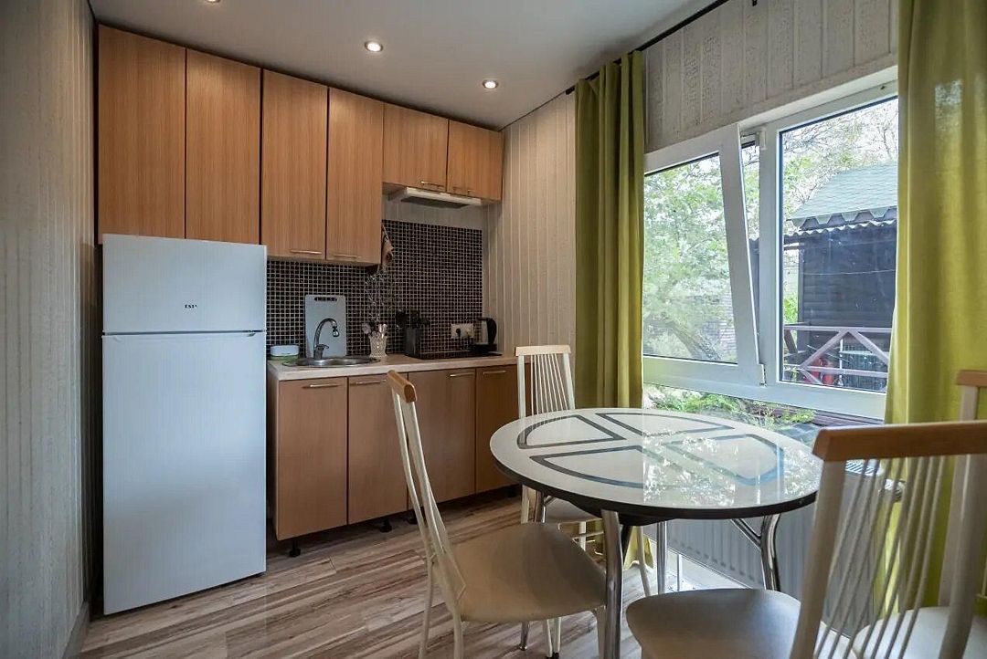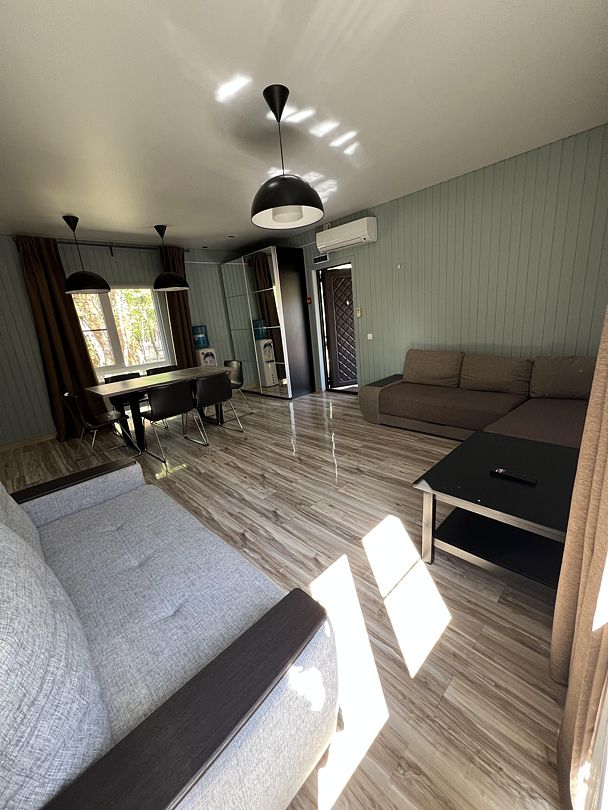 Большой коттедж для семьи или компании до 6 человек позволяет почувствовать себя как дома. Светлый, уютный, он выдержан в современном стиле. Здесь есть все, что нужно для комфортного отпуска — кухонный уголок, просторная кровать, удобный диваны для сна и 2 кресла-кровати, а также большой обеденный стол, где легко поместится вся компания. Окно пропускает достаточно света, а сплит-система обеспечивает комфортную температуру в комнате. Если же вы любите подольше поспать, просто закройте шторы и ни один солнечный луч не побеспокоит вас. Кроме того, в вашем распоряжении небольшая терраса и мангал для вкусного барбекю.