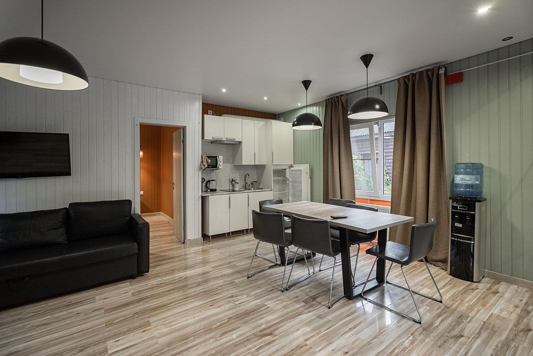 В доме две комнаты: одна — спальня с двуспальной кроватью и санузлом, а вторая — гостиная с кухней, обеденной зоной и двумя раскладными диванами или, вместо 1 дивана 2 раскладных кресла-кровати (на выбор, уточнять наличие у администратора). Спальных мест — 5 + 1 (взрослые) или с детьми любой вариант, до 6 человек.