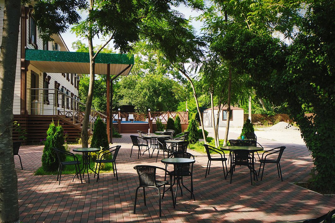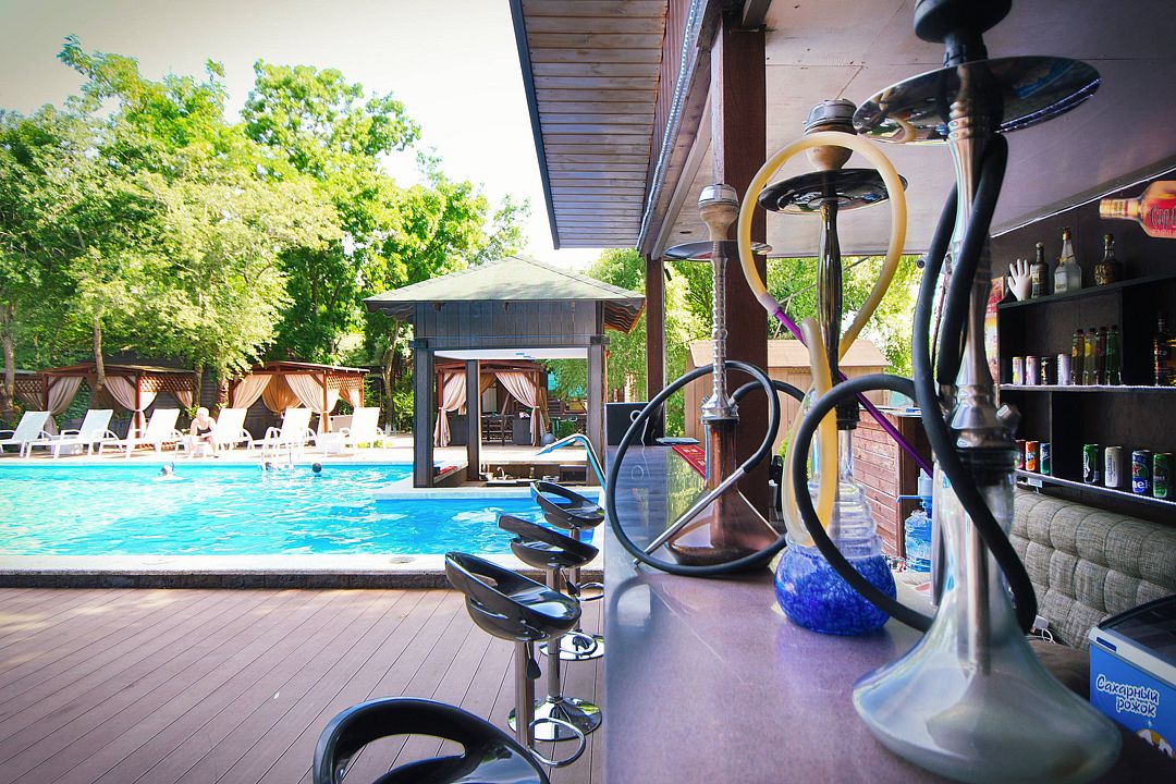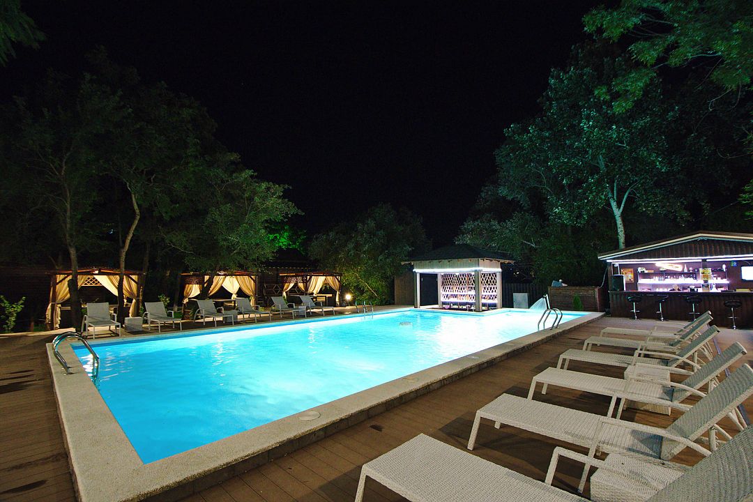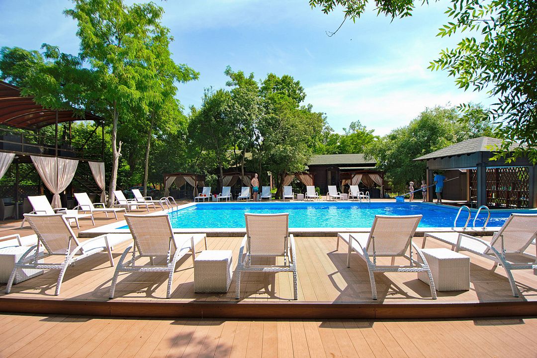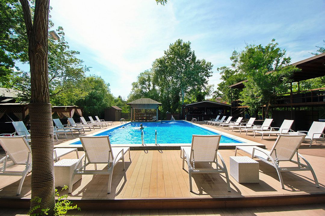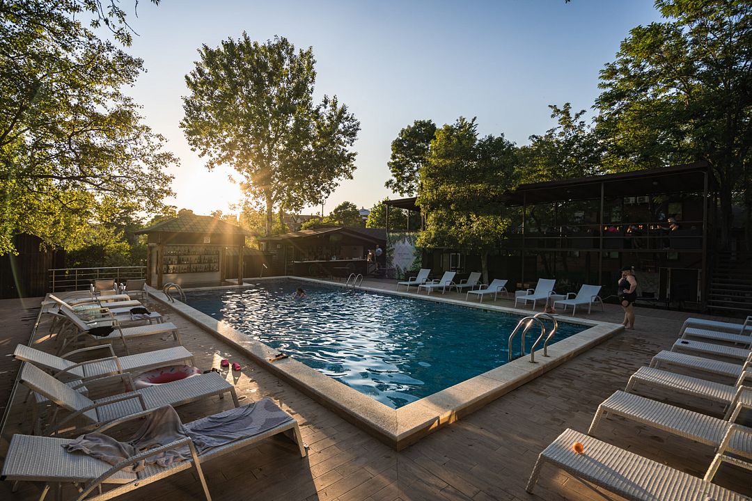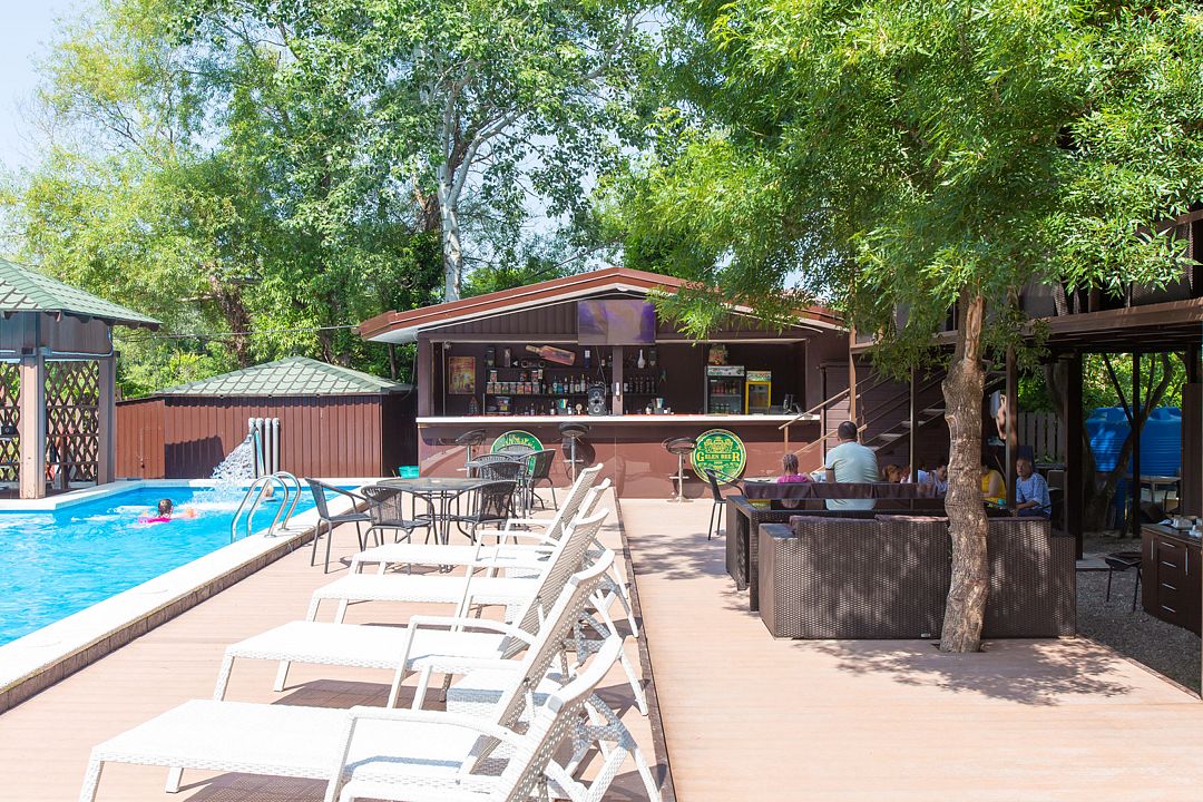 На территории отеля в распоряжении гостей два бассейна, один из которых оборудован детской зоной для плавания. Для комфортного отдыха — две чилаут зоны с современной ротанговой мебелью и лежаками, кафе-бар с широким выбором блюд европейской кухни и прохладительными напитками, мини-беседки. Для самостоятельного приготовления пищи имеется общая летняя кухня, оборудованная всем необходимым (посуда, холодильники и т.д.).
