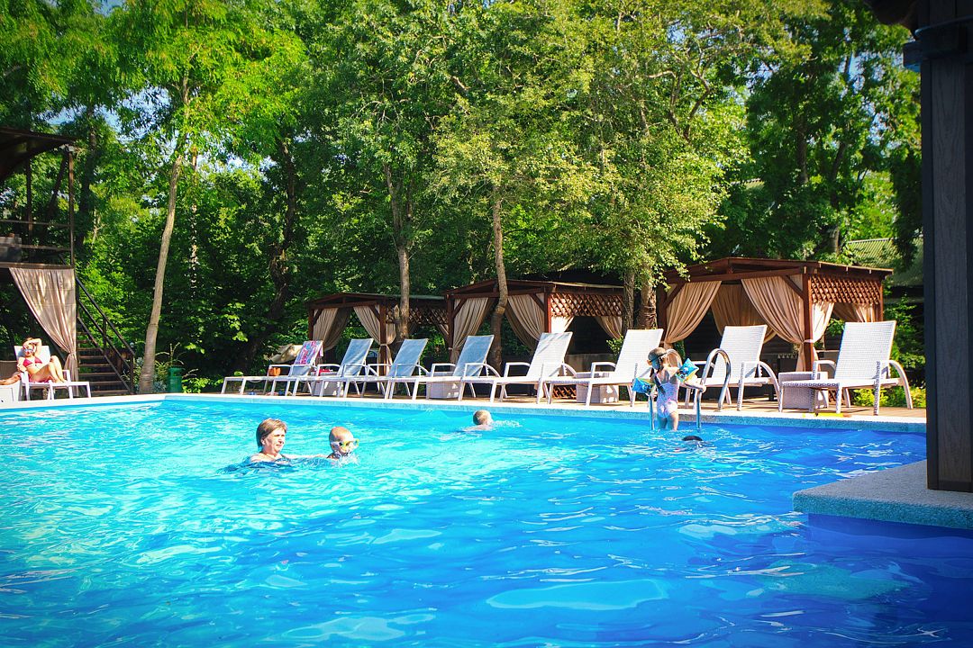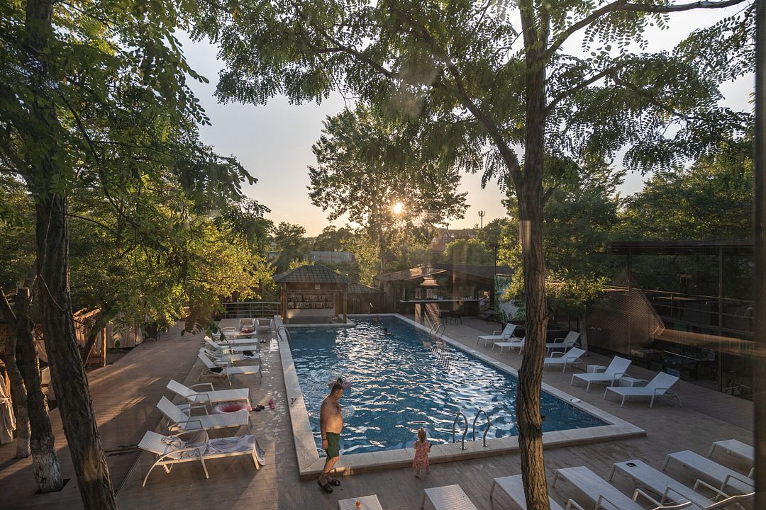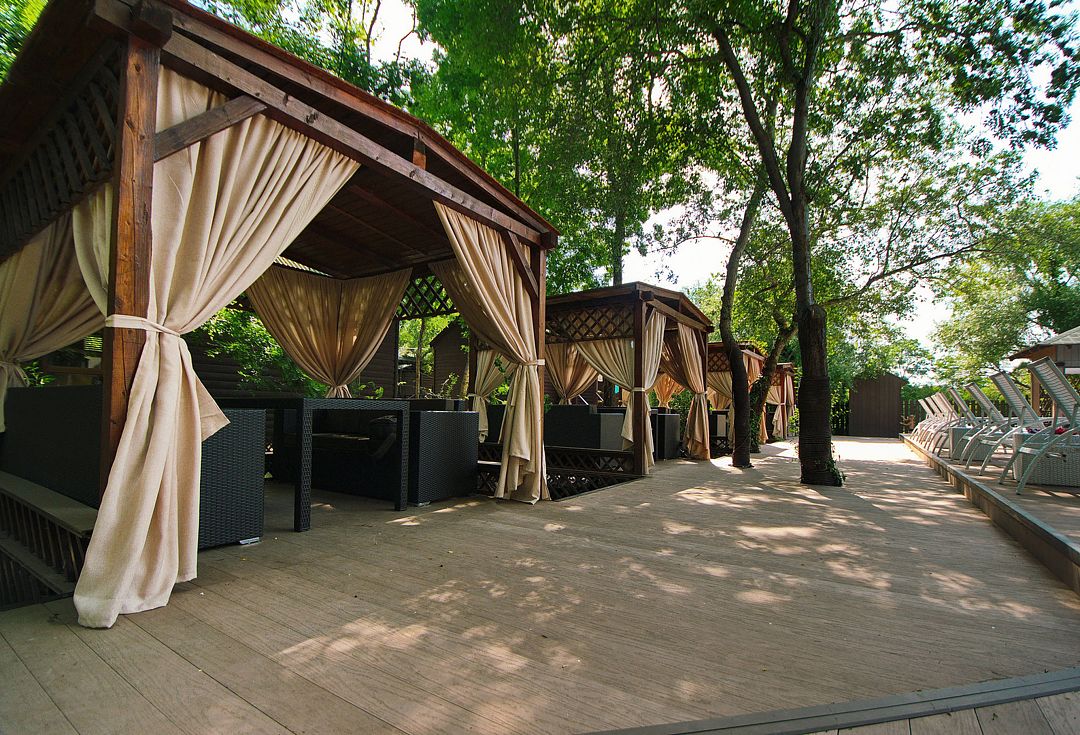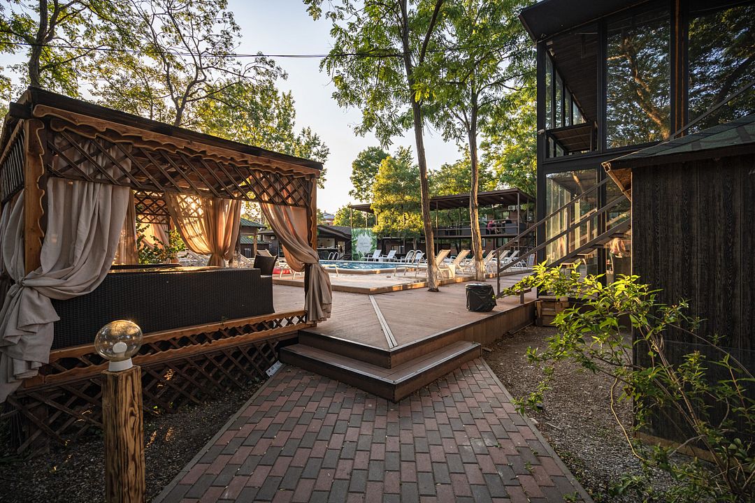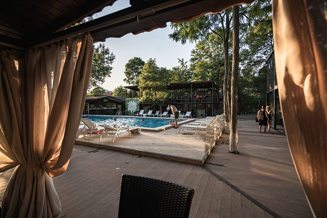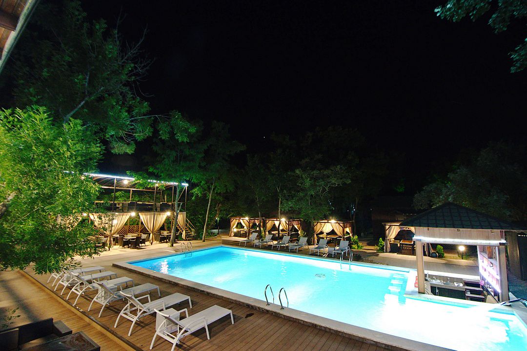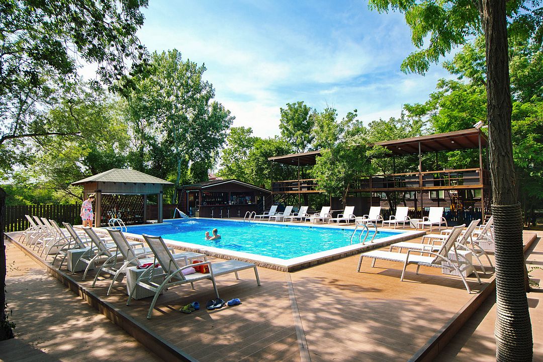 На территории отеля в распоряжении гостей два бассейна, один из которых оборудован детской зоной для плавания. Для комфортного отдыха — две чилаут зоны с современной ротанговой мебелью и лежаками, кафе-бар с широким выбором блюд европейской кухни и прохладительными напитками, мини-беседки. Для самостоятельного приготовления пищи имеется общая летняя кухня, оборудованная всем необходимым (посуда, холодильники и т.д.).