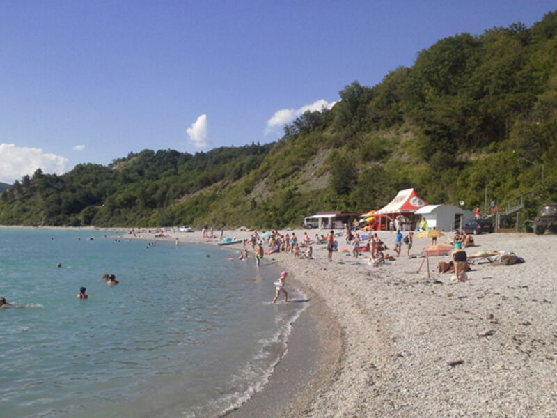 Пляж расположен 400 метрах от базы отдыха. Бухта Инал славится чистым морем особенного лазурного оттенка, удобным и просторным пляжем из мелкой гальки. За дополнительную плату можно взять пляжное оборудование. Вечером на пляже проводится дискотека.