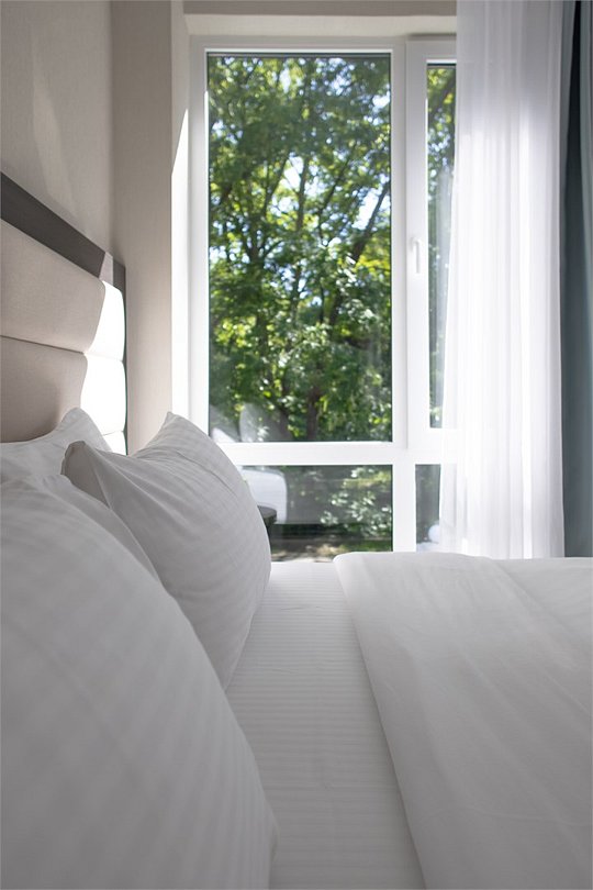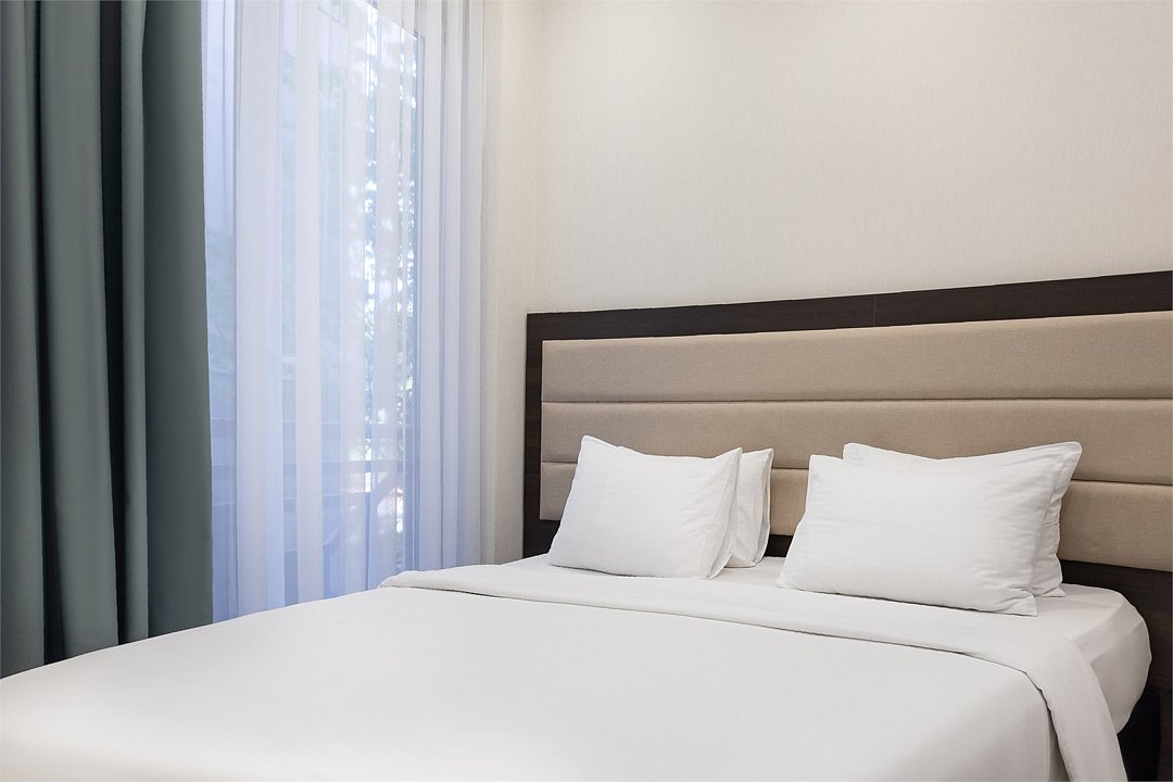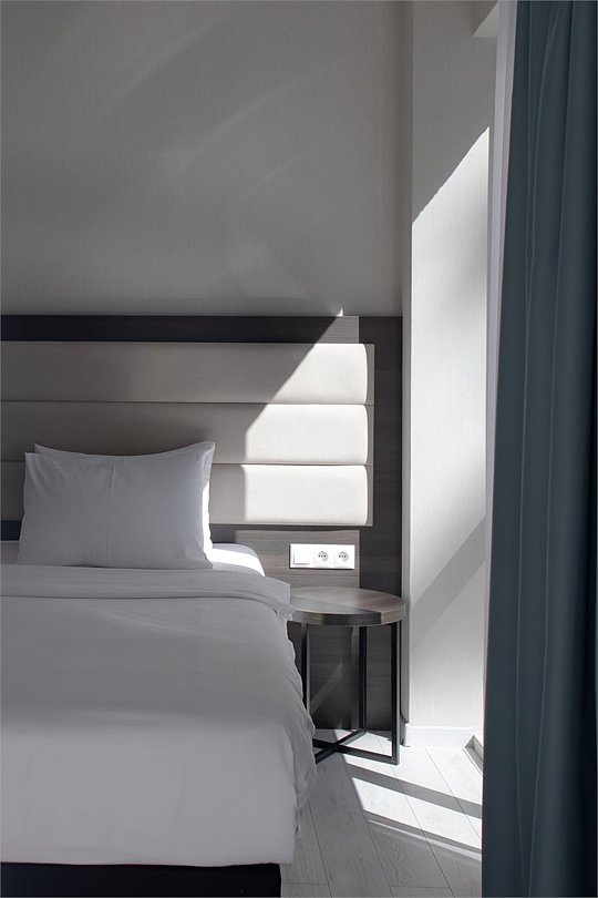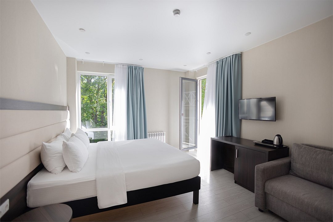 Однокомнатный номер с двумя раздельными кроватями размером 80*200 и дополнительным спальным местом, раскладное кресло 80*200. Номер оборудован балконом, письменным столом, телевизором и сплит-системой. Есть чайная станция и мини-бар. В прихожей находится большой шкаф для одежды, зеркало с обувной полкой и вешалкой. Санузел включает полотенцесушитель, душевую и зеркало с подсветкой.Услуги и удобства
