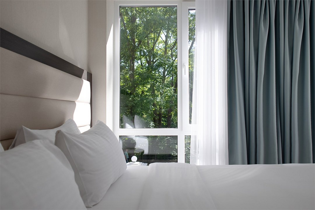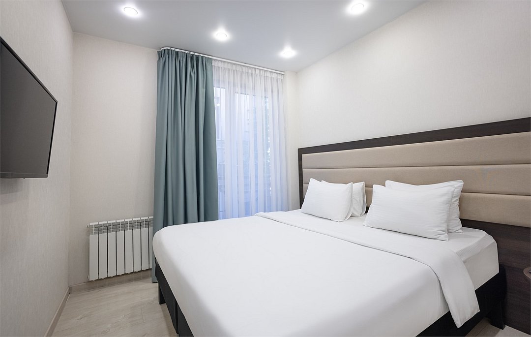 Однокомнатный номер с зонированием, разделен перегородкой. В номере расположены двуспальная кровать 160*200 и раскладной диван 160*200. Имеется два телевизора и письменный стол. Есть чайная станция и мини-бар. В прихожей находится большой шкаф для одежды, зеркало и обувная полка с вешалкой. Санузел оснащен душевой, полотенцесушителем и зеркалом с подсветкой. Номер имеет два выхода на балкон.Услуги и удобства