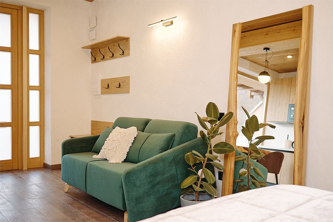 Апартамент на 2 этаже с удобной кроватью и раскладывающимся диваном, а также с современной оборудованной кухней. В ванной комнате душевая кабина и стиральная машина. Номер наполнен качественной мебелью. Здание построено с использованием современных отделочных материаловУслуги и удобства