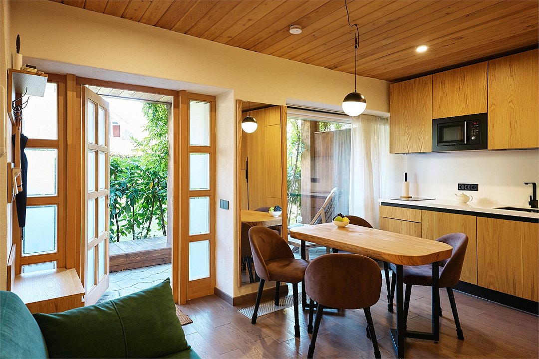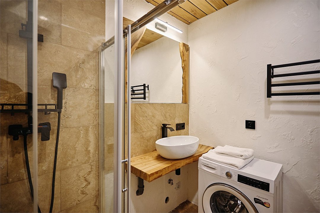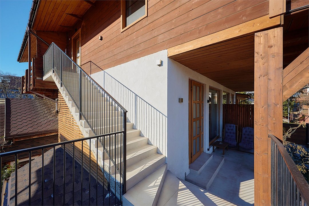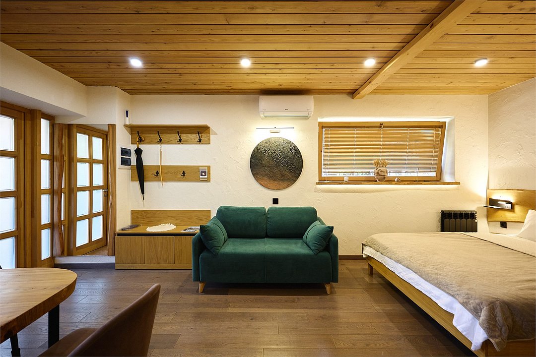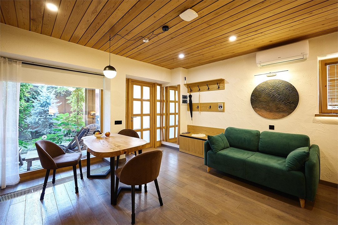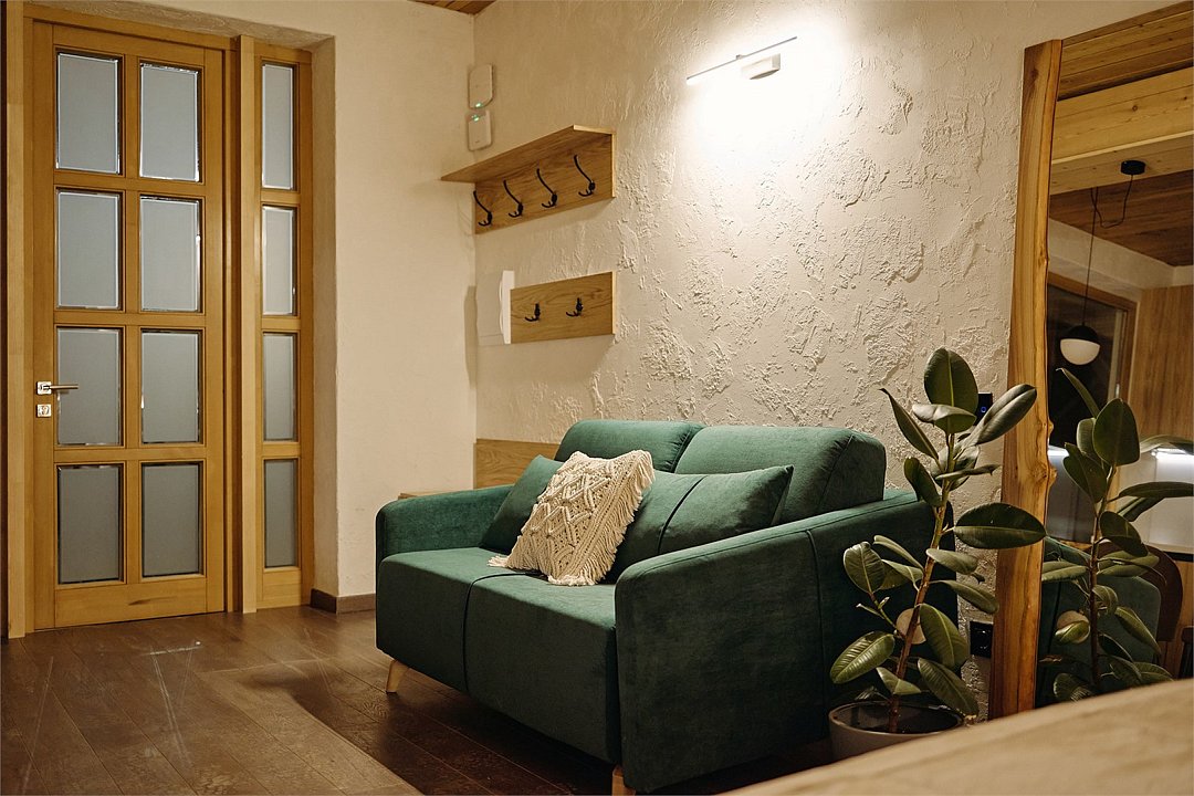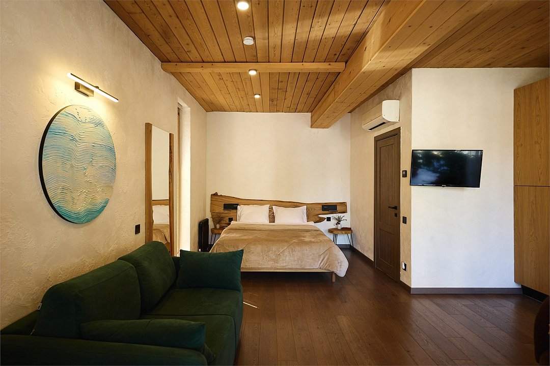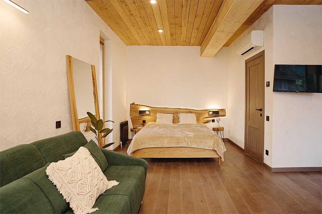 Апартамент на 2 этажа с удобной кроватью и раскладывающимся диваном, а также с современной оборудованной кухней. Душевая кабина и стиральная машина. Номер наполнен качественной мебелью. Здание построено с использованием современных отделочных материалов.Услуги и удобства