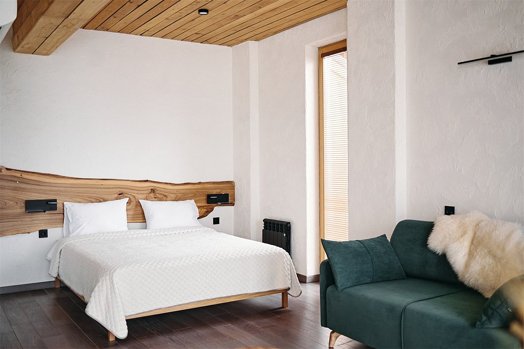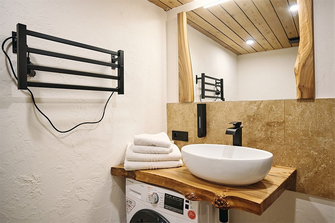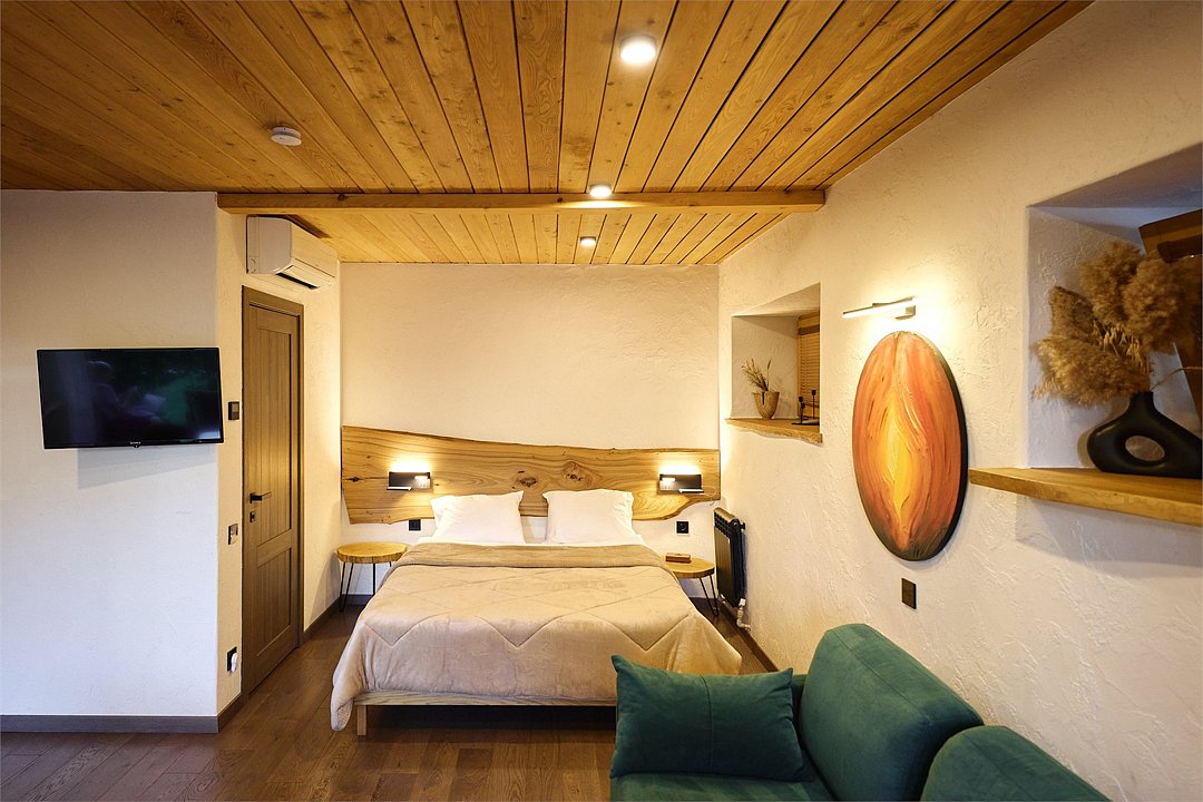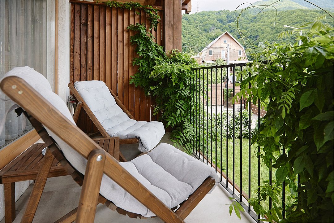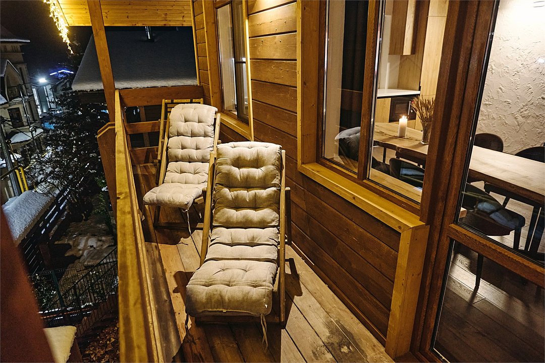 Просторные апартаменты для большой компании на 3 этаже 80 кв. м, с мансардным высоким потолком, панорамными окнами и длинным балконом. В распоряжении Гостей роскошная гостиная-кухня и две изолированные спальни, 2 санузла с душевыми кабинами и стиральной машиной. В каждой спальне двуспальная кровать, в гостиной раскладывающийся диван. Есть также секретное спальное место для "Карлсона". Кухня оборудована варочной панелью, микроволновой печью и посудомоечной машиной, есть чайник и вся необходимая посуда. ДУХ возвышается над окрестностями, в номере много света, открывается прекрасный вид на горы и лесУслуги и удобства