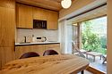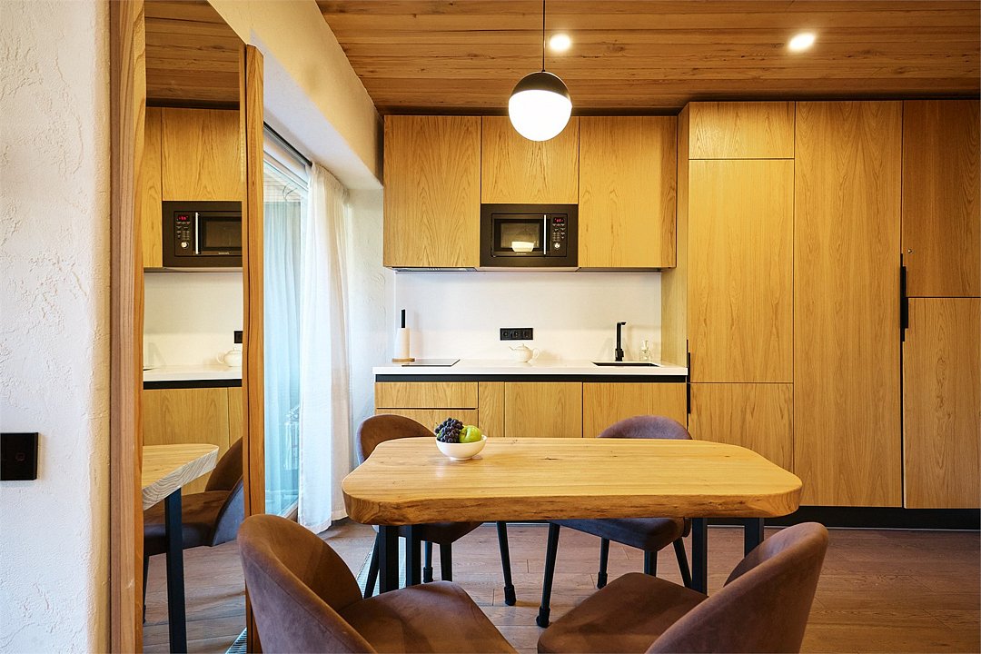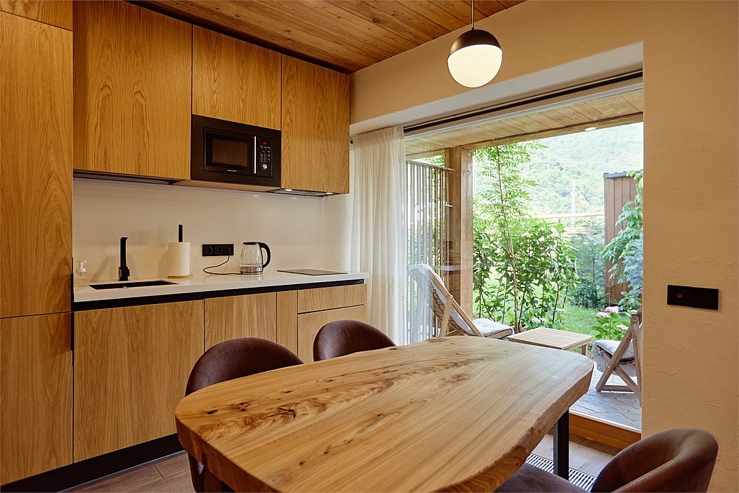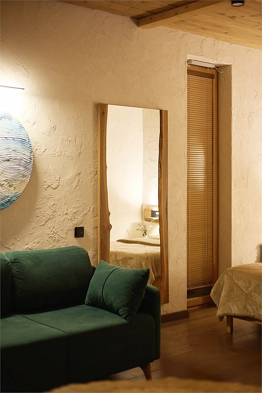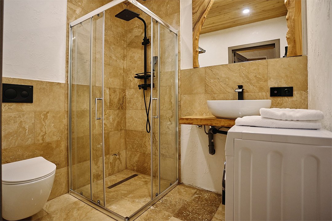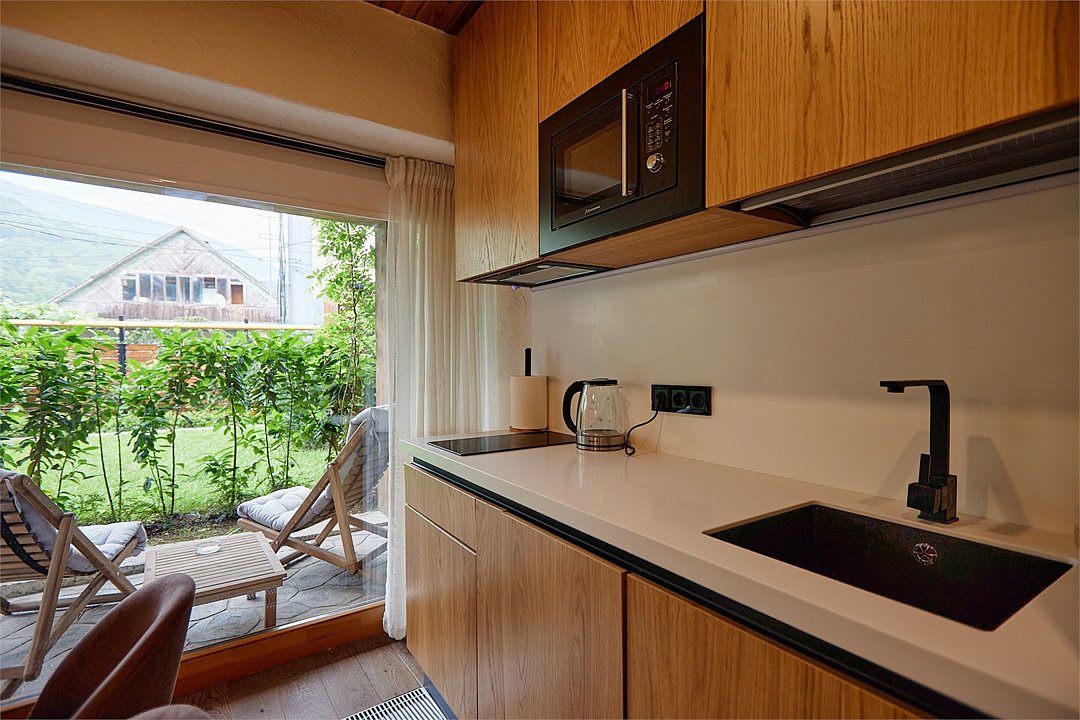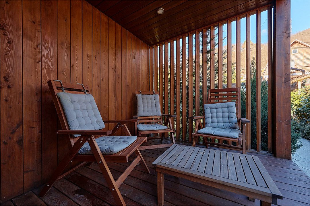 Просторные апартаменты для большой компании на 3 этаже 80 кв. м, с мансардным высоким потолком, панорамными окнами и длинным балконом. В распоряжении Гостей роскошная гостиная-кухня и две изолированные спальни, 2 санузла с душевыми кабинами и стиральной машиной. В каждой спальне двуспальная кровать, в гостиной раскладывающийся диван. Есть также секретное спальное место для "Карлсона". Кухня оборудована варочной панелью, микроволновой печью и посудомоечной машиной, есть чайник и вся необходимая посуда. ДУХ возвышается над окрестностями, в номере много света, открывается прекрасный вид на горы и лесУслуги и удобства