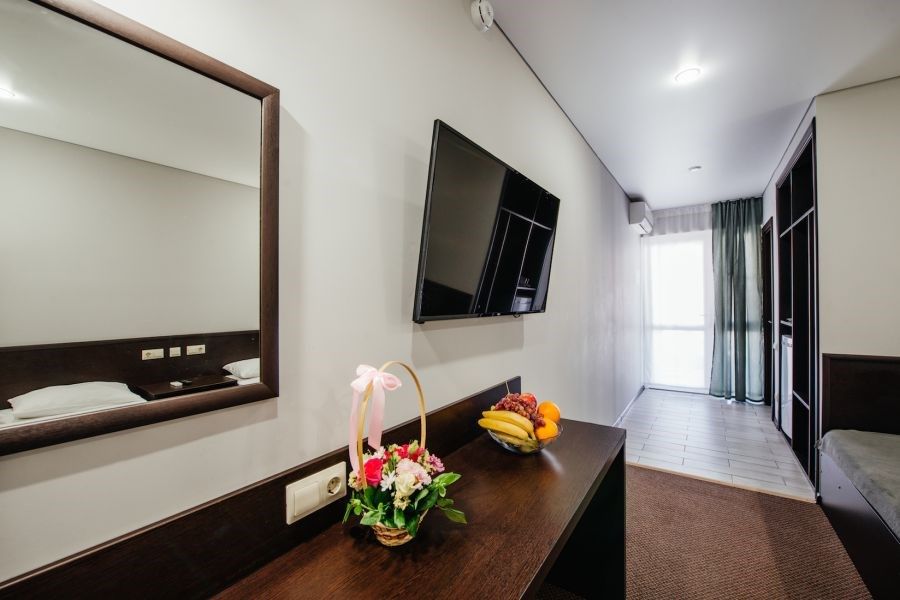 Wi-Fi, холодильник, ванная комната, банные полотенца, сауна, балкон, двуспальная кровать, односпальная кровать, гладильная доска, тумбы, стулья, шкаф для одежды, вешалки, журнальный столик, зеркало, чайник, унитаз, раковина, душ, вид во двор, стол, туалет, сплит-система, принадлежности для барбекю, цифровое тв, телевизор с плоским экраном, вид на горыВ гостиничном номере