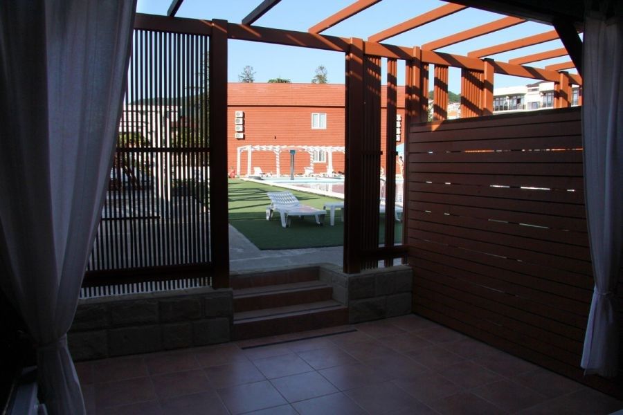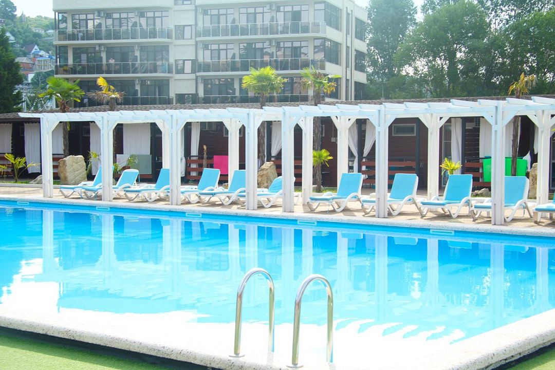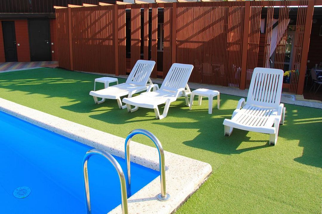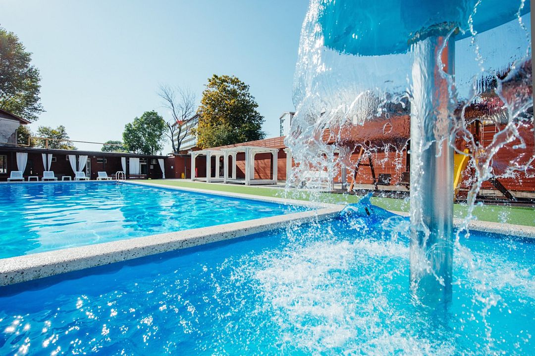 Плавательный с подогревом 24-27С, фонтаном. Грибок и детской зоной для купания. Рядом аэрарий с шезлонгами.