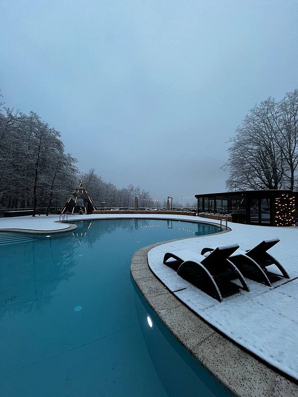 К услугам гостей панорамная сауна с потрясающим видом на горы. Снаружи — открытая веранда с теплым открытым бассейном и джакузи.